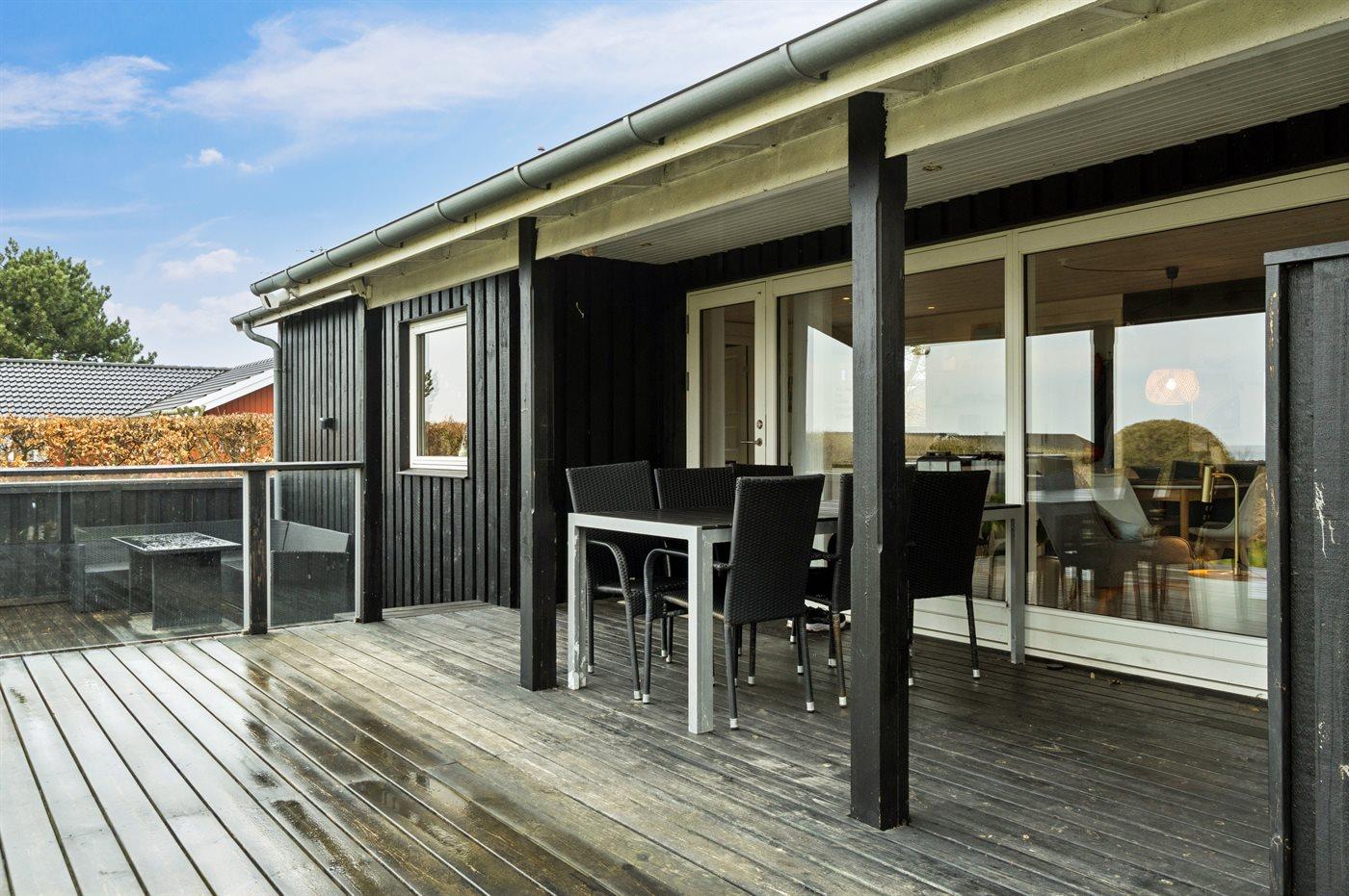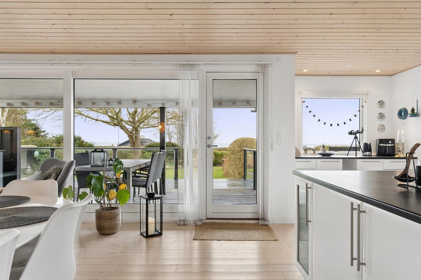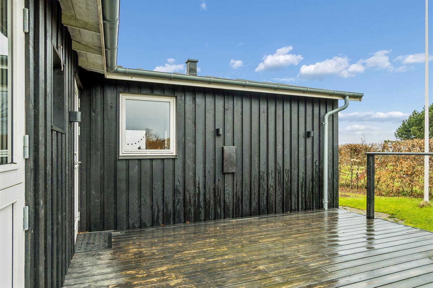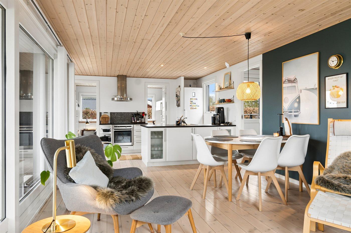 Huset er sommerligt indrettet med et åbent køkkenalrum i forbindelse med stuen, hvor der er udgang til et dejligt terrasseområde, heraf er en del overdækket. På bagsiden af huset er yderligere en terrasse, som er lukket og hvor der tillige er udebruser.