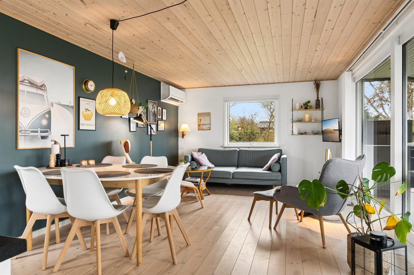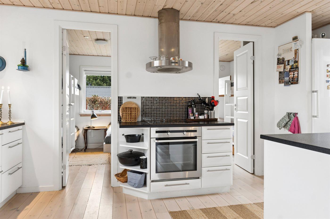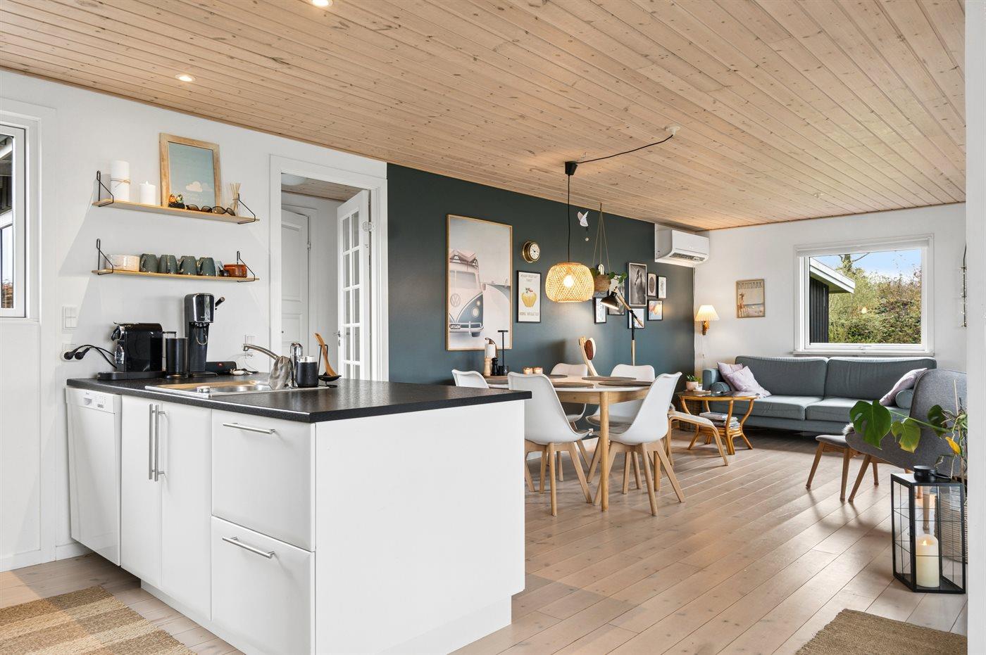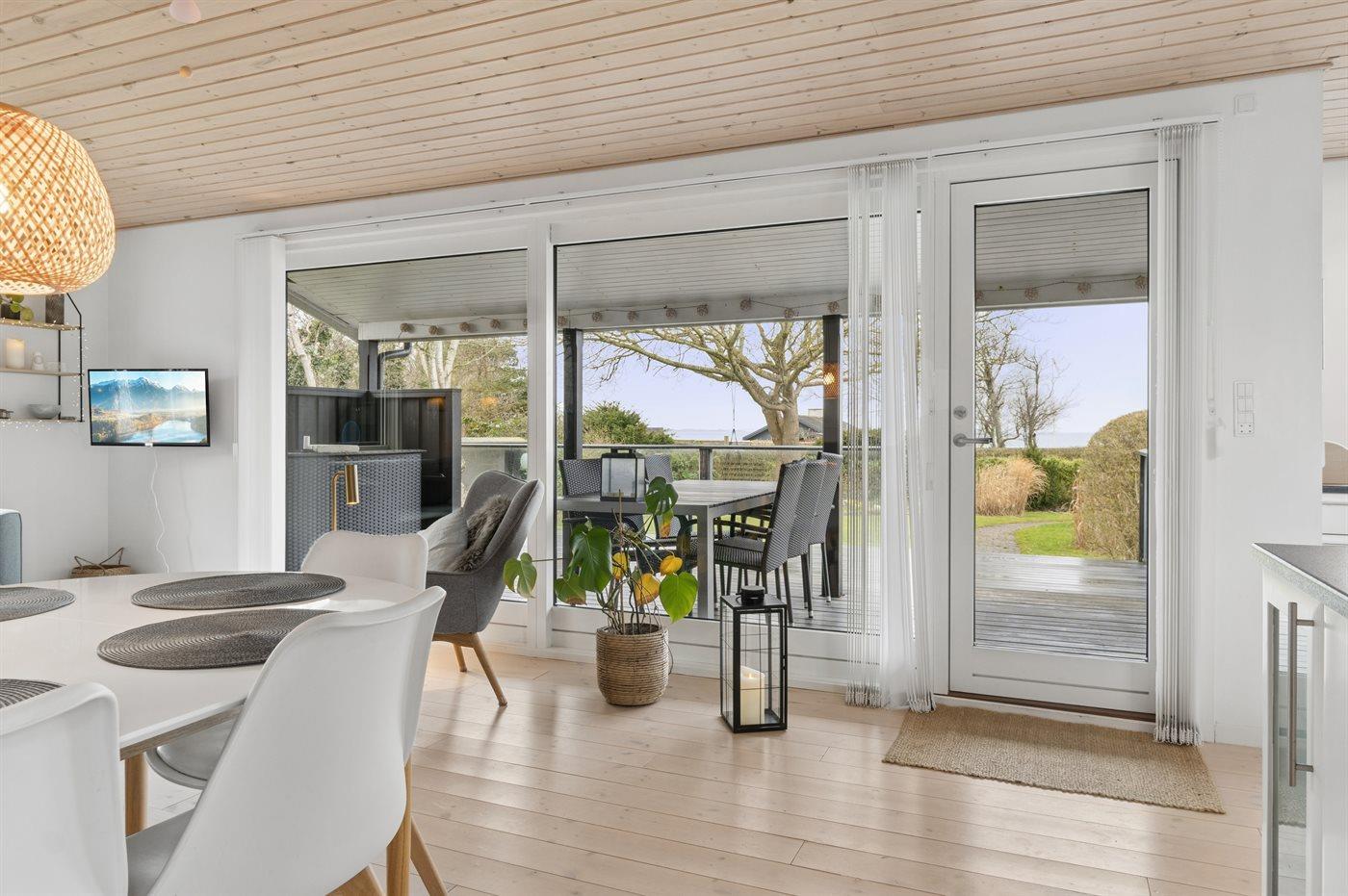 Huset er sommerligt indrettet med et åbent køkkenalrum i forbindelse med stuen, hvor der er udgang til et dejligt terrasseområde, heraf er en del overdækket. På bagsiden af huset er yderligere en terrasse, som er lukket og hvor der tillige er udebruser.