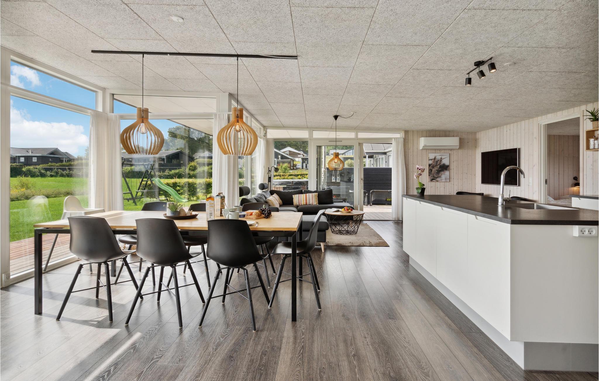 Der hører gode store terrasser til huset, heraf to overdækkede, i to af husets sider, så både morgen- og aftensol kan nydes fra tidligt forår til sent efterår. På begge terrasser er der rigtig gode havemøbler samt solvogne til afslapning. Det store køkkenalrum er familiens samlingspunkt, og forvandler selv regnvejrs dag til en rigtig god feriedag. De store vinduer i køkken og stue giver et dejligt lysindfald, samtidig med at I har en rigtig fin udsigt ud over området. De tre soverum er velindrettede med gode senge. Huset er bygget i kvalitetsmaterialer og der er tænkt på at holde energiforbruget så lavt som overhovedet muligt bl.a. med varmepumpe.