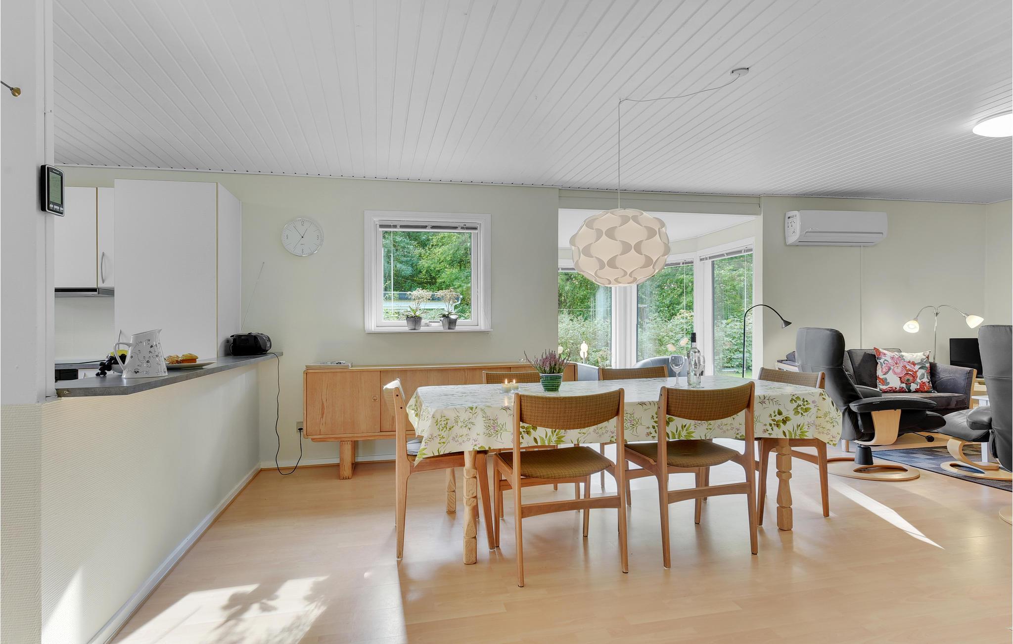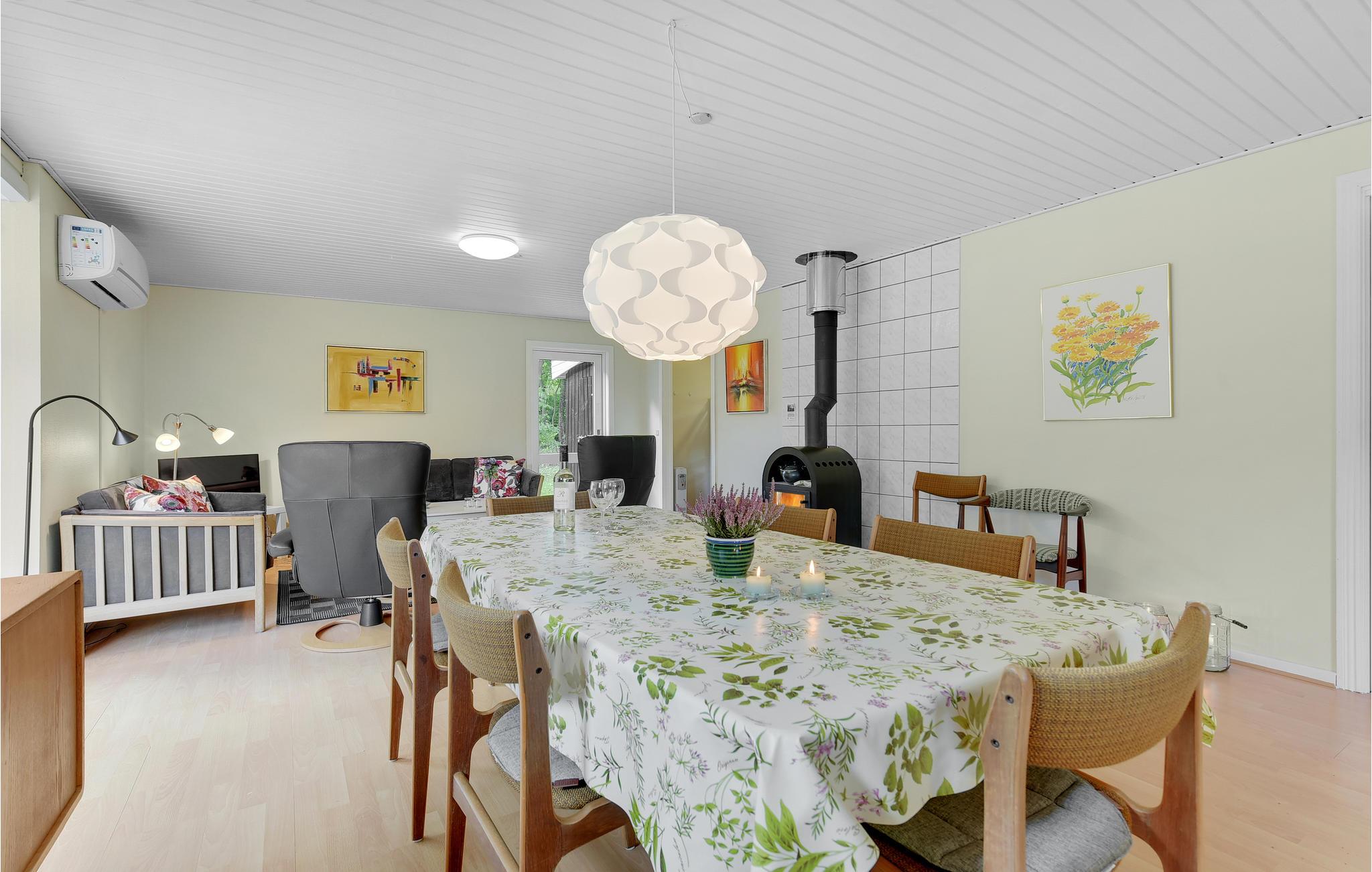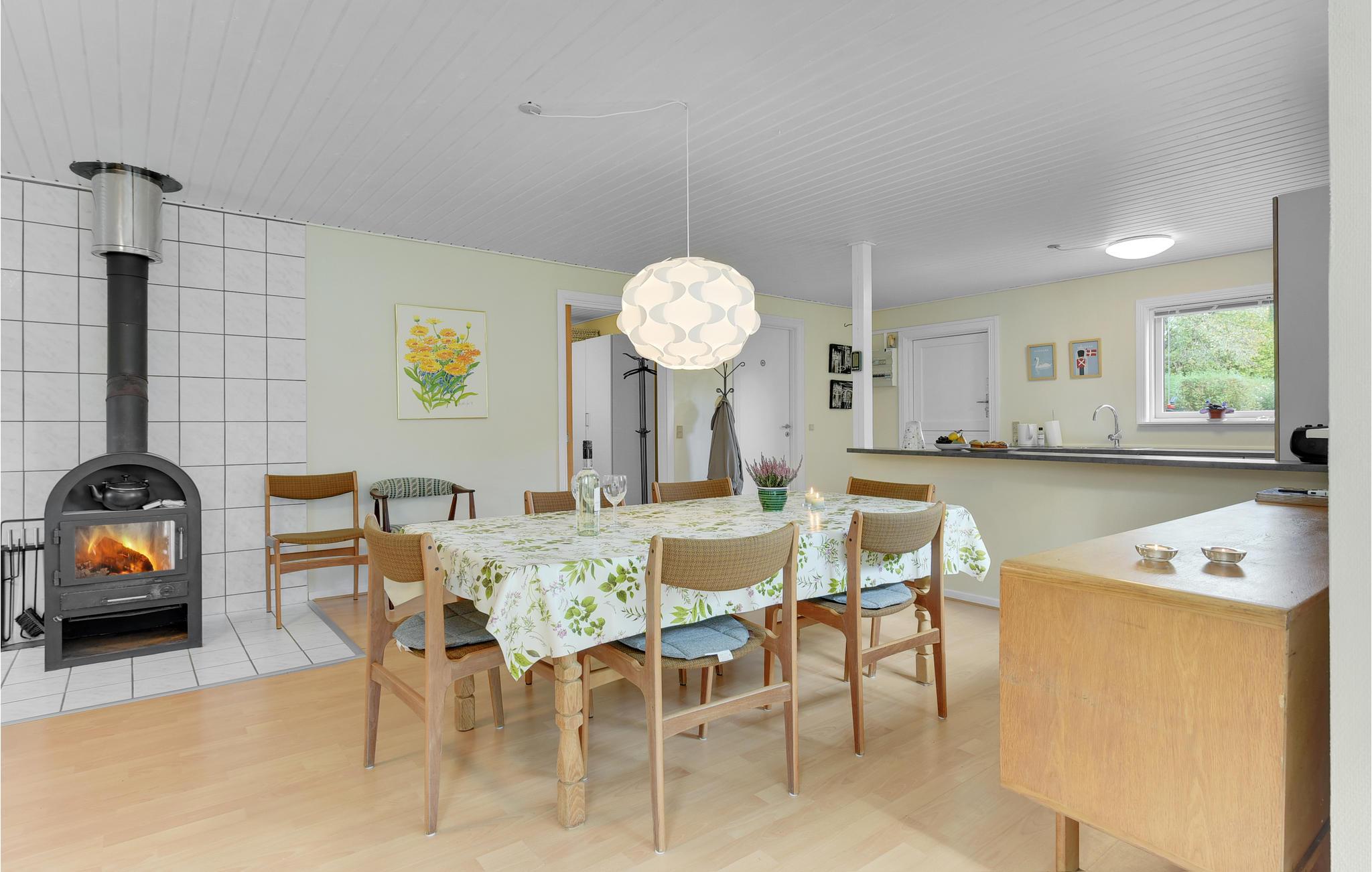 Huset har et dejligt stort køkken-alrum. Rundt om spisebordet er der god plads til, at alle kan sidde godt og nyde maden. Stuen har endvidere en hyggelig sofaafdeling med kig til brændeovnen. Huset opvarmes billigt med varmepumpen.
