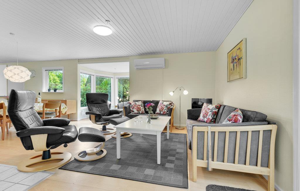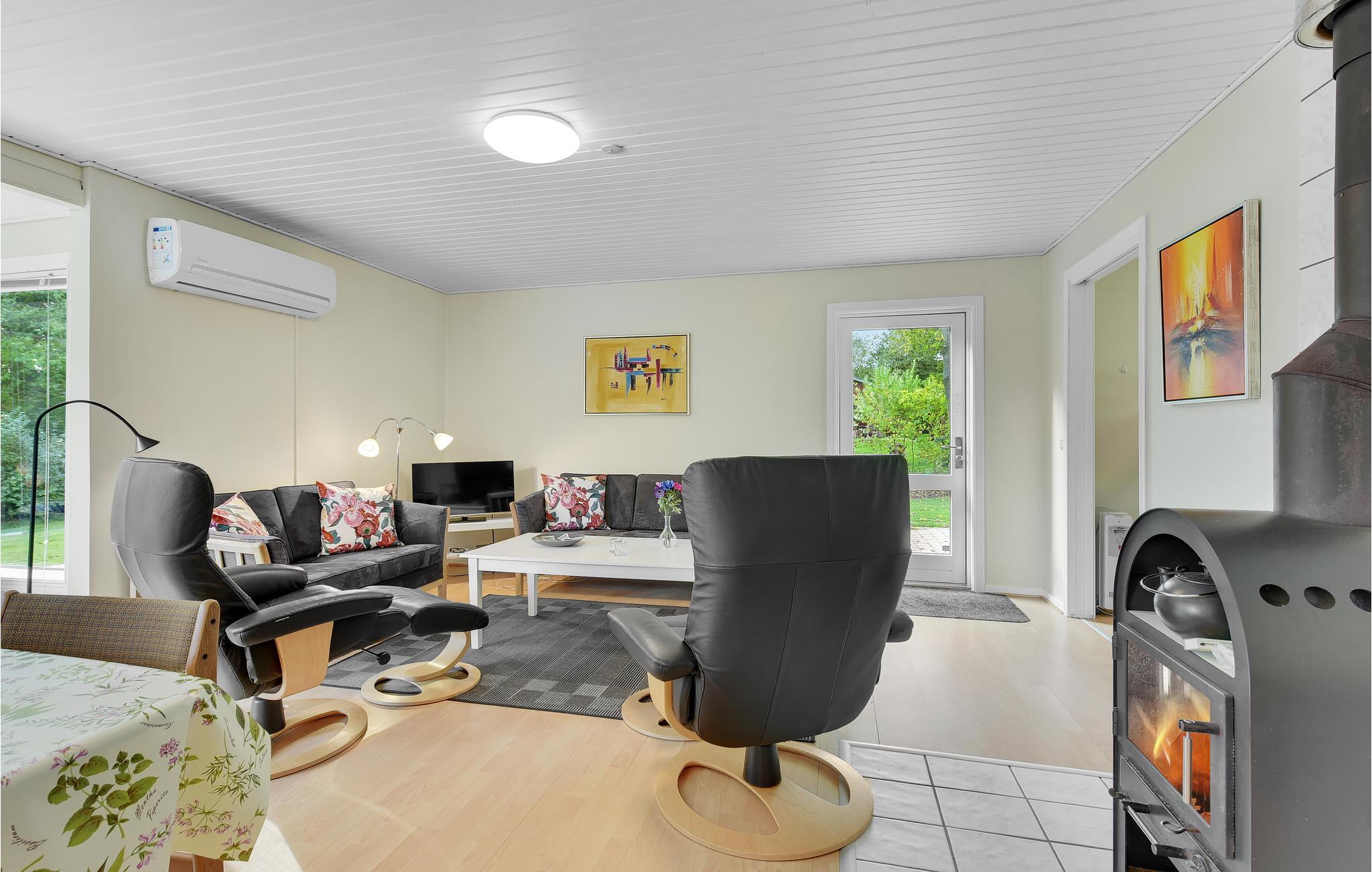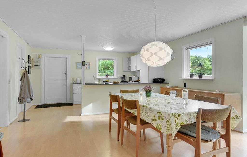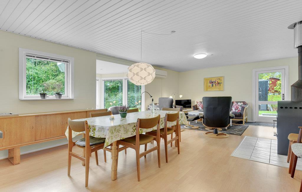 Huset har et dejligt stort køkken-alrum. Rundt om spisebordet er der god plads til, at alle kan sidde godt og nyde maden. Stuen har endvidere en hyggelig sofaafdeling med kig til brændeovnen. Huset opvarmes billigt med varmepumpen.