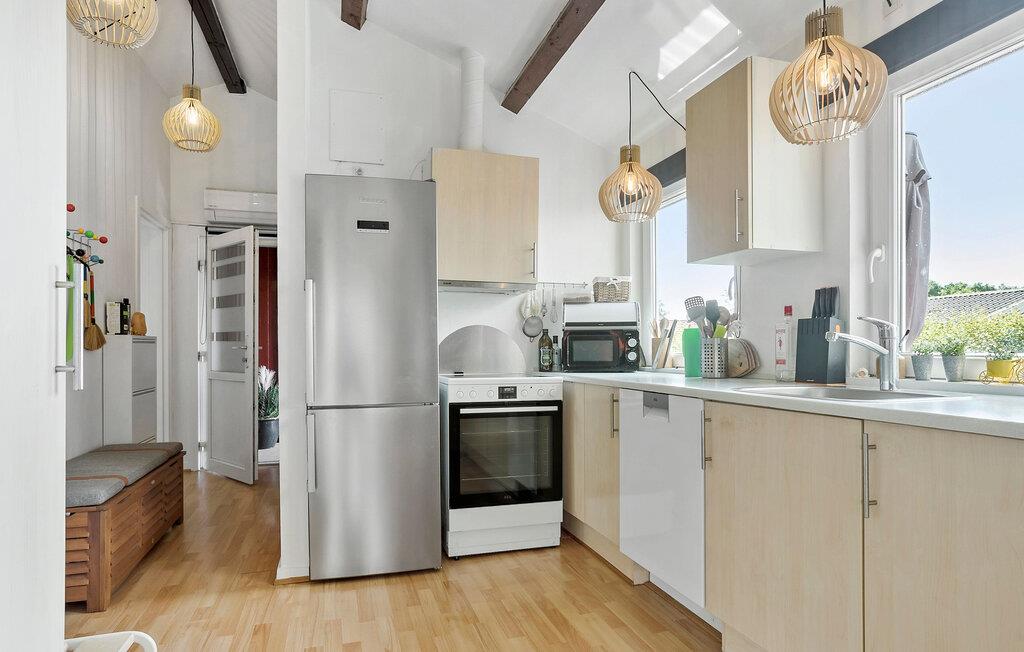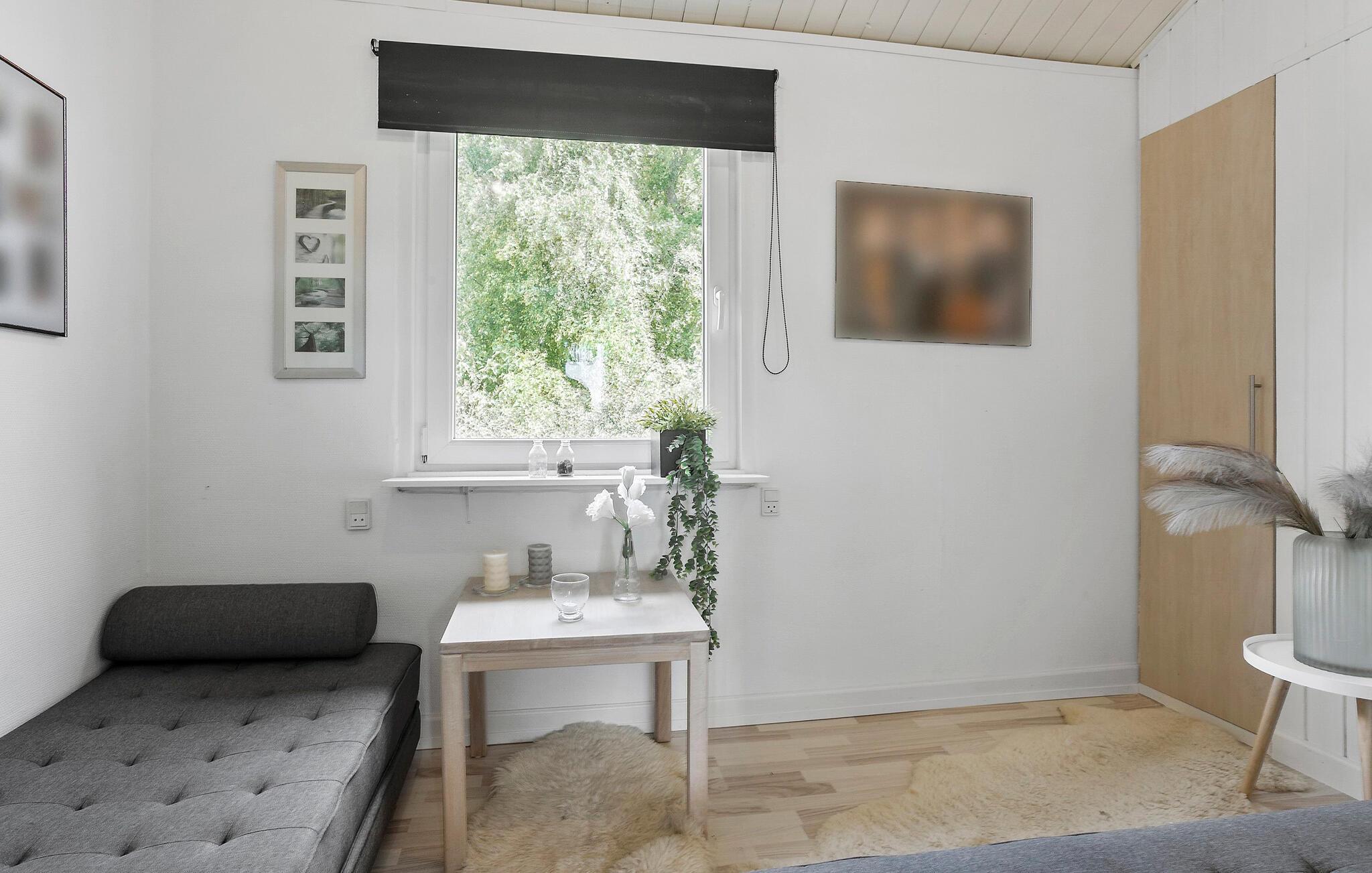 Så snart I træder ind, sørger dette indbydende feriehus for, at der opstår ægte feriestemning. Den lyse opholdsstue med store vinduer og et rummeligt køkken danner den ideelle ramme for fælles stunder, hvad enten det er med madlavning, spil eller hyggeligt samvær. Ved spisebordet er der plads til hele familien til at nyde måltider i godt selskab. Hyg jer sammen i sofaen eller lænestolene, se en film, spil kort, eller lad blikket glide ud over haven.