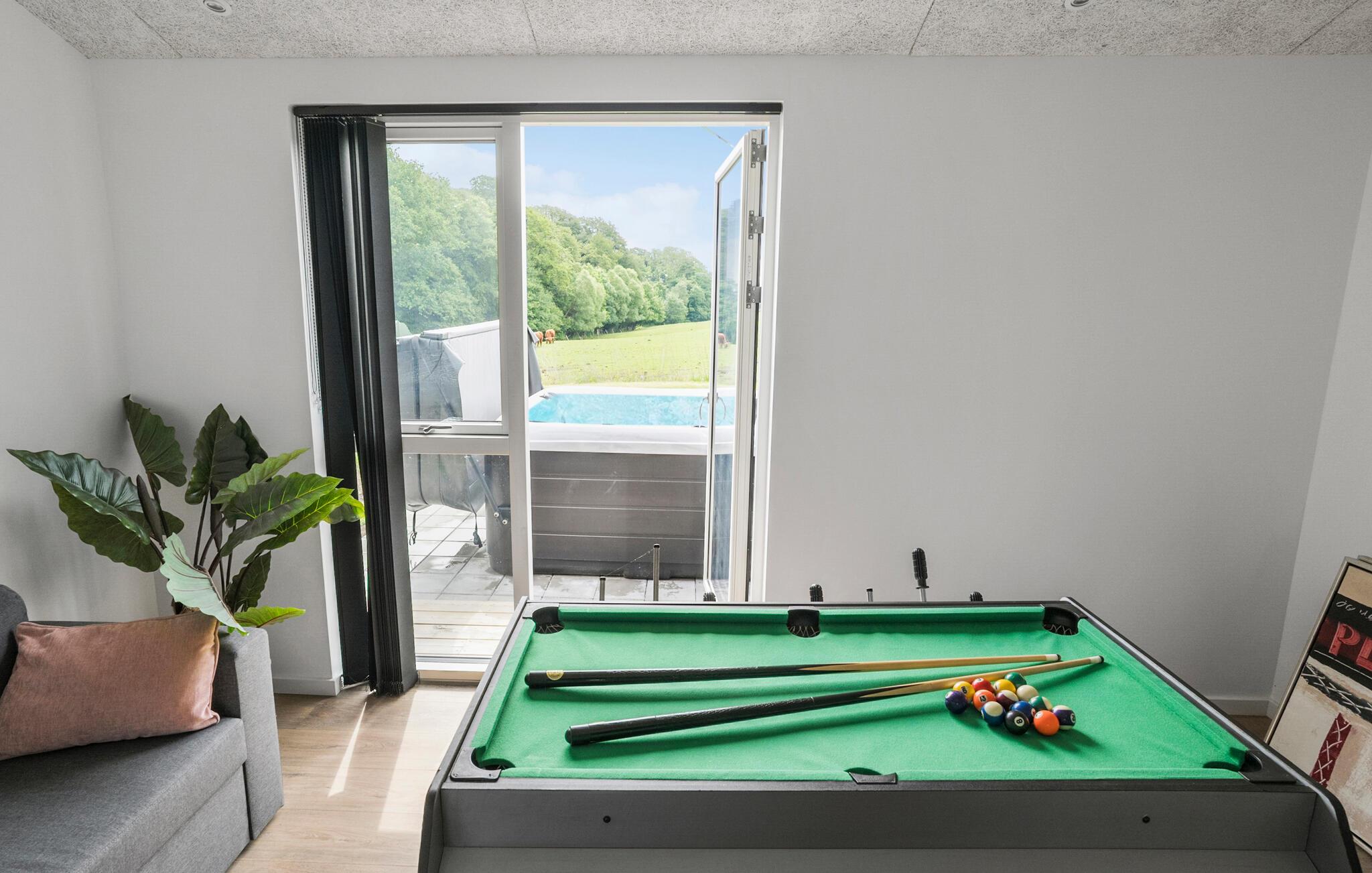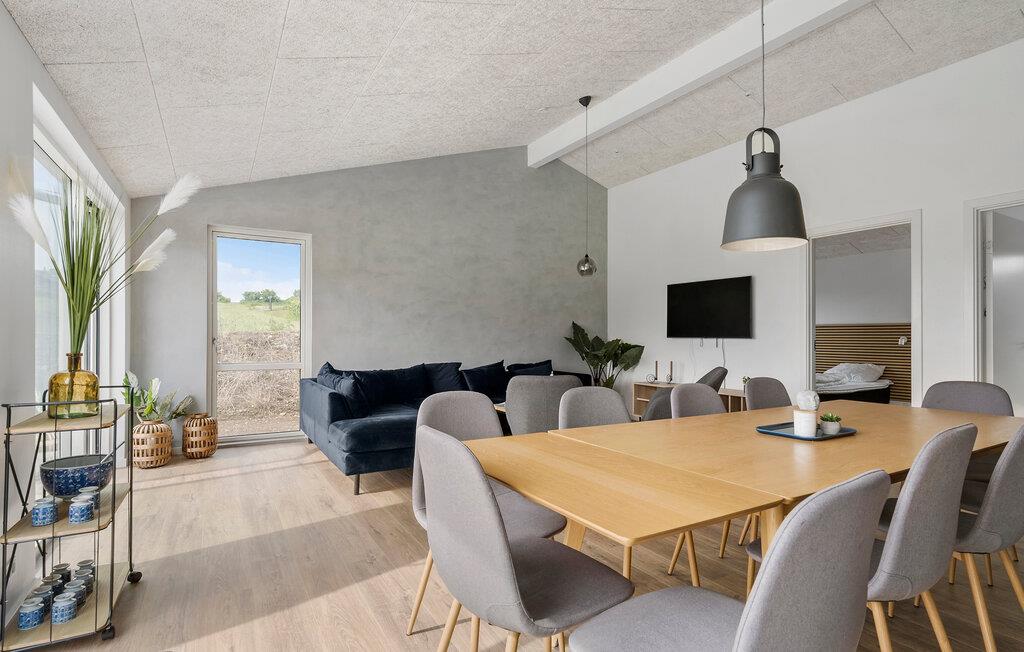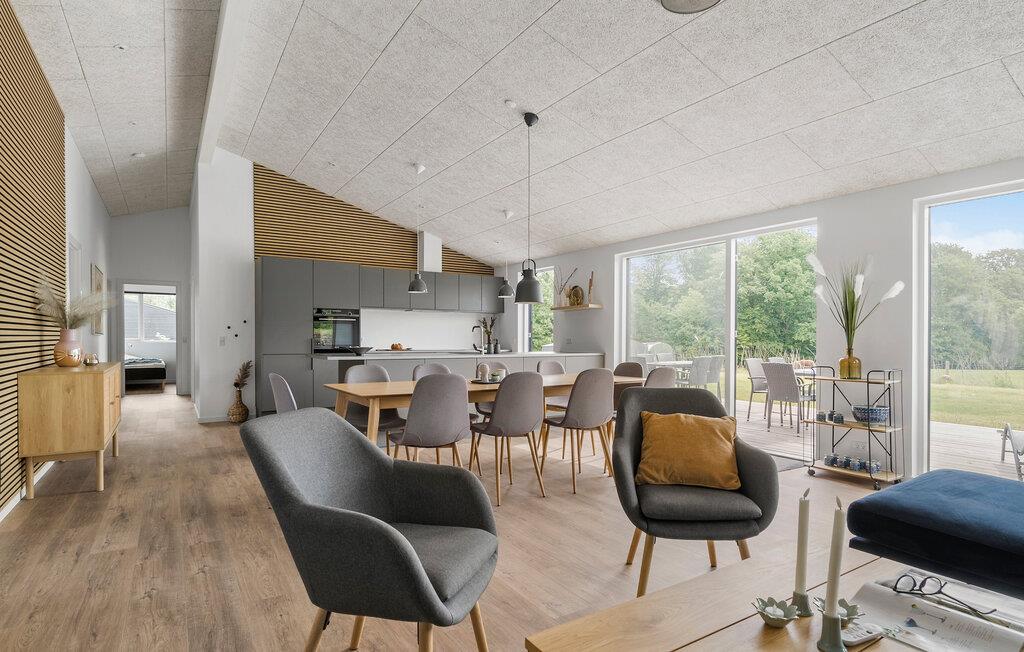 Velkommen til dette moderne hus, der ligger i fredelige omgivelser ved Kelstrup Strand, og hvor I får godt med plads og faciliteter til en ferie med den store familie på tværs af generationerne. Huset er virkelig flot indrettet med materialer af høj kvalitet, komfortable møbler og et fuldt udstyret køkken, hvor familiens kokke kan tage sig god tid og kræse om livretterne. Det åbne køkken-alrum får vidunderlige lysindfald gennem de store vinduespartier, der samtidig giver en dejlig udsigt til det grønne. En udsigt, I kan nyde, mens I hygger med madlavningen, med måltiderne ved det lange spisebord og en sjov filmaften i sofahjørnet. Og måske I skal forkæle jer selv med lidt god wellness i saunaen eller spabadet?