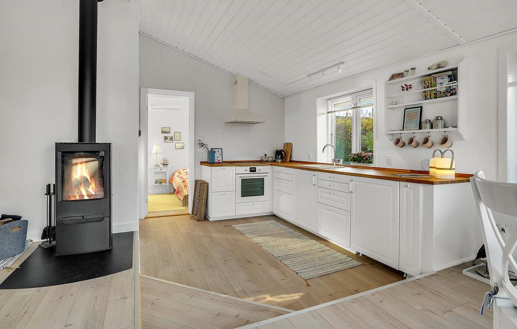 Dette feriehus i Kelstrup Strand har en attraktiv beliggenhed kun 100 meter fra vandet. Indenfor er der lyst og venligt, og den gennemtænkte indretning giver et varmt udtryk og indbyder til afslappende feriedage med dem, I holder af. I den oplyste stue kan I tilbringe hyggelige timer med at spille brætspil eller at læse jeres yndlingsbog. I den kølige årstid kan I varme jer med en kop kakao, mens brændeovnen spreder endnu mere hygge. Tilbring solrige timer på den veludstyrede terrasse, der snor sig rundt om huset, og afslut senere en smuk dag med udsigt over vandet og solnedgangen. På varme sommerdage kan I pakke strandkurven og spadsere ned til den dejlige sandstrand med badebro. Året rundt kan I mærke roen og vinden i håret på dejlige gåture.