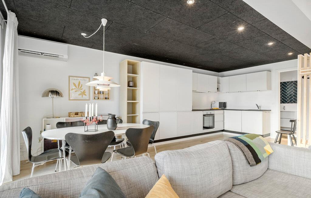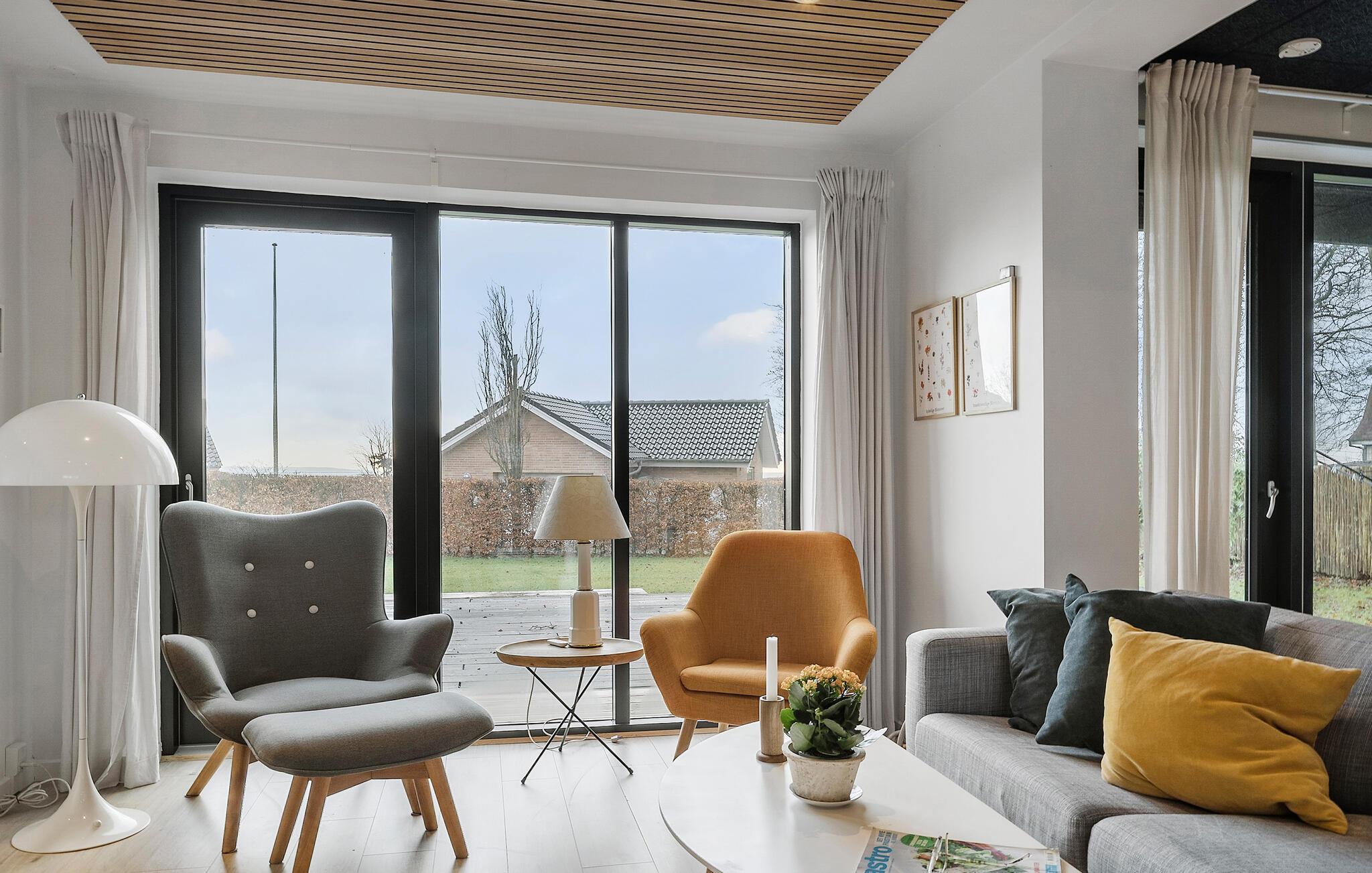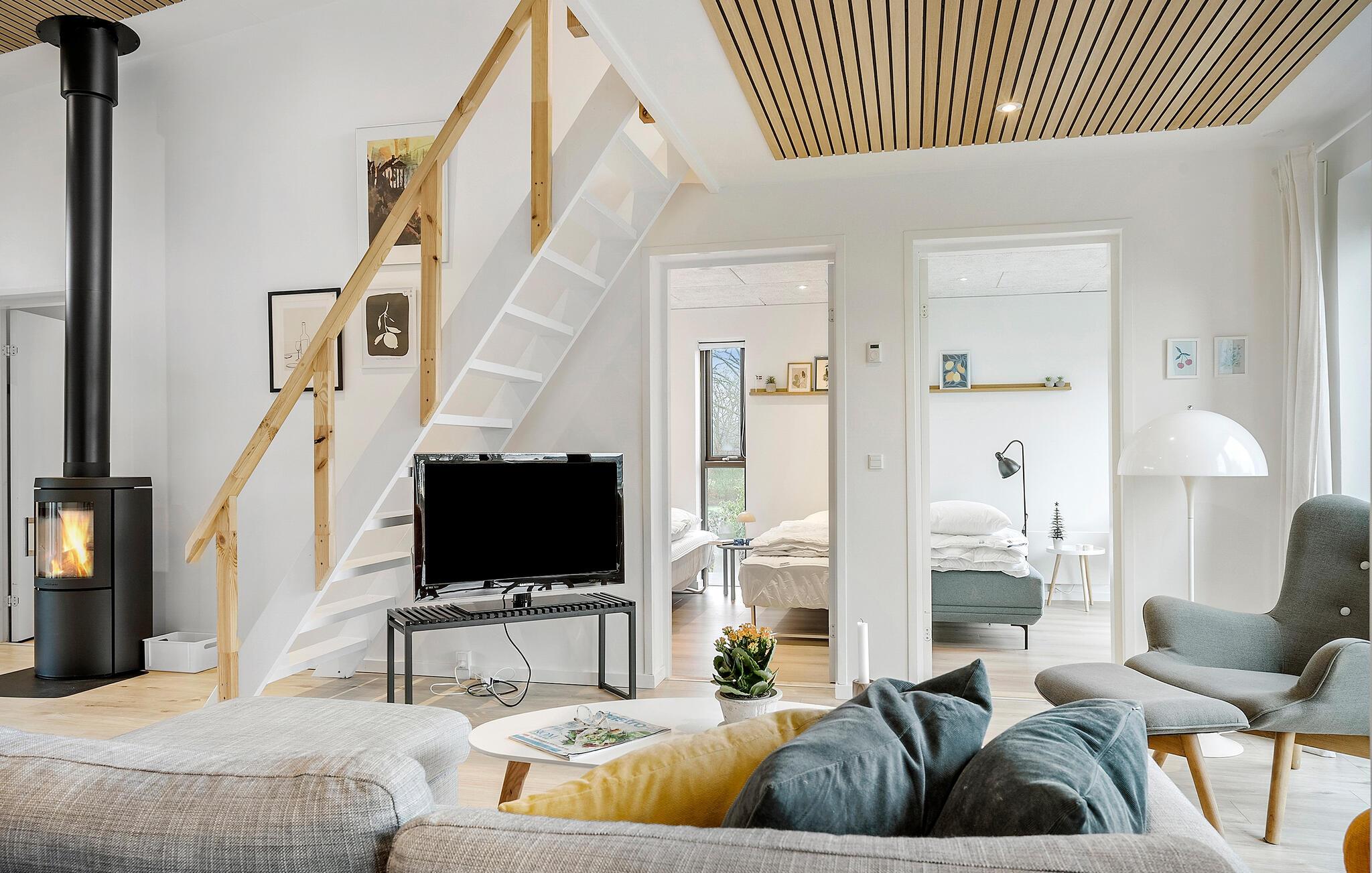 Kom ind og nyd det åbne design i to plan, som skaber en rummelig følelse, der suppleres af høj kvalitet og smagfulde indretningsløsninger. I opholdsrummet sørger brændeovnen for hyggelig varme og ekstra stemning. De store vinduespartier lukker masser af naturligt lys ind og sørger for en smuk udsigt over haven. Den store terrasse lægger op til at nyde en frisk havbrise, mens stranden kun ligger en kort gåtur væk.