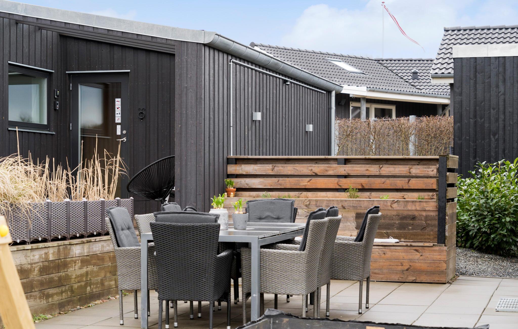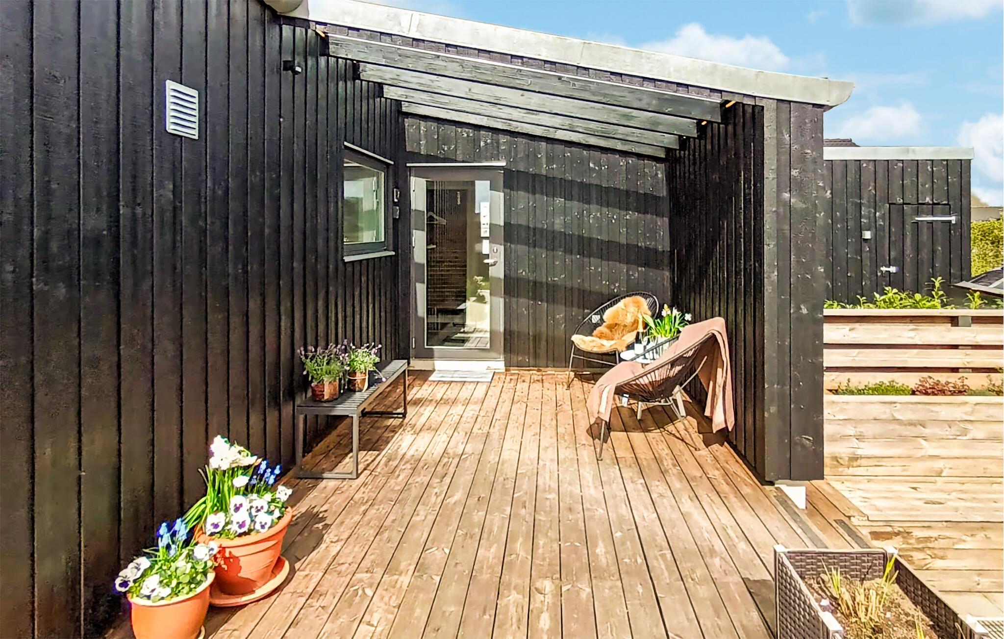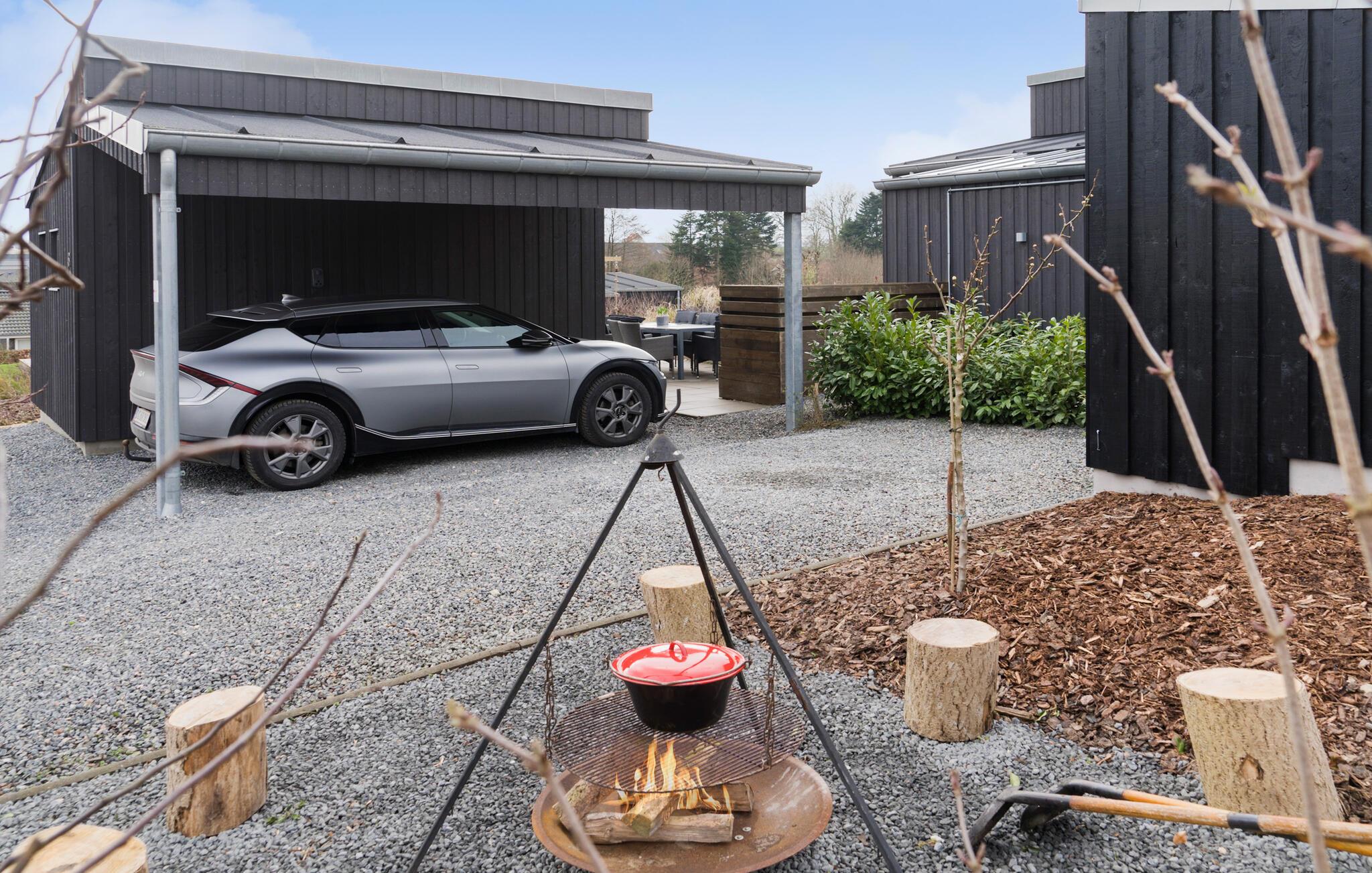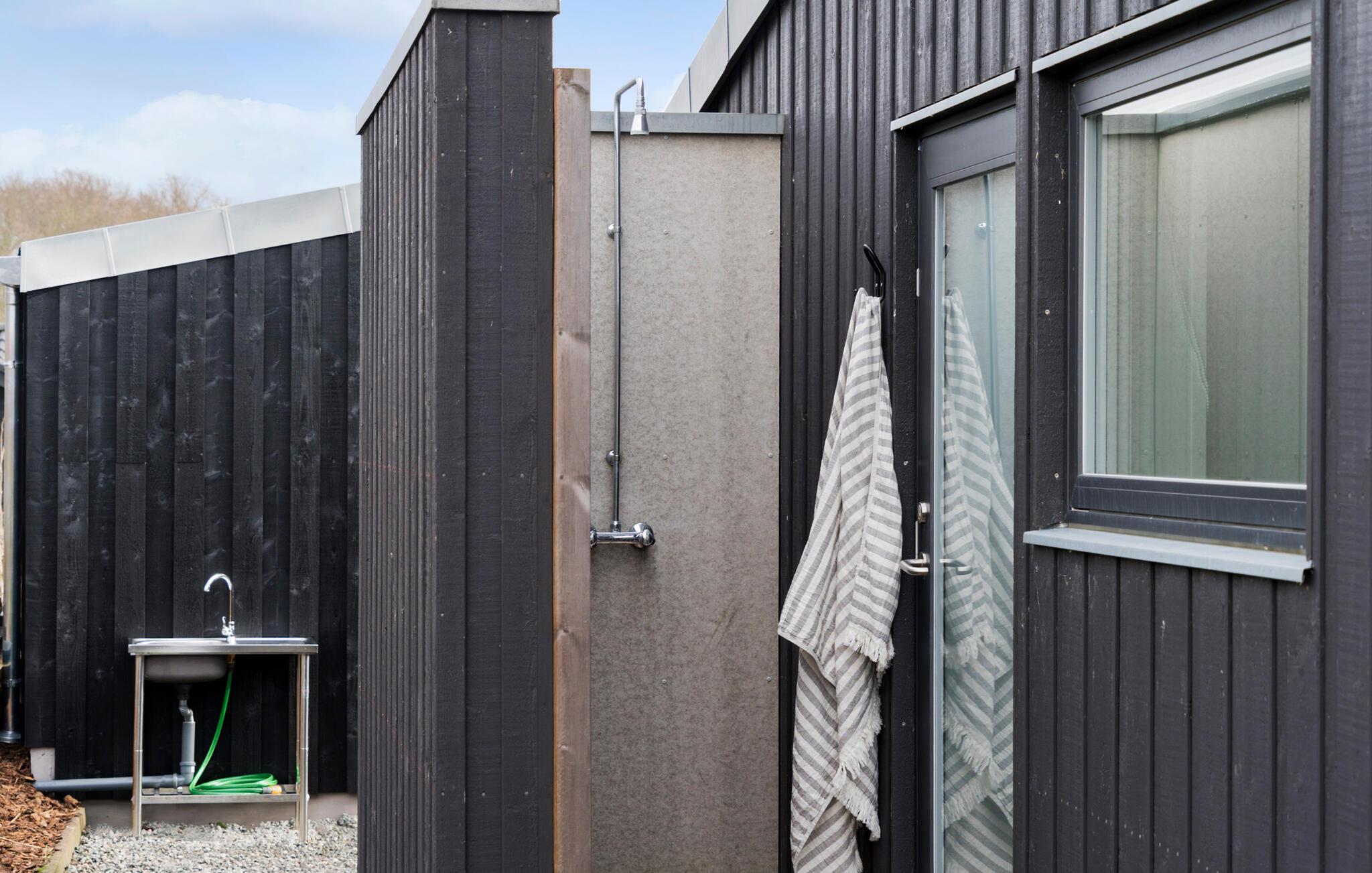 Udeområdet er tilsvarende dejligt med store terrasser, der går rundt om huset, så I kan finde sol, skygge og læ efter behov. Sæt jer godt til rette med en kop kaffe og et krydsord, mens børnene løber rundt og leger på deres helt egen legeplads. Hvis varmen er ved at få jer, kan I tage en skyller under udebruseren, og ud på eftermiddagen kan I tilberede familiens livretter på grillen. Lad en smuk sommerdag gå på hæld ved bålpladsen eller i det udendørs spabad, mens I lægger planer for de kommende dage.
