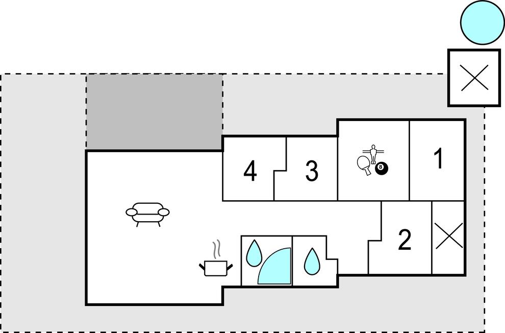 Den store terrasse er perfekt til solbadning eller måltider under åben himmel, og i haven er der god plads til børnene. Om aftenen samles familien omkring bålpladsen for at nyde hyggelige timer sammen. Efter dagens program er det også skønt at have muligheden for at synke ned i havens vildmarksbad og nyde den friske luft, mens I sidder i det lune vand.