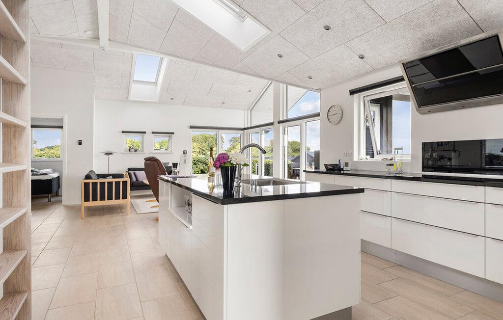 Velkommen til dette lyse hus med store vinduer. Her venter der en skøn ro og elegante indretningsløsninger. Stuen er hyggeligt indrettet og lægger op til en rolig stund i sofaen eller et fælles brætspil, mens andre laver mad i køkkenet. I saunaen er der mulighed for at få varmen og slappe ekstra godt af.