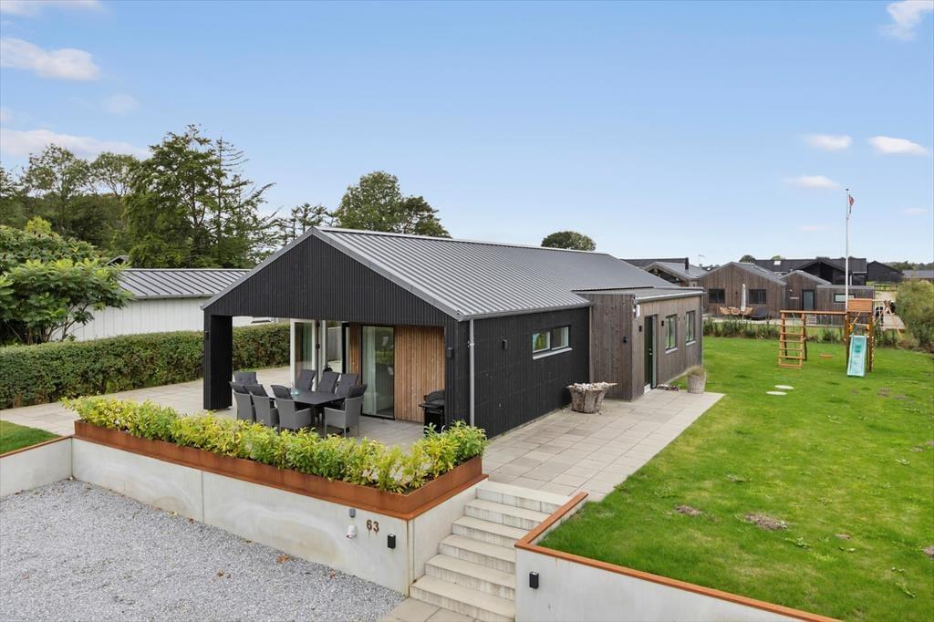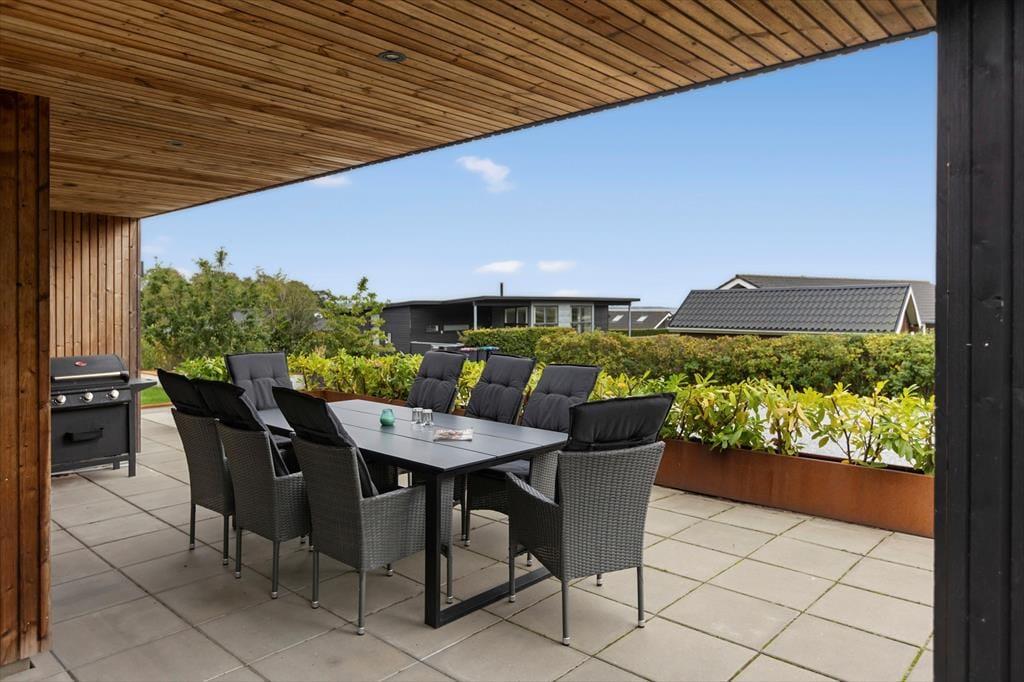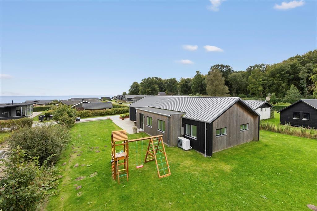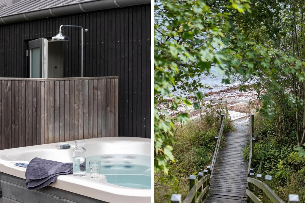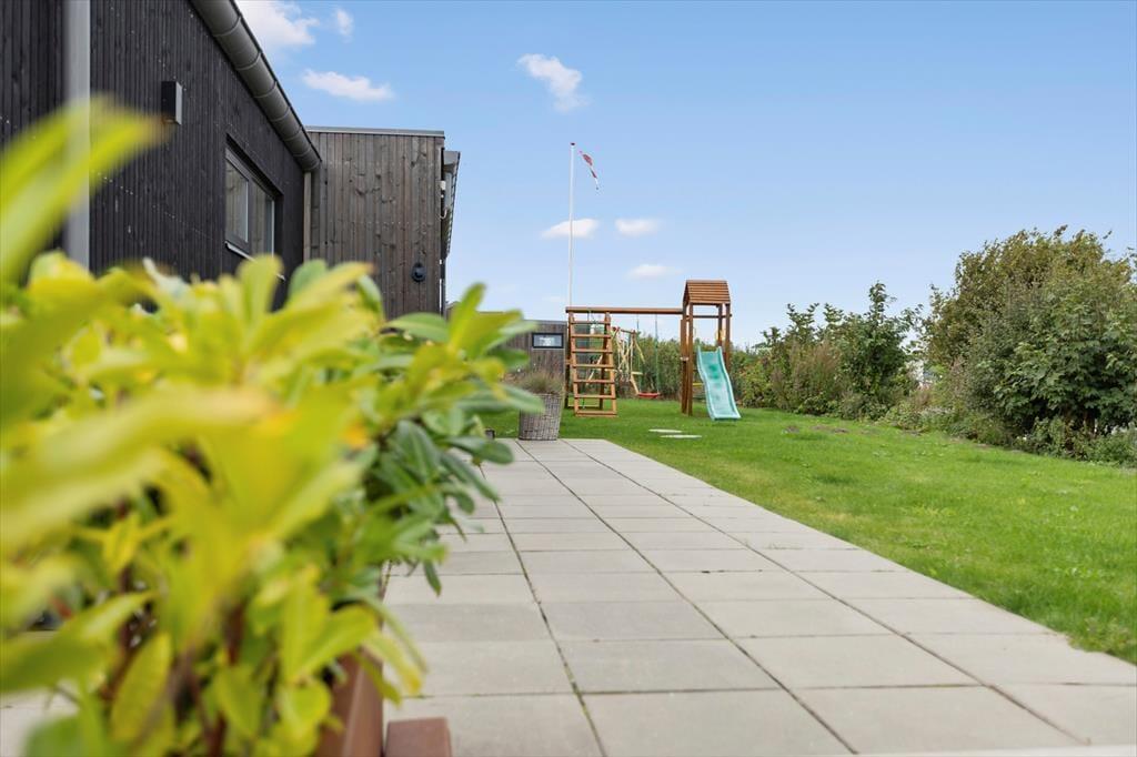 Udelivet i dette sommerhus er noget helt særligt. På terassen venter den lækre udespa – perfekt til afslapning efter en lang dag, hvor du kan synke ned i det varme vand og lade tankerne flyde under åben himmel. Vil du skylle dig efter en tur i spaen, kan du benytte den udendørs bruser og fortsætte følelsen af luksus i det fri. På den store terrasse kan du dække op til måltider i solen eller nyde en stille stund med en god bog i læ for vinden. Her er også god plads til leg, og børnene vil elske den hyggelige gynge med rutchebane – et lille frirum, hvor fantasien kan få frit spil. Det grønne udemiljø gør haven til et sikkert og roligt sted for hele familien.