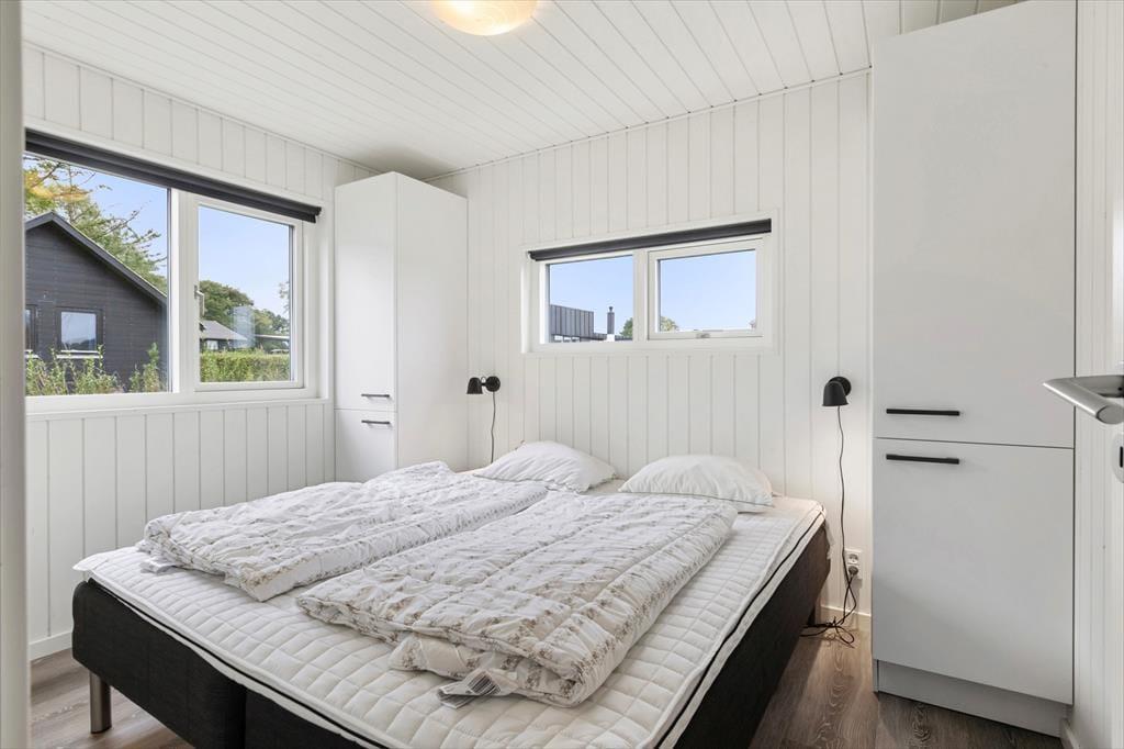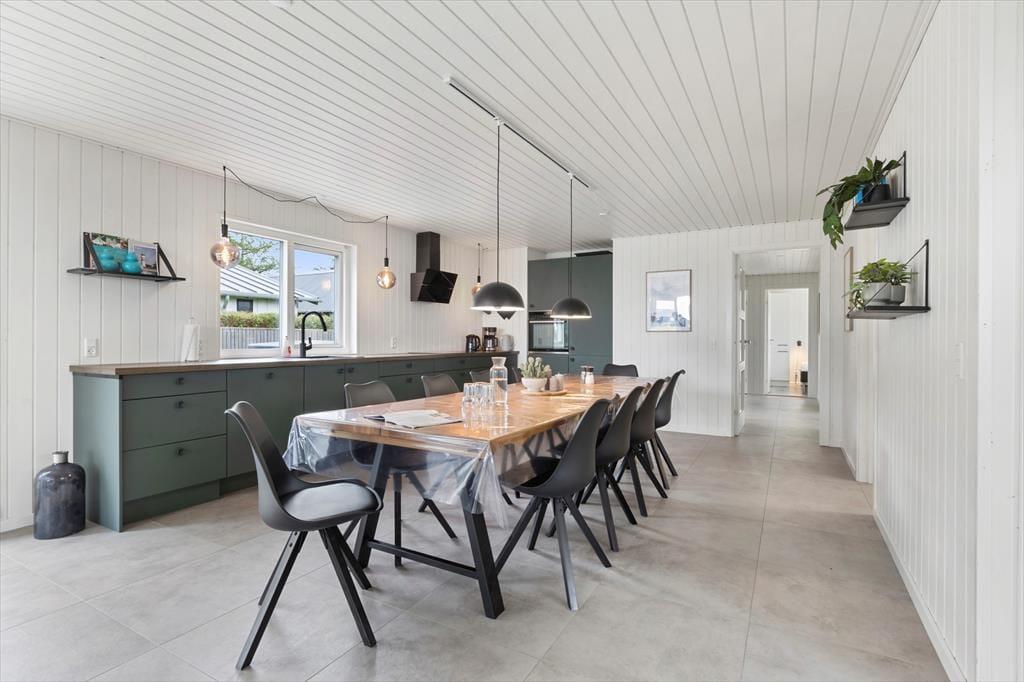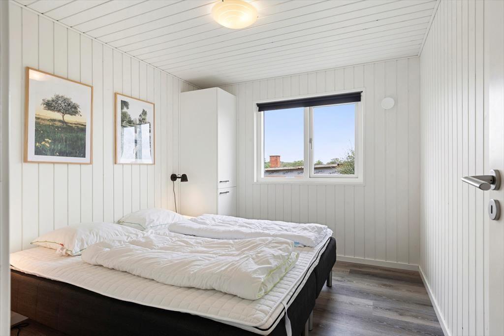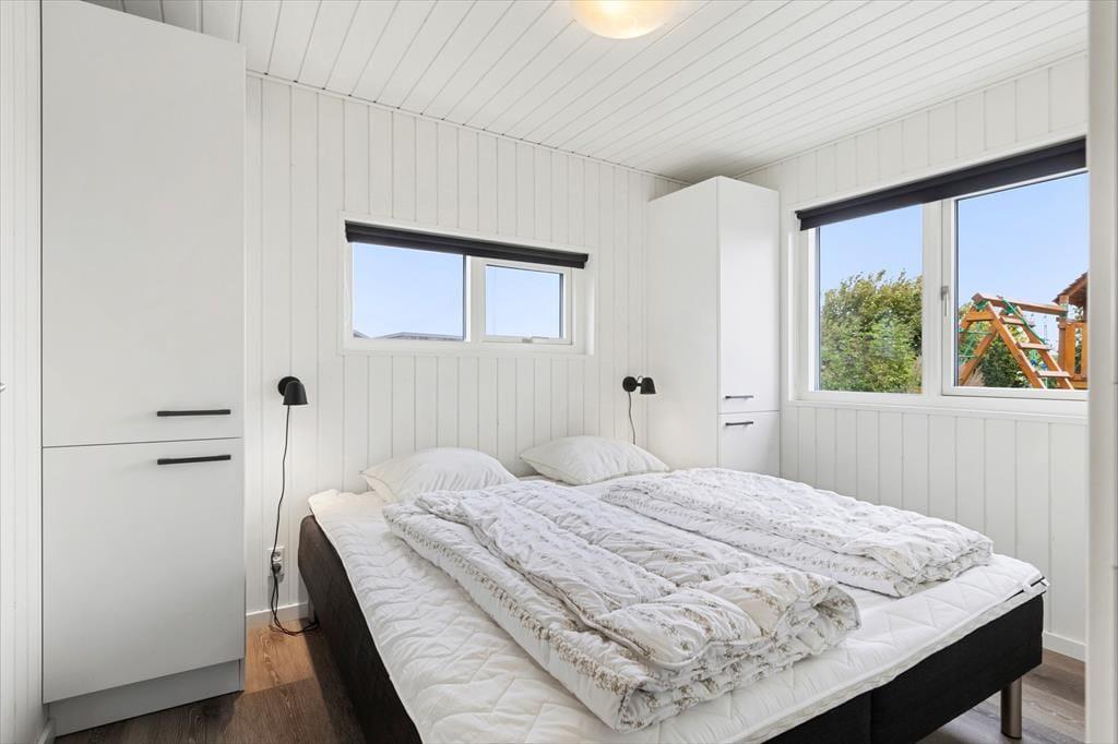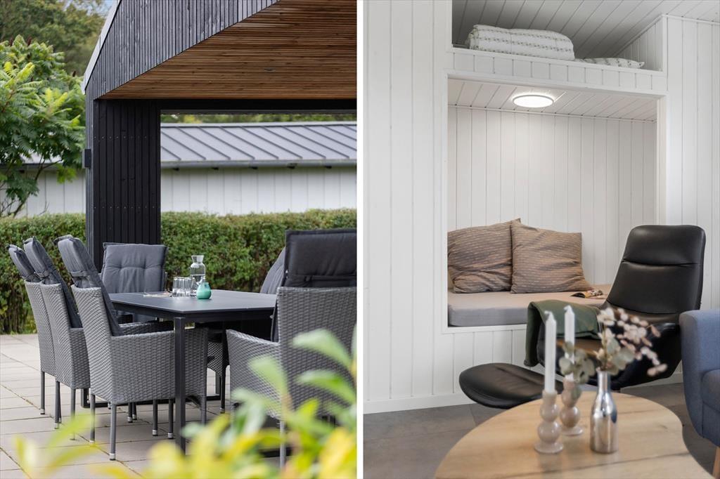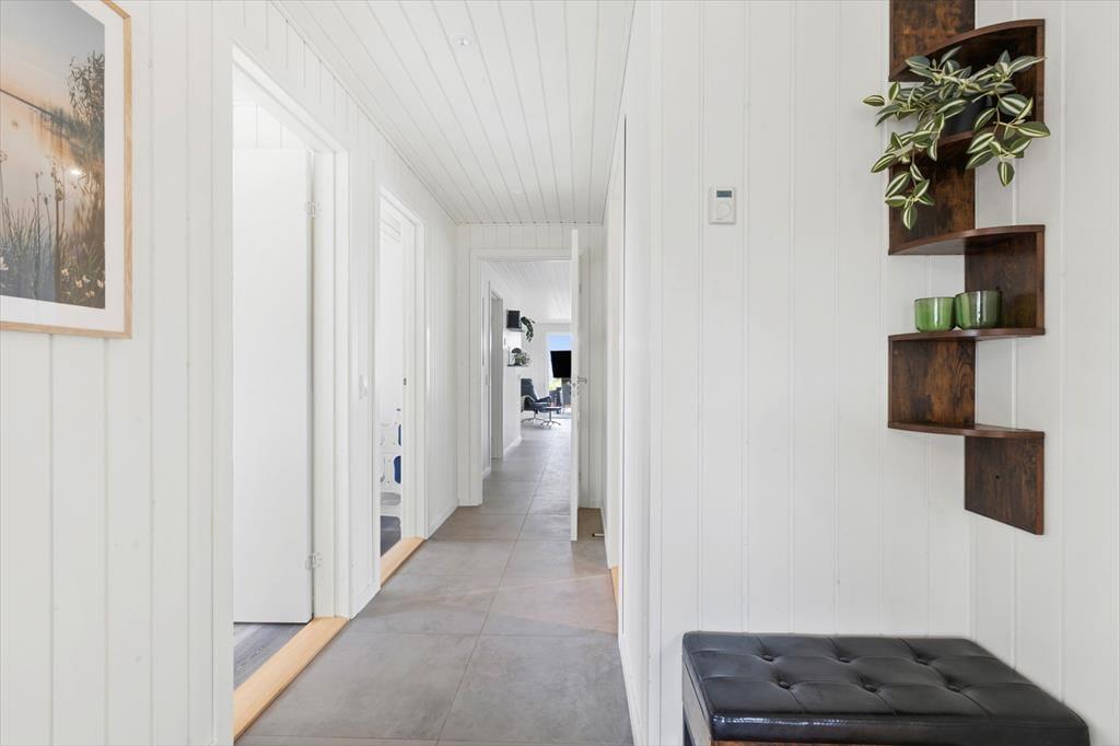 Allerede når du træder ind i sommerhuset, fornemmer du den lyse og venlige atmosfære, der præger hele indretningen. Det åbne opholdsrum samler køkken, spiseplads og stue i ét, så du altid kan være sammen med dine nærmeste – uanset om der kokkereres, spilles spil eller slappes af i sofaen. Her er der plads til både latter og langsom morgenkaffe, mens lyset strømmer ind gennem de store vinduespartier og giver kig til haven udenfor. De rummelige soveværelser er indrettet med ro og komfort for øje, så I kan vågne veludhvilede hver dag. To flotte badeværelser sikrer god plads og fleksibilitet – og fra det ene har du direkte adgang til det udvendige wellness område samt husets vaskesøjle, som gør det nemt at holde styr på ferietøjet efter en dag på stranden eller en tur i spaen.