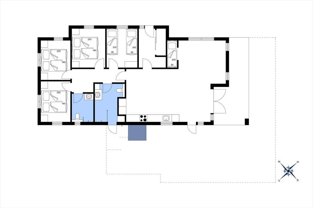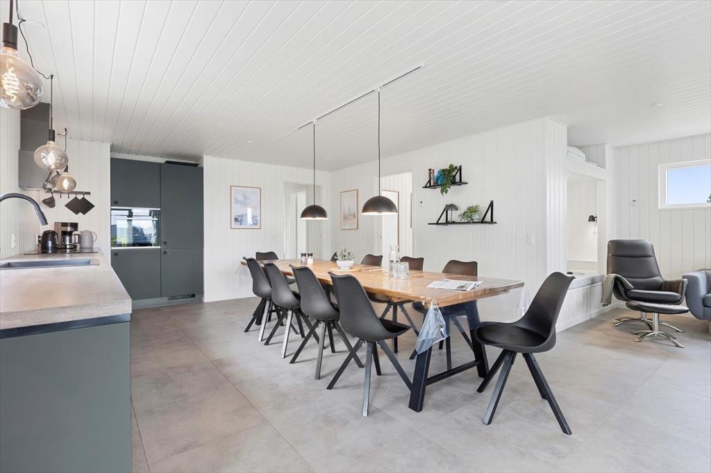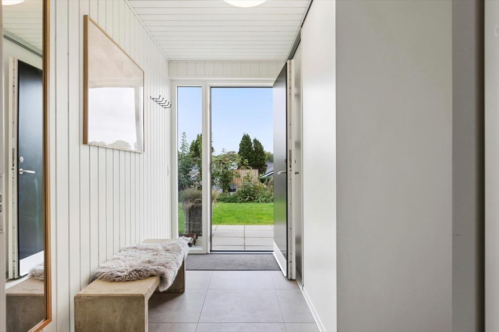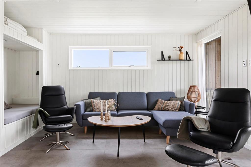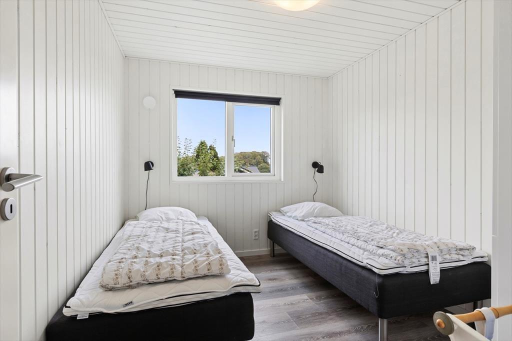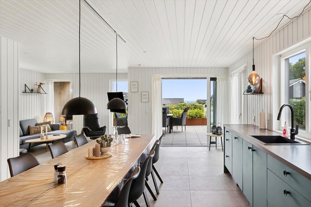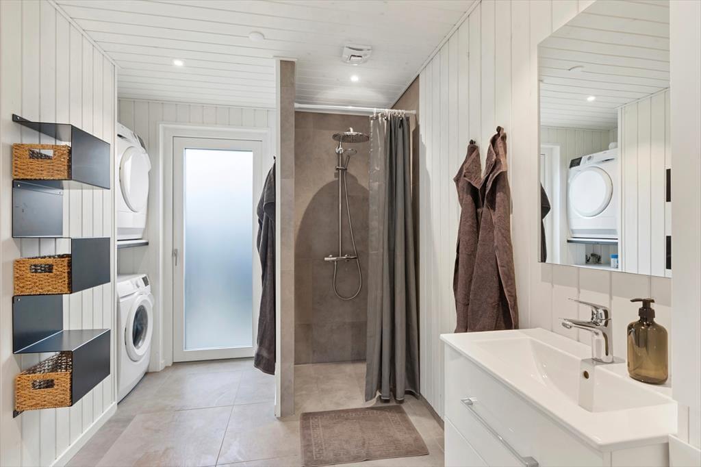 Allerede når du træder ind i sommerhuset, fornemmer du den lyse og venlige atmosfære, der præger hele indretningen. Det åbne opholdsrum samler køkken, spiseplads og stue i ét, så du altid kan være sammen med dine nærmeste – uanset om der kokkereres, spilles spil eller slappes af i sofaen. Her er der plads til både latter og langsom morgenkaffe, mens lyset strømmer ind gennem de store vinduespartier og giver kig til haven udenfor. De rummelige soveværelser er indrettet med ro og komfort for øje, så I kan vågne veludhvilede hver dag. To flotte badeværelser sikrer god plads og fleksibilitet – og fra det ene har du direkte adgang til det udvendige wellness område samt husets vaskesøjle, som gør det nemt at holde styr på ferietøjet efter en dag på stranden eller en tur i spaen.
