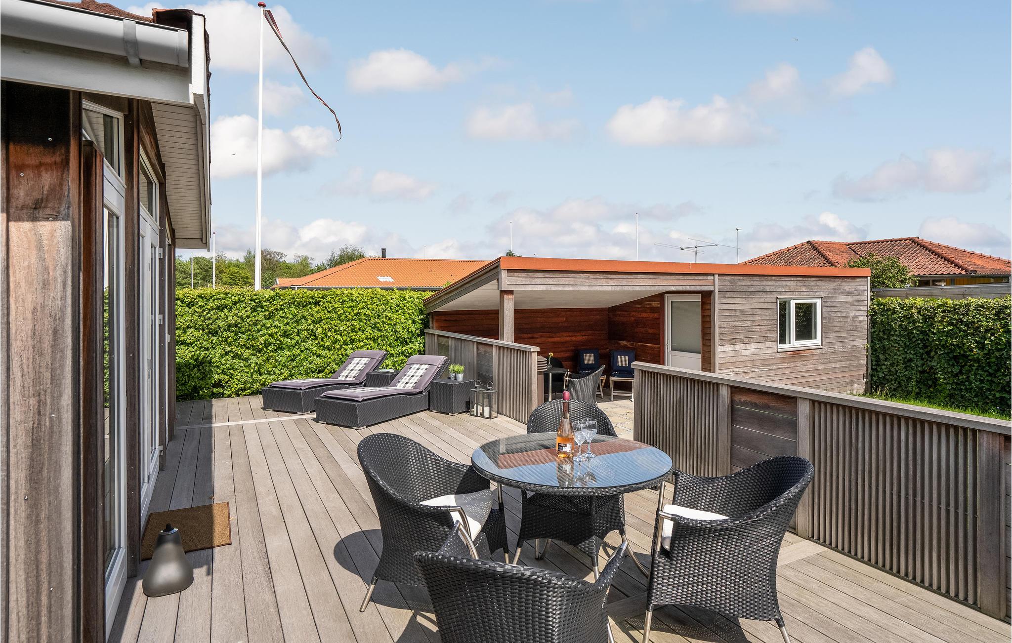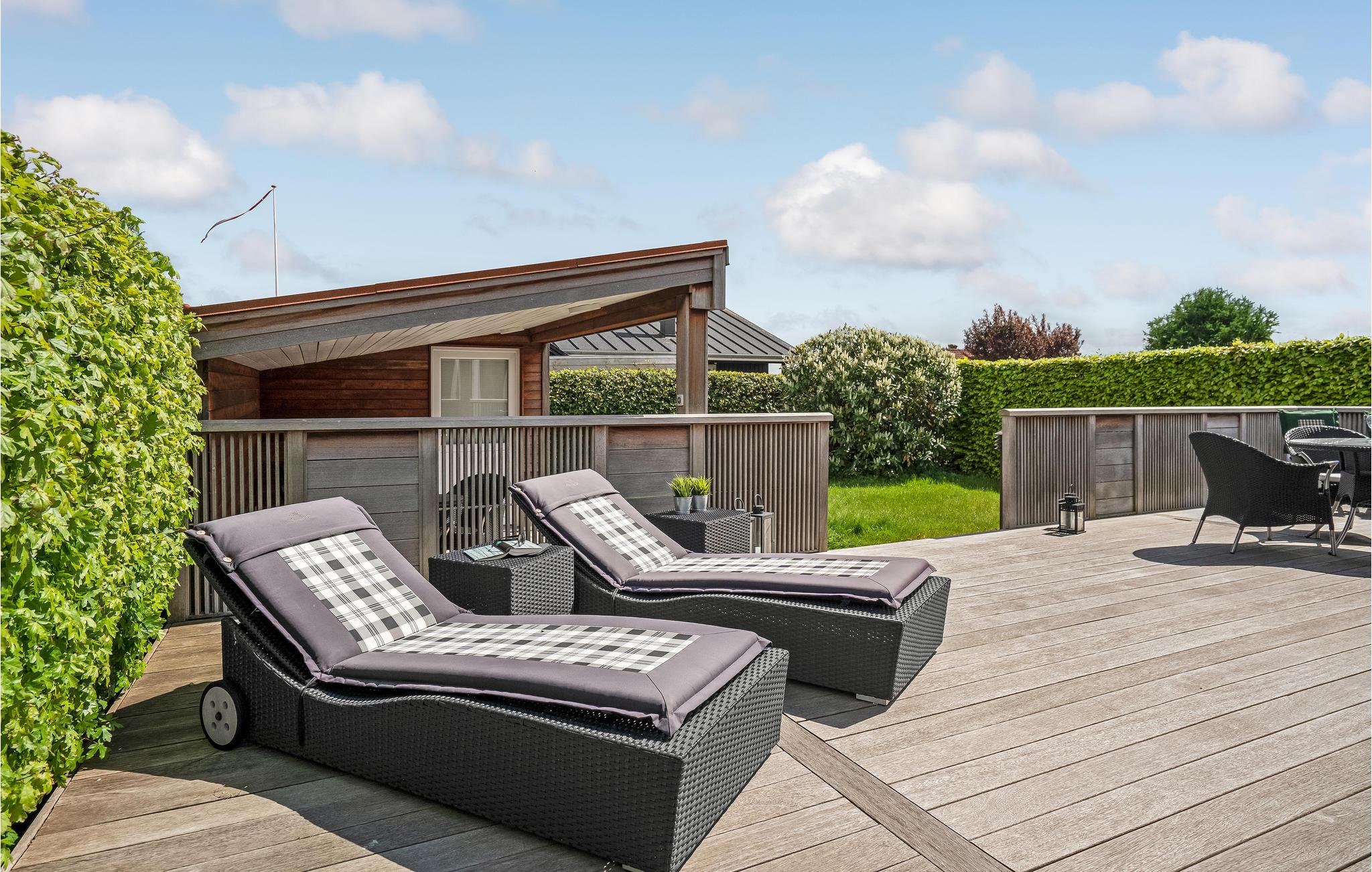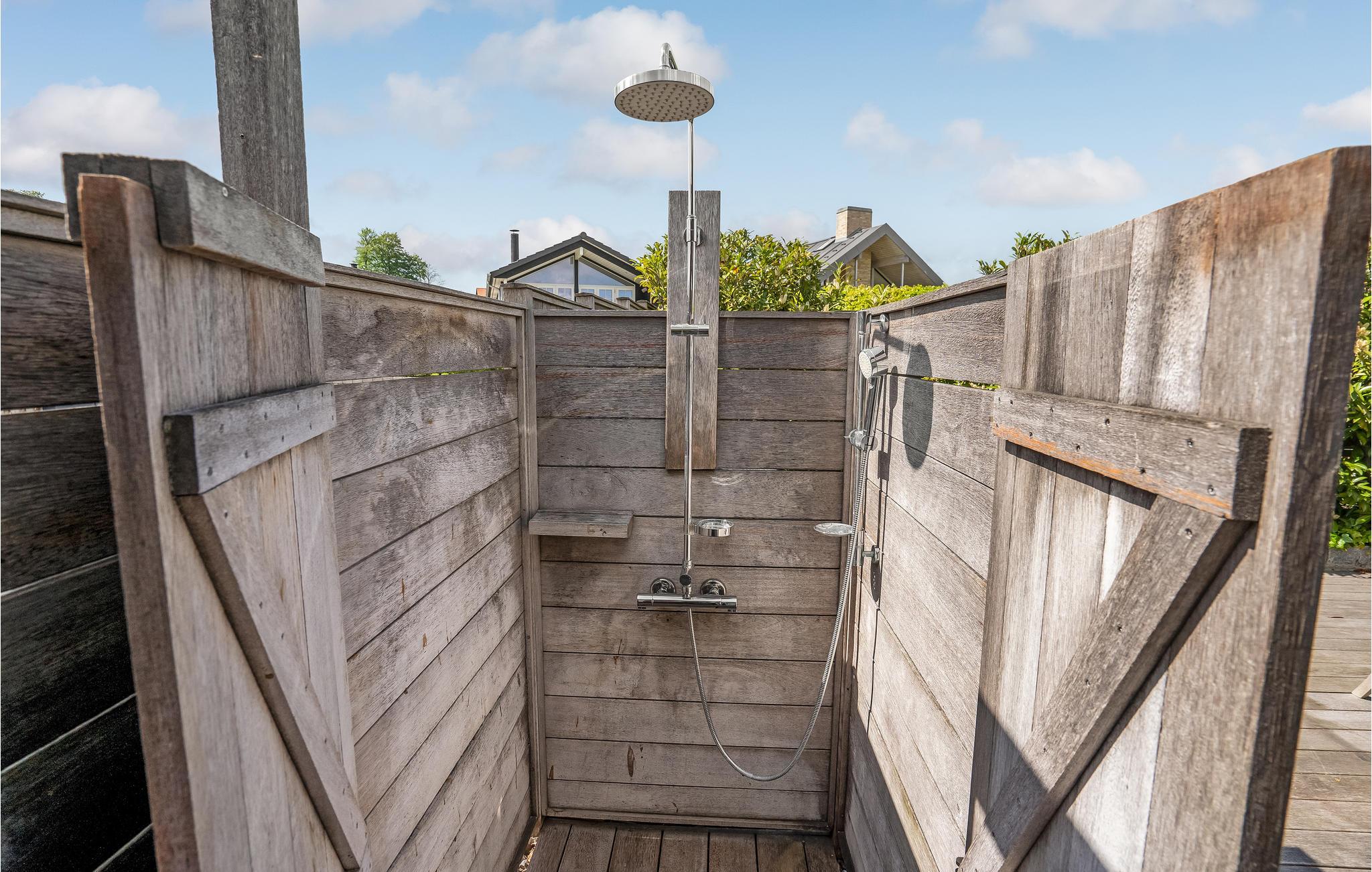 Den store terrasse med havemøbler er det perfekte sted at slappe af i solen med en god bog eller nyde måltider med familien i den friske luft. Efter et besøg på stranden er den udendørs bruser praktisk til at skylle sandet af eller til at køle ned på terrassen efter solbadning på de varme sommerdage.