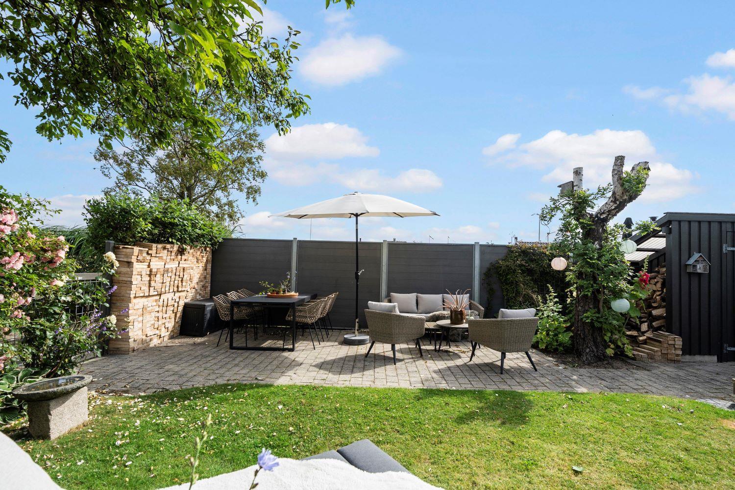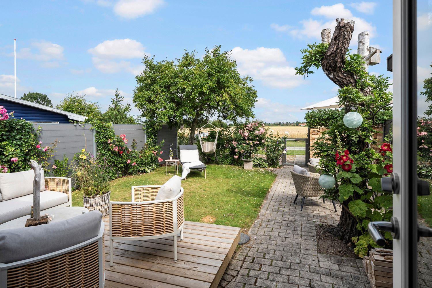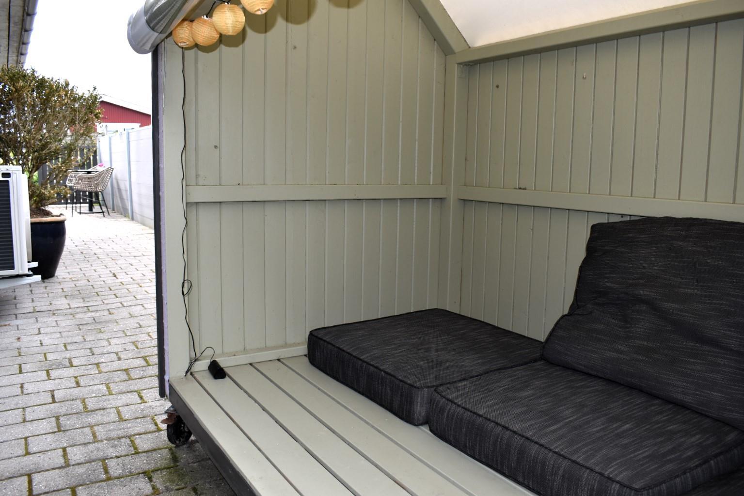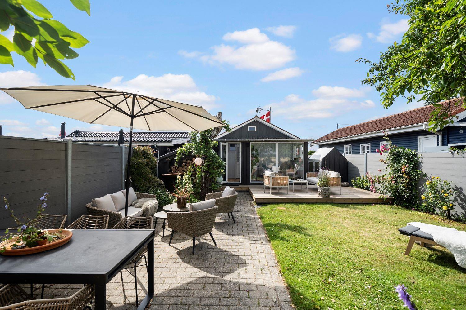 Bag huset finder du en skøn, lukket have med flere terrasser, loungemøbler, hyggelige havelamper og et shelter, hvor du kan overnatte under åben himmel. Haven grænser op til åbne marker og giver masser af privatliv. Hele grunden er indhegnet.