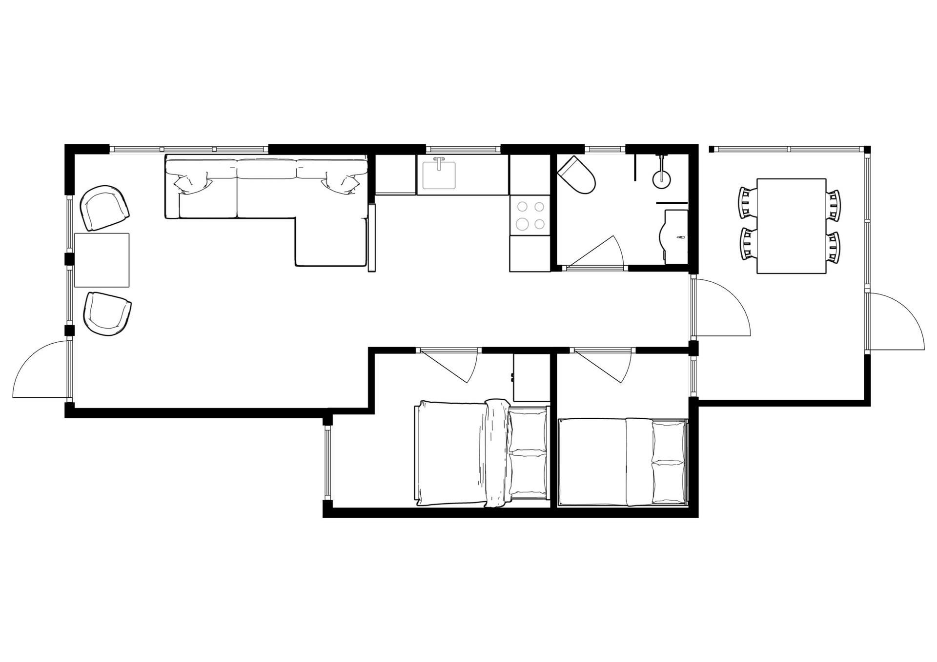 Sommerhuset rummer to soveværelser med dobbeltsenge (160 cm og 140 cm – bemærk at sidstnævnte er 190 cm lang). Badeværelset er rummeligt og har brusekabine. Fra stuen og køkkenet er der direkte adgang til en lille terrasse med komfortable havemøbler, og huset har desuden en dejlig udestue med udsigt til haven. Huset har hyggelig brændeovn og energibesparende varmepumpe.