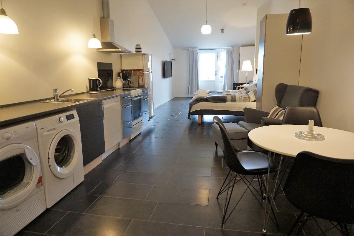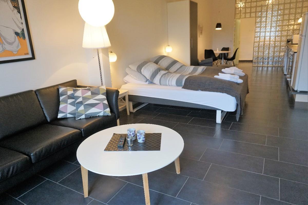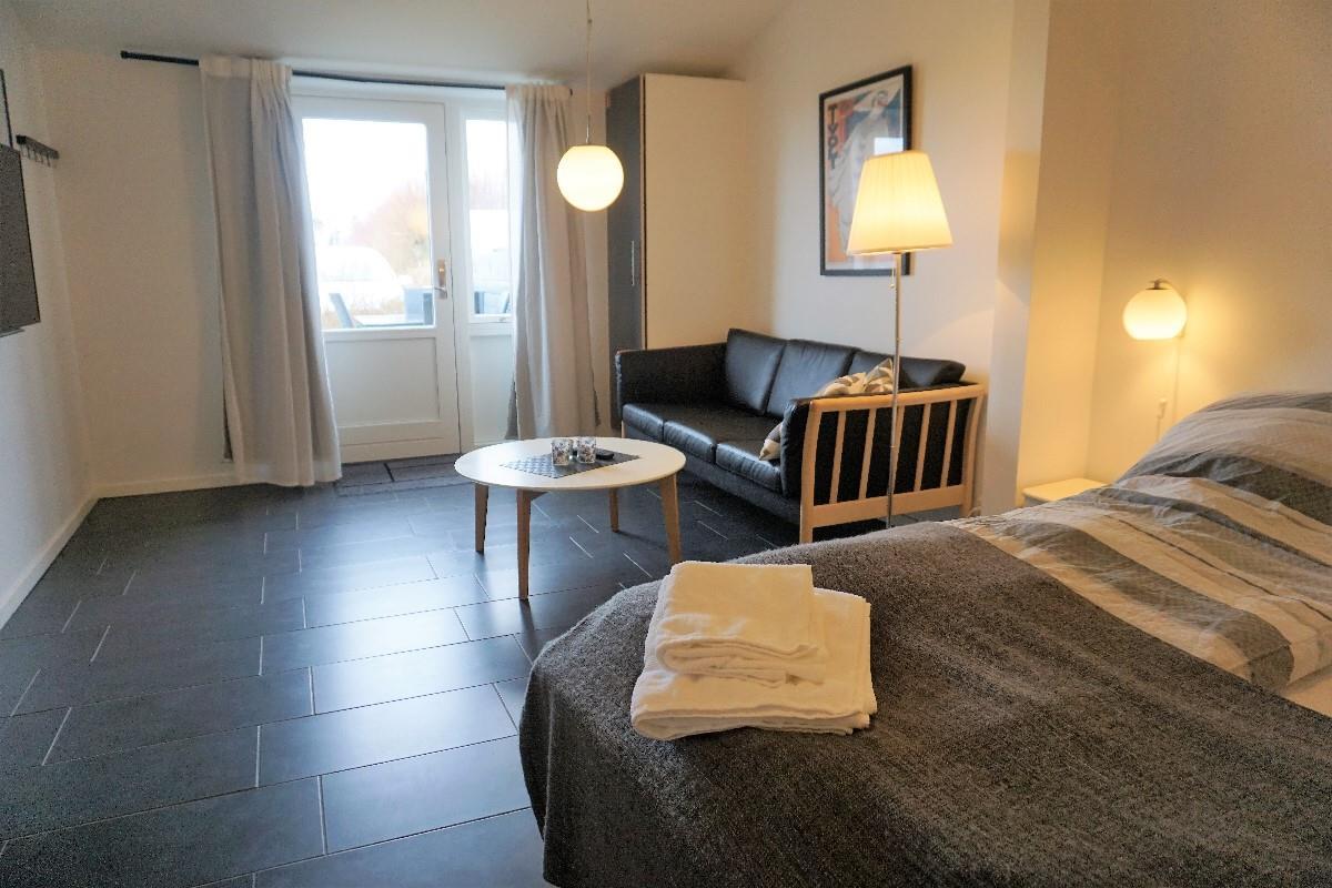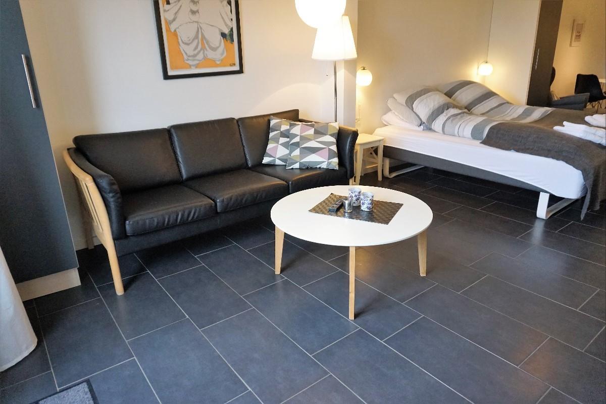 Hyggelig studie-lejlighed i Kerteminde med privat terrasse og gratis adgang til sportsfaciliteter.