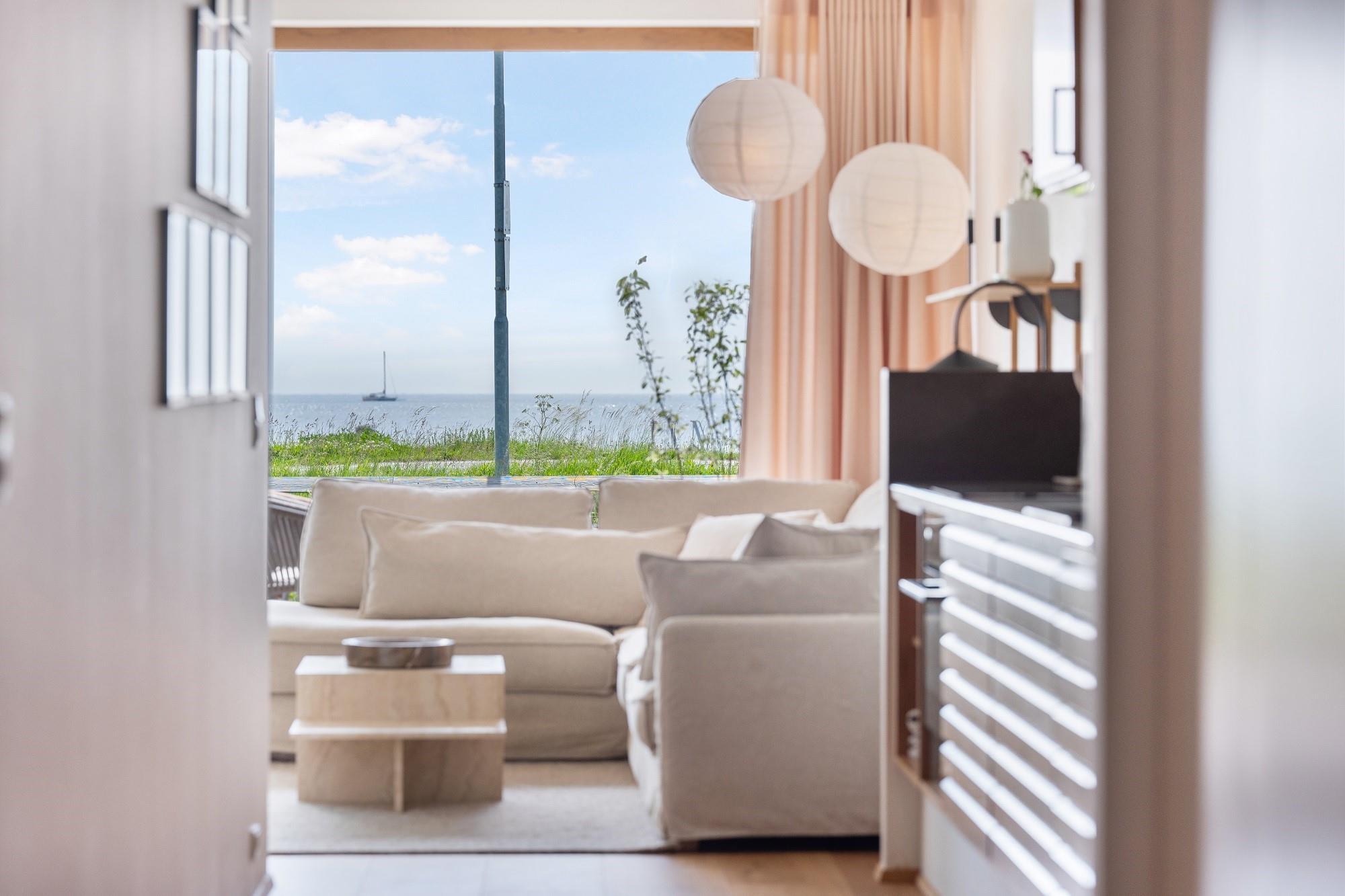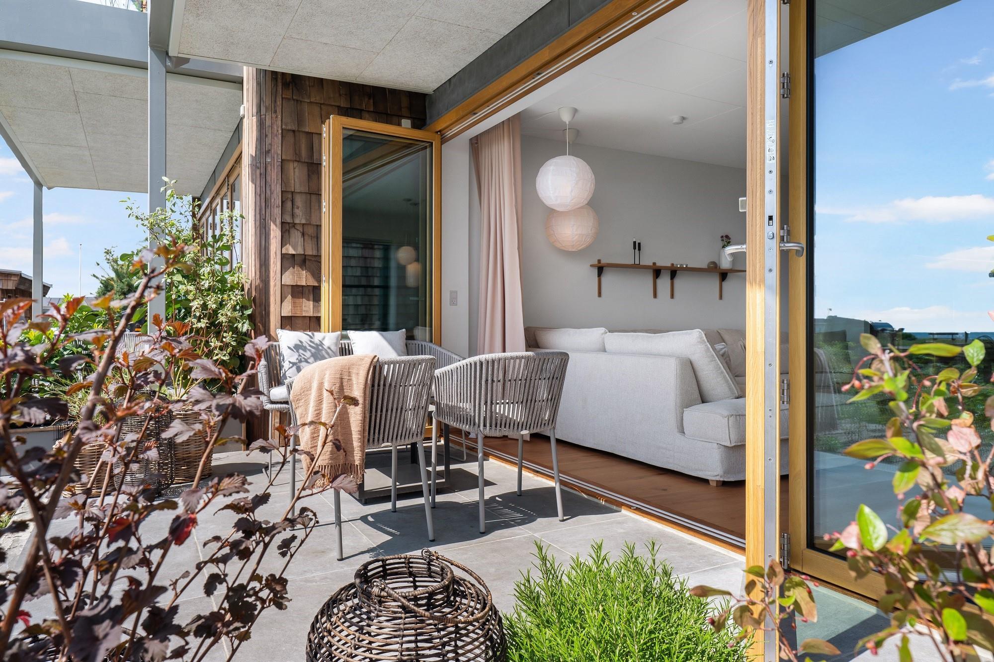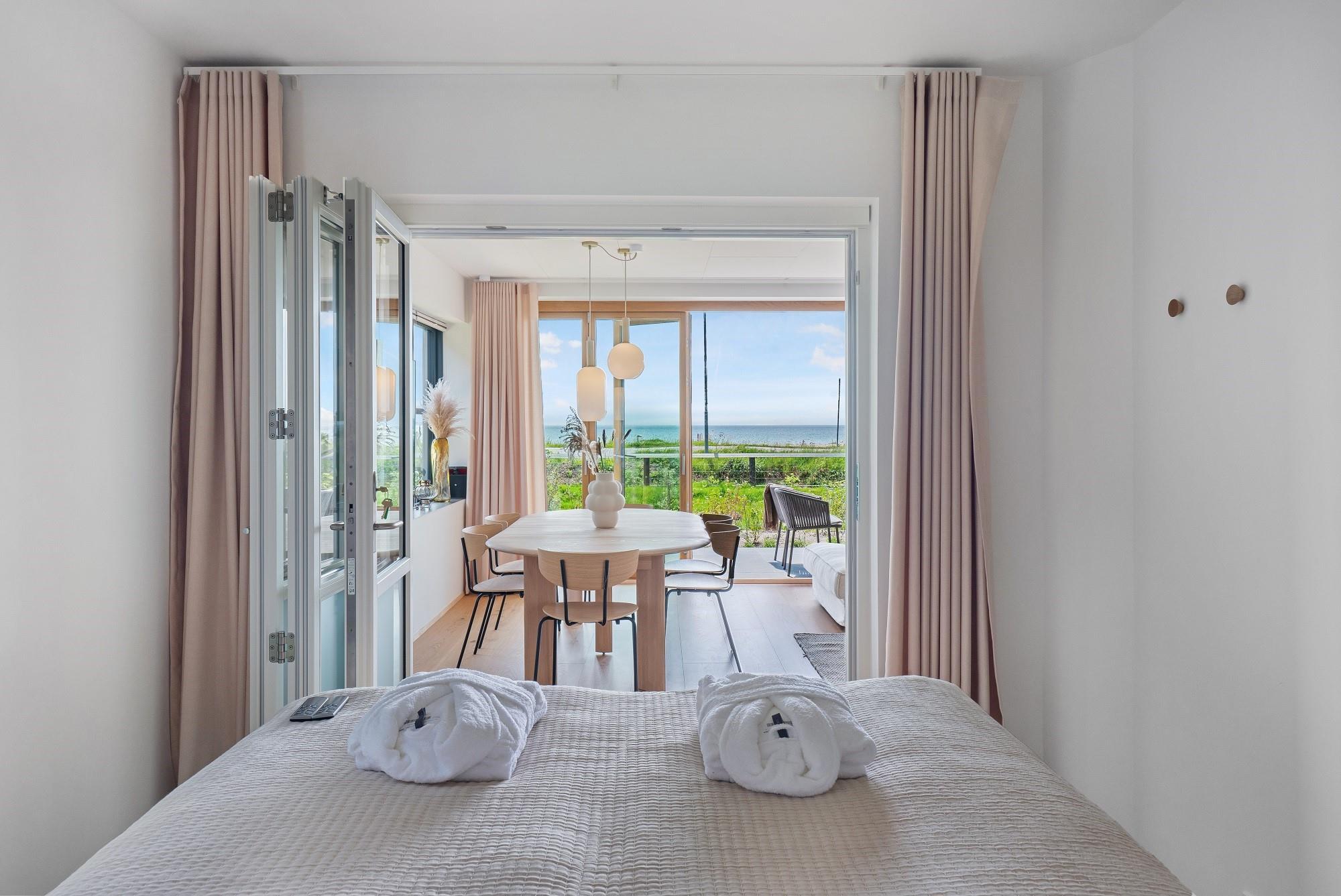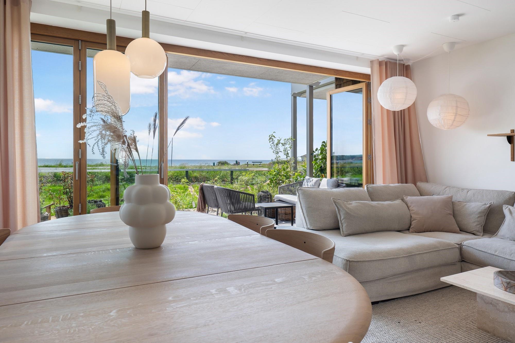 Boligen ligger i stueplan og er indrettet med smukt interiør og skønne detaljer. Fra stue og køkken har du adgang til den rummelige terrasse. På en lun sommerdag kan de store foldedøre skydes til side, så du får naturen og stranden helt tæt på. Boligen har 3 soveværelser, hvoraf de 2 er med dobbeltseng. Fra det ene dobbeltværelse kan du ligge i sengen og nyde solopgangen igennem det store glasparti, som vender mod stuen. Dette værelse har direkte adgang til eget badeværelse. Boligens andet badeværelse kan tilgås fra gangen. Boligen har Smart-TV med mulighed for streaming (ingen TV-programmer).