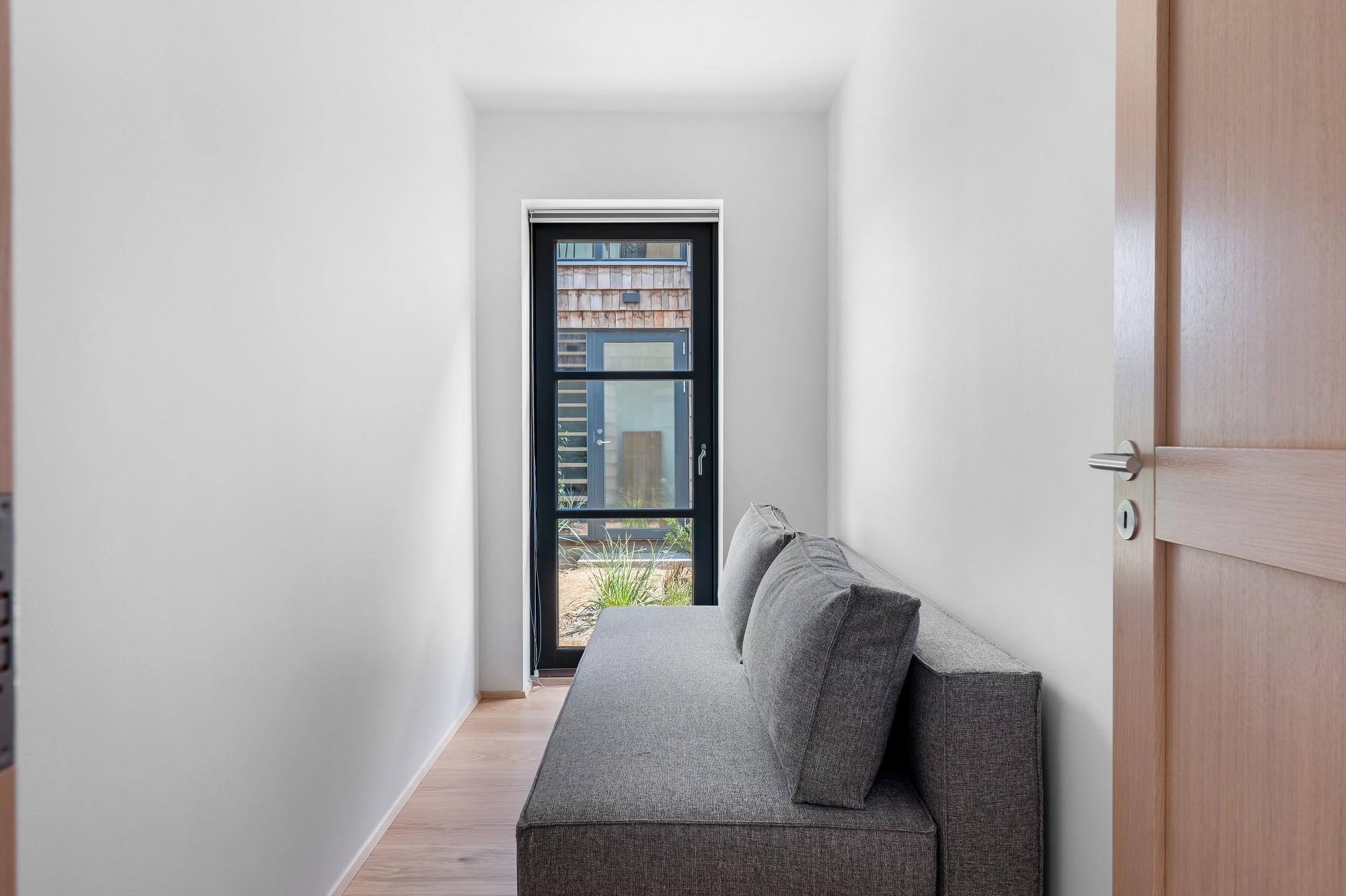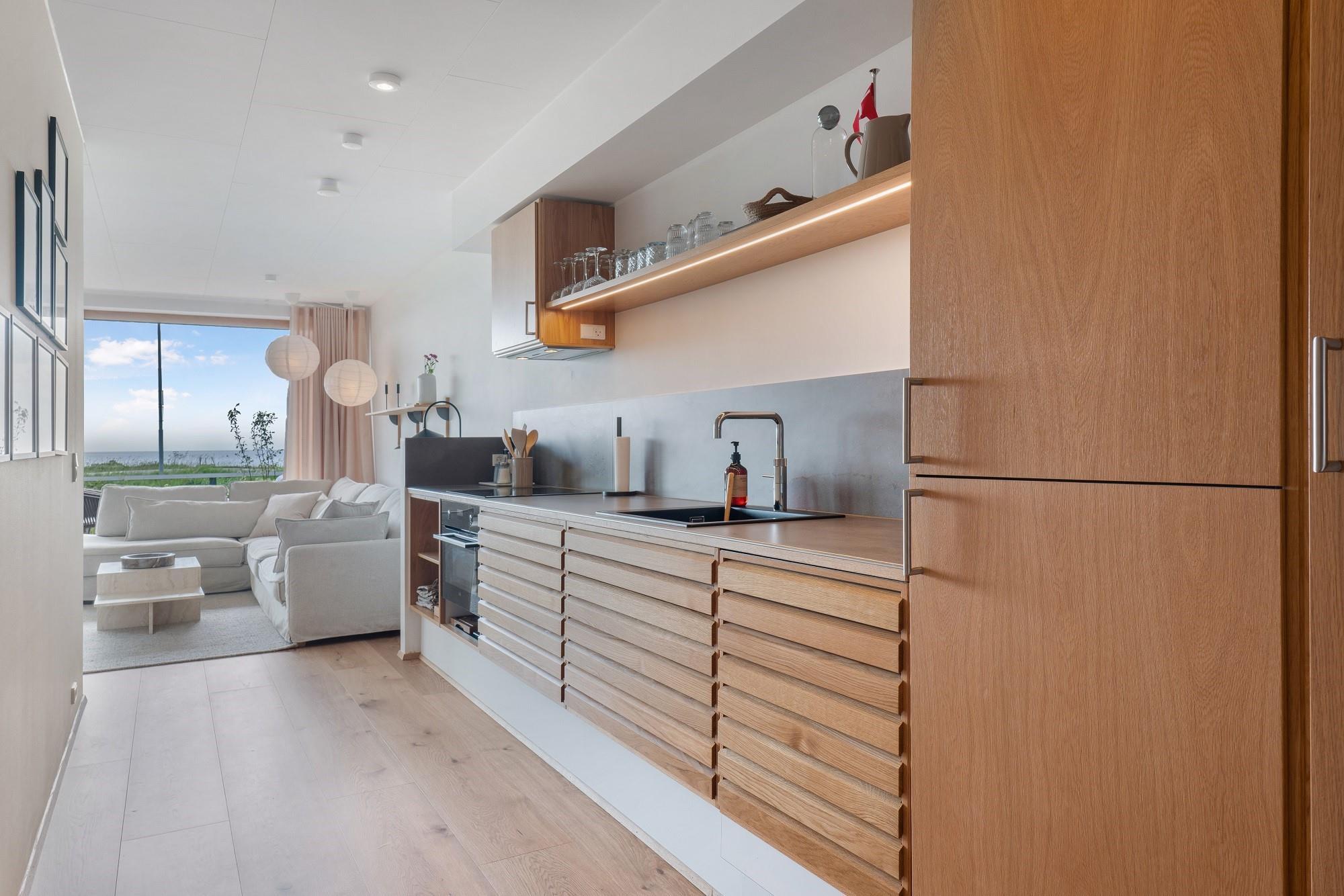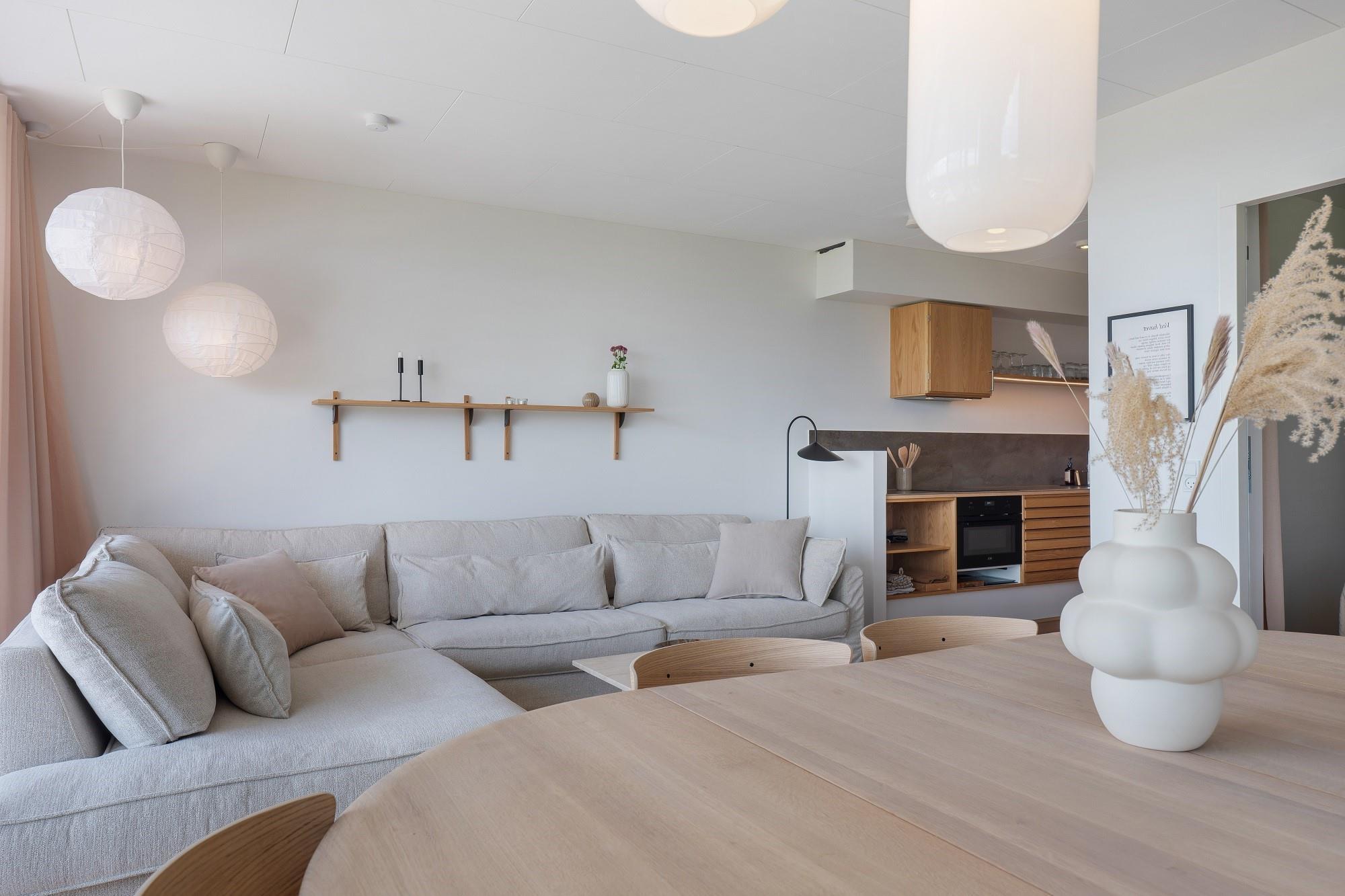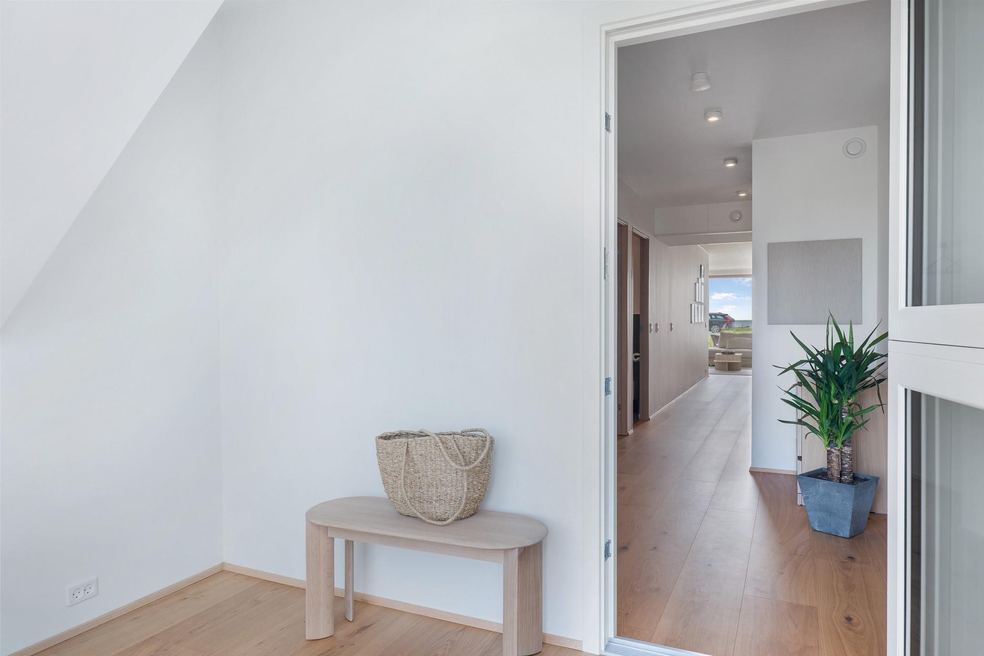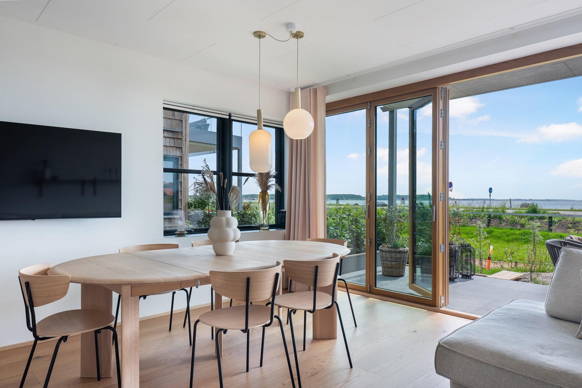 Boligen ligger i stueplan og er indrettet med smukt interiør og skønne detaljer. Fra stue og køkken har du adgang til den rummelige terrasse. På en lun sommerdag kan de store foldedøre skydes til side, så du får naturen og stranden helt tæt på. Boligen har 3 soveværelser, hvoraf de 2 er med dobbeltseng. Fra det ene dobbeltværelse kan du ligge i sengen og nyde solopgangen igennem det store glasparti, som vender mod stuen. Dette værelse har direkte adgang til eget badeværelse. Boligens andet badeværelse kan tilgås fra gangen. Boligen har Smart-TV med mulighed for streaming (ingen TV-programmer).