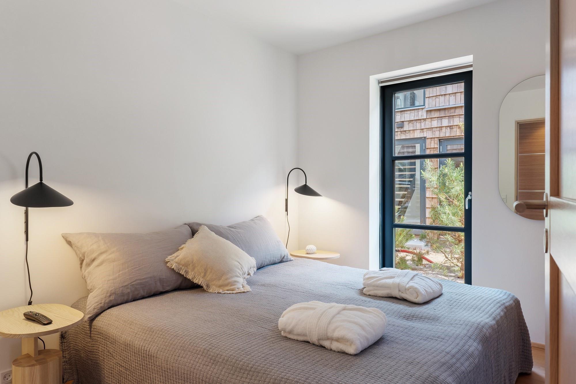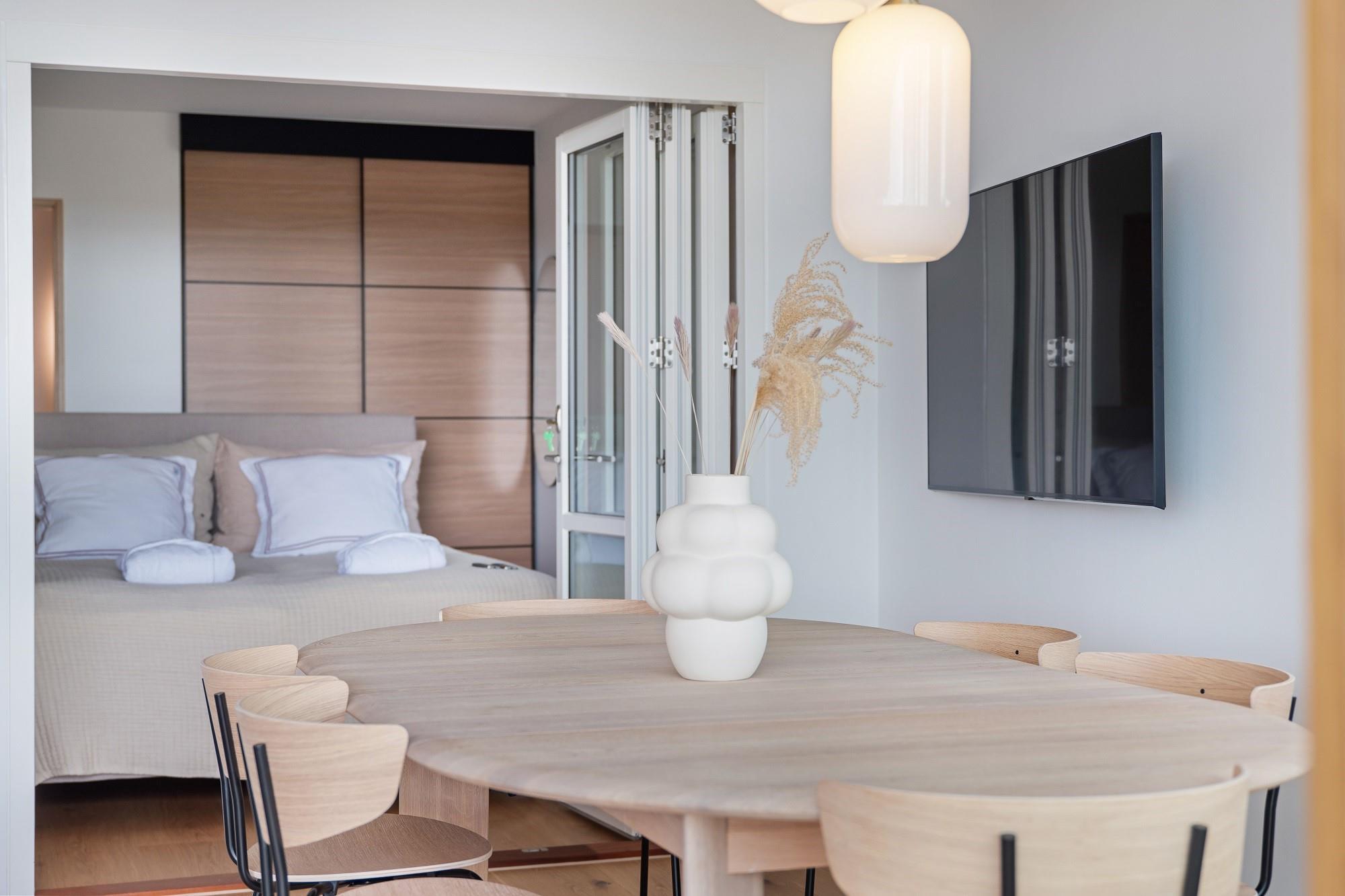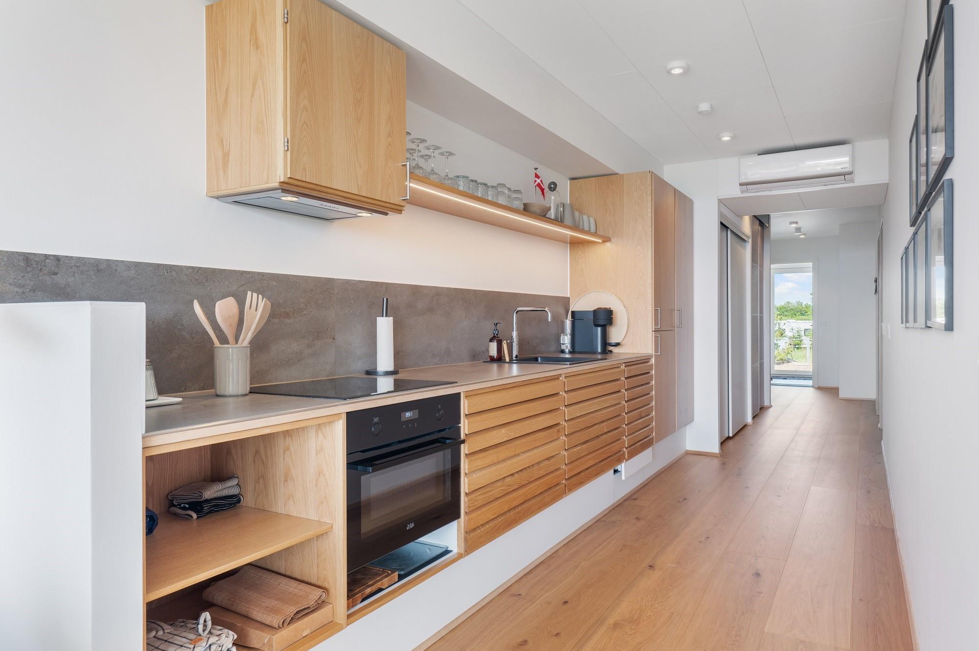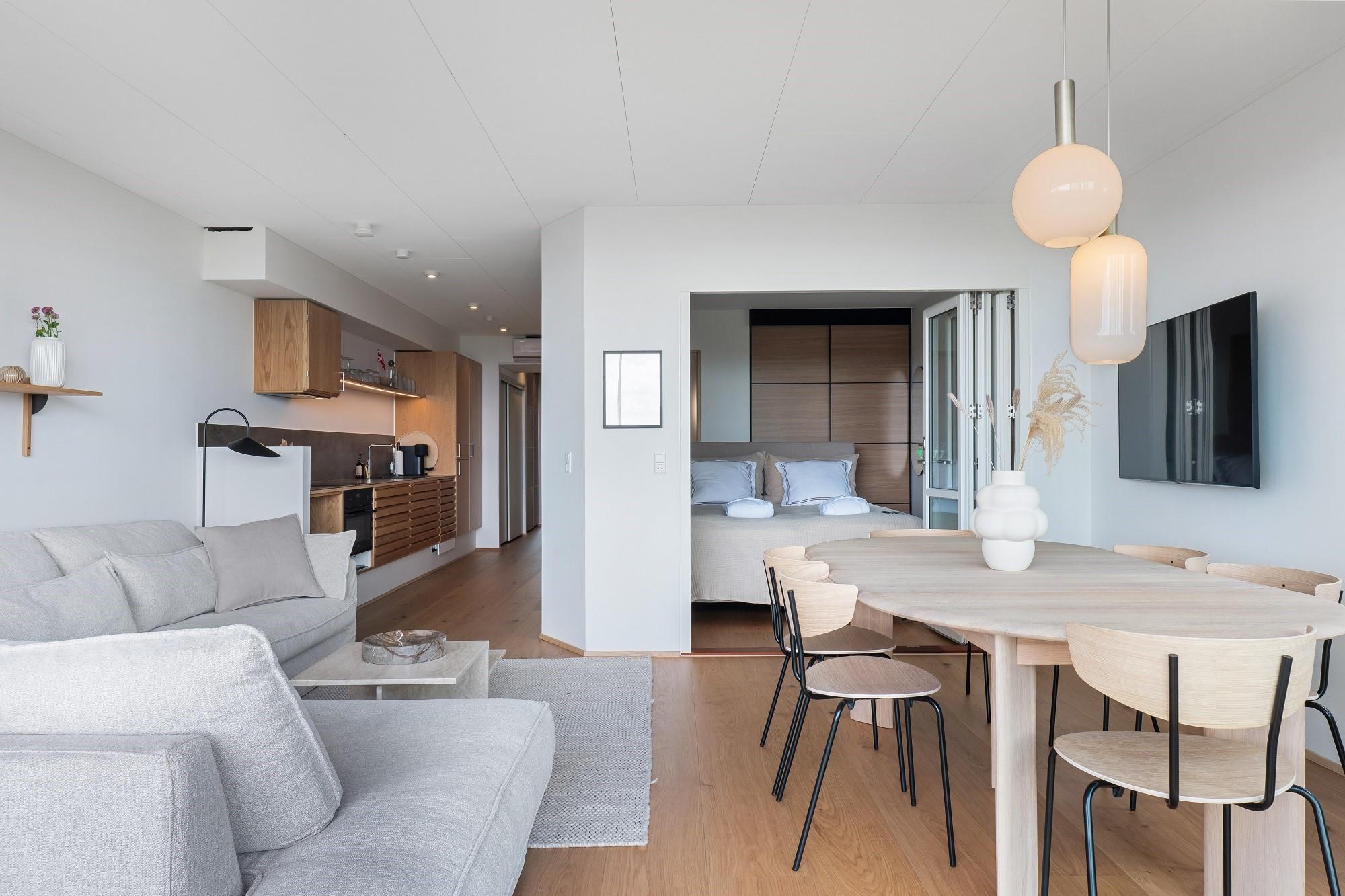 Boligen ligger i stueplan og er indrettet med smukt interiør og skønne detaljer. Fra stue og køkken har du adgang til den rummelige terrasse. På en lun sommerdag kan de store foldedøre skydes til side, så du får naturen og stranden helt tæt på. Boligen har 3 soveværelser, hvoraf de 2 er med dobbeltseng. Fra det ene dobbeltværelse kan du ligge i sengen og nyde solopgangen igennem det store glasparti, som vender mod stuen. Dette værelse har direkte adgang til eget badeværelse. Boligens andet badeværelse kan tilgås fra gangen. Boligen har Smart-TV med mulighed for streaming (ingen TV-programmer).