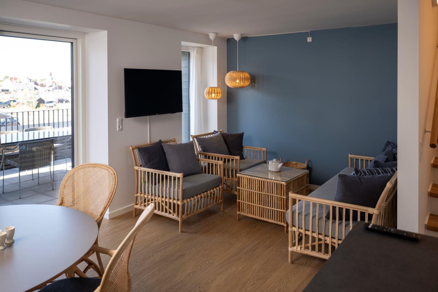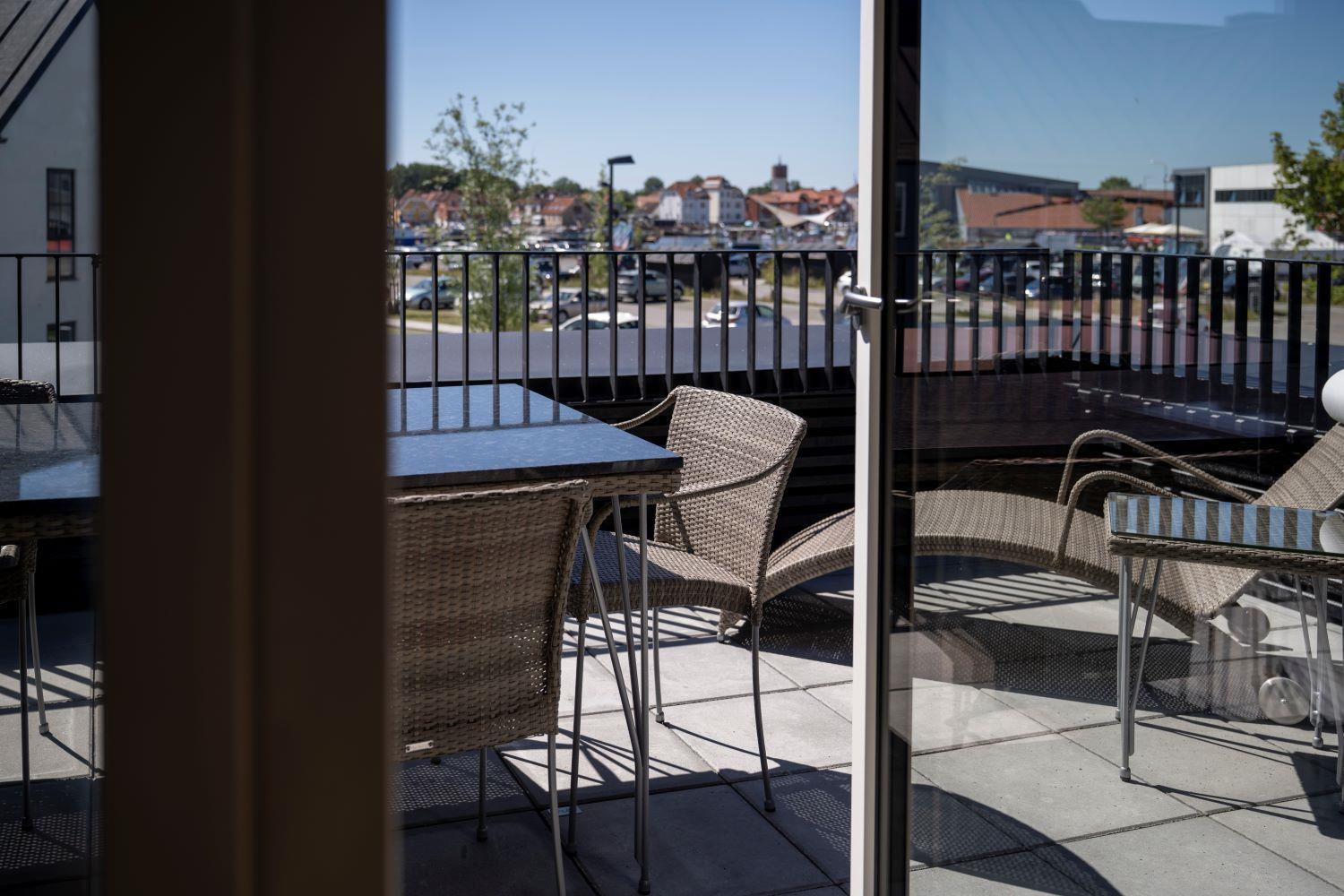 Fra stuen er der udgang til en privat terrasse, hvor komfortable havemøbler indbyder til afslapning og hyggelige stunder. Fra terrassen er der kig til havnen og byen.