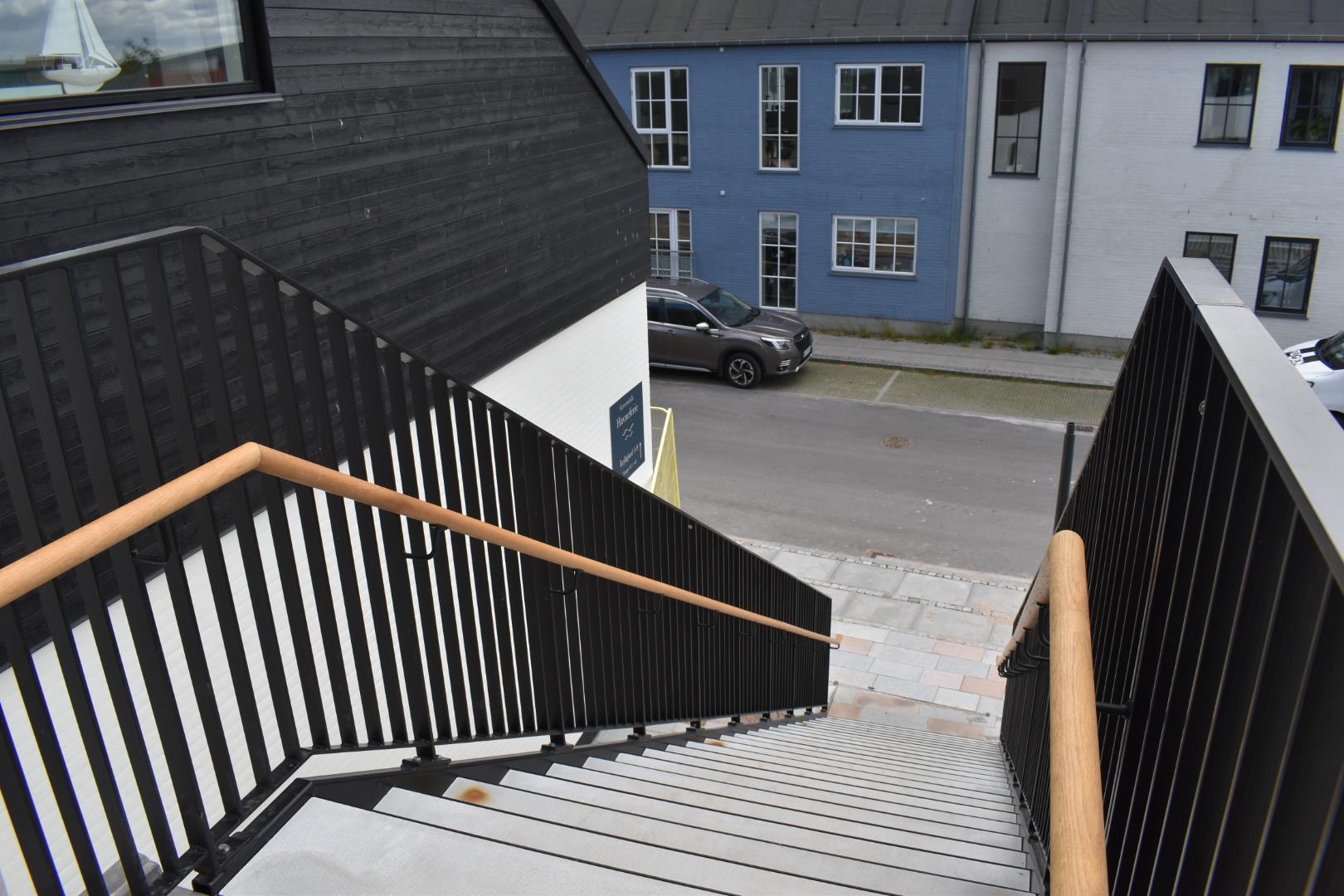 Lejligheden tilgås via en svalegang. Der er elevator i bygningen for nem adgang samt gratis parkering foran bygningen. Der er desuden gratis parkering for én bil på et privat, indhegnet område med adgang til ladestander.