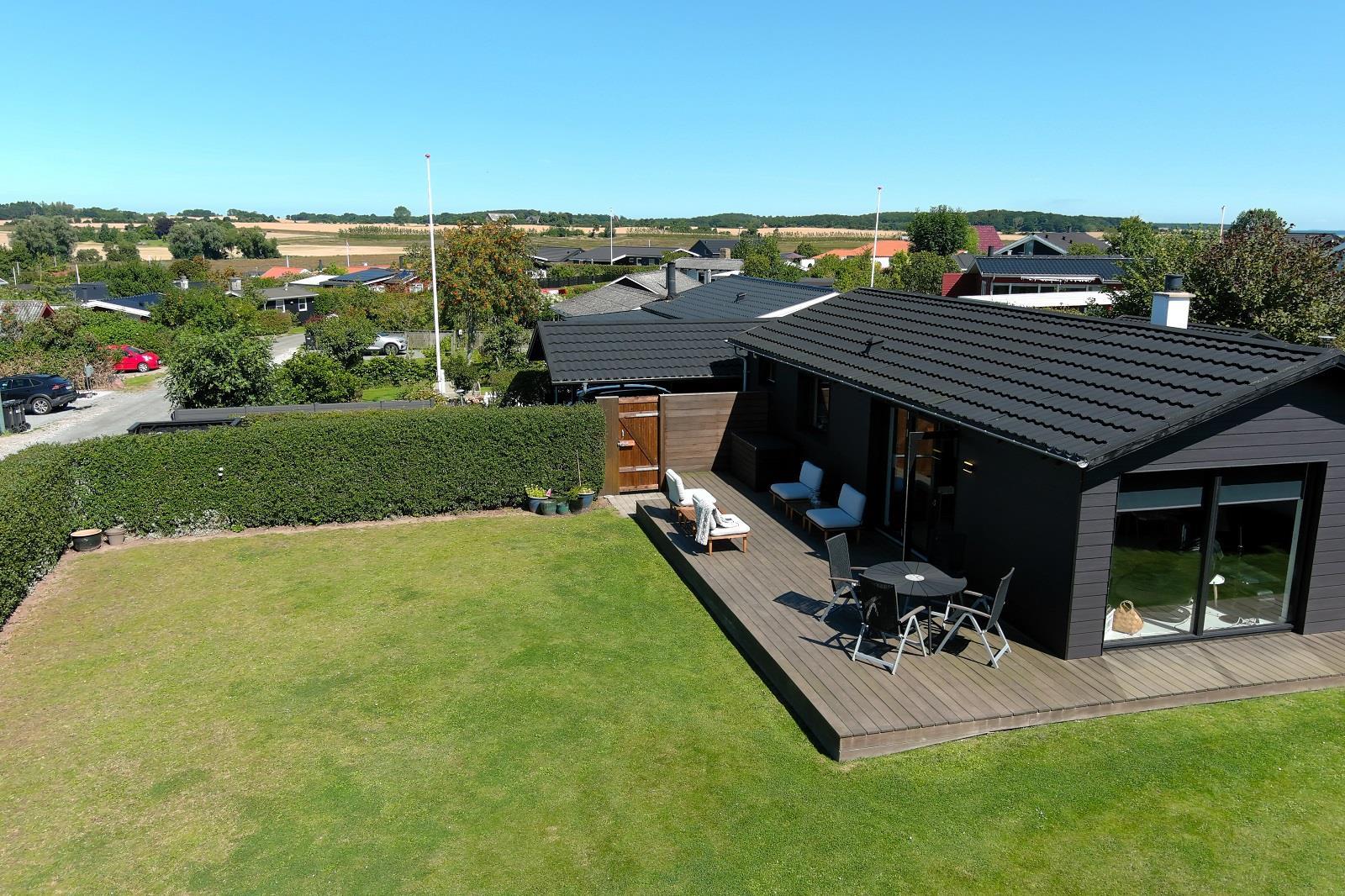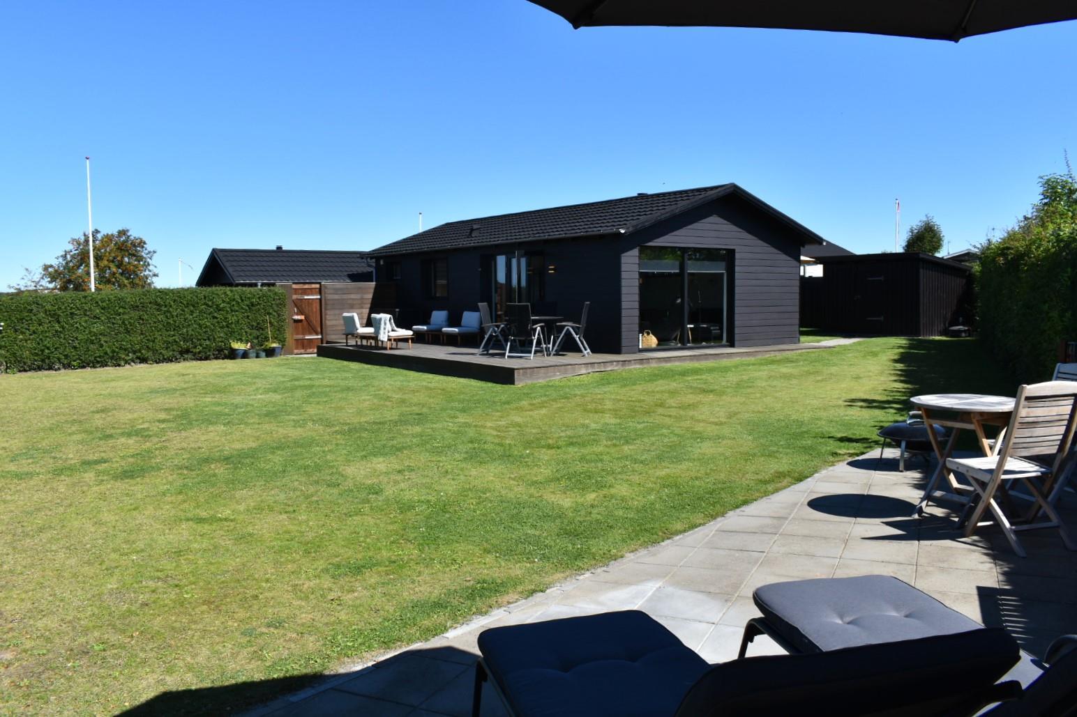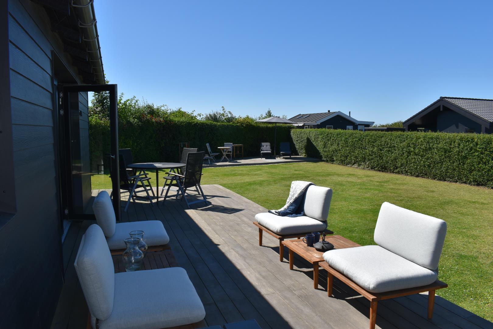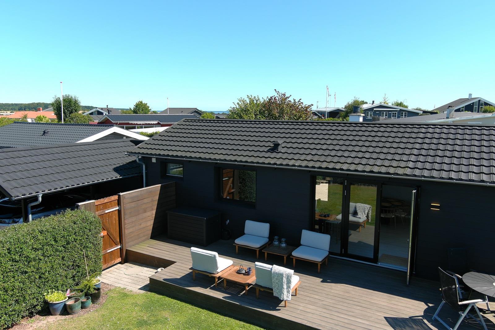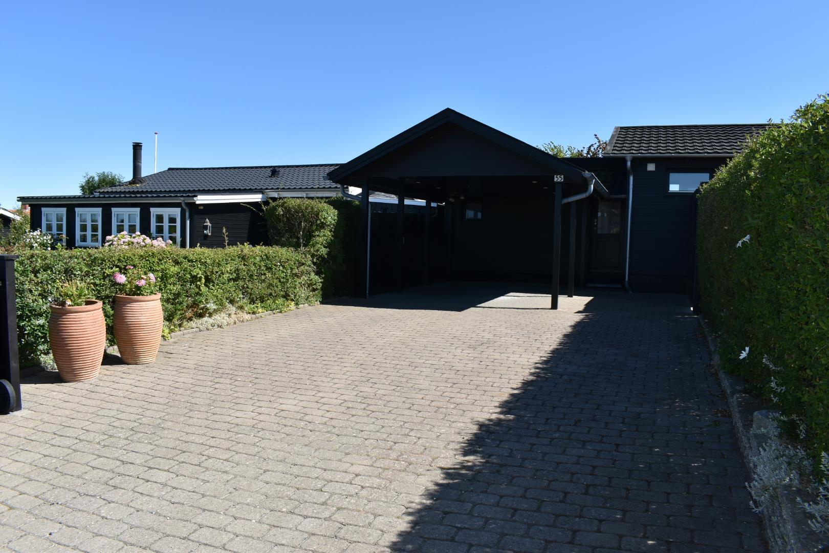 Sommerhuset ligger på en ugeneret, lukket grund med flere solrige terrasser. Den store træterrasse mod haven byder på sol fra middag til sen aften, mens baghaven er perfekt til at nyde morgenkaffen i ro og mag. Grunden er helt indhegnet, så din hund kan løbe frit. Der er god plads til parkering og en praktisk carport.