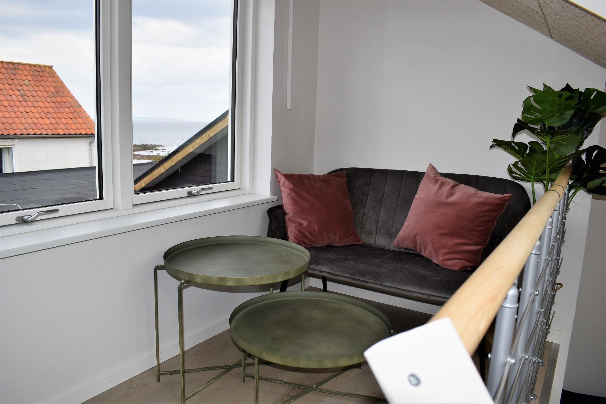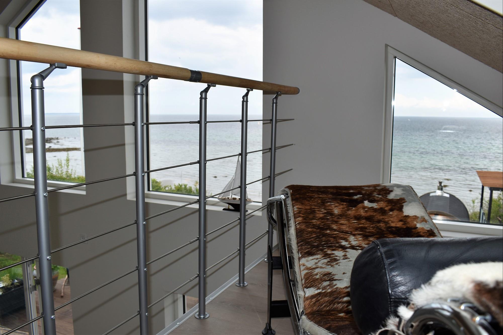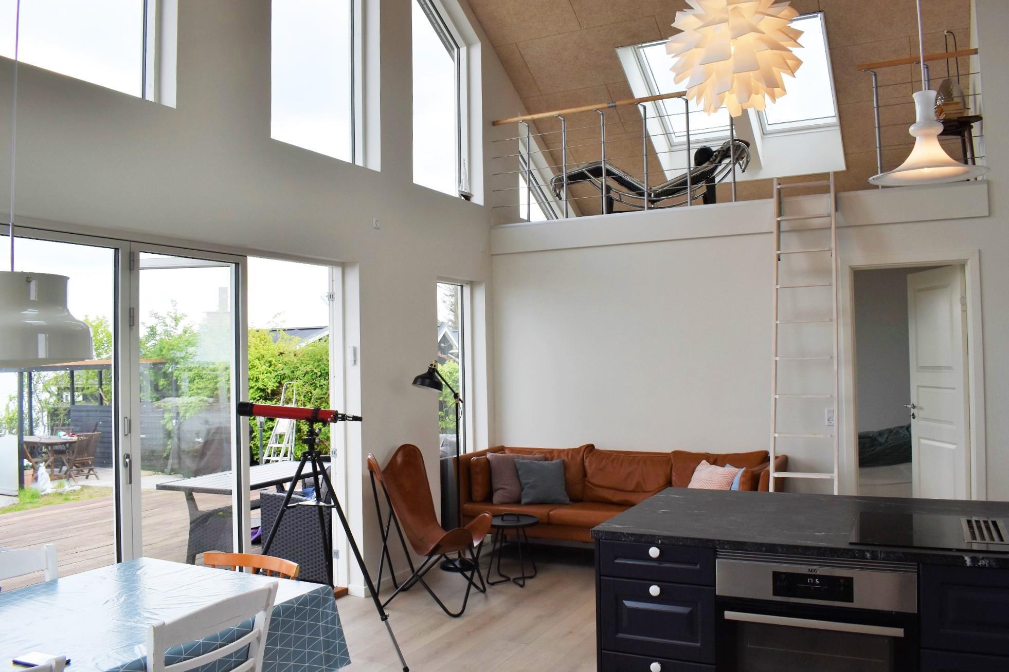 Fra køkken-alrummet er der adgang til en hyggelig hems med lænestol – det perfekte sted at fordybe sig i en bog eller blot nyde den betagende udsigt over vandet. Udenfor finder du flere indbydende terrasser, herunder en strandterrasse og en pergola, hvor du kan søge skygge på varme sommerdage.