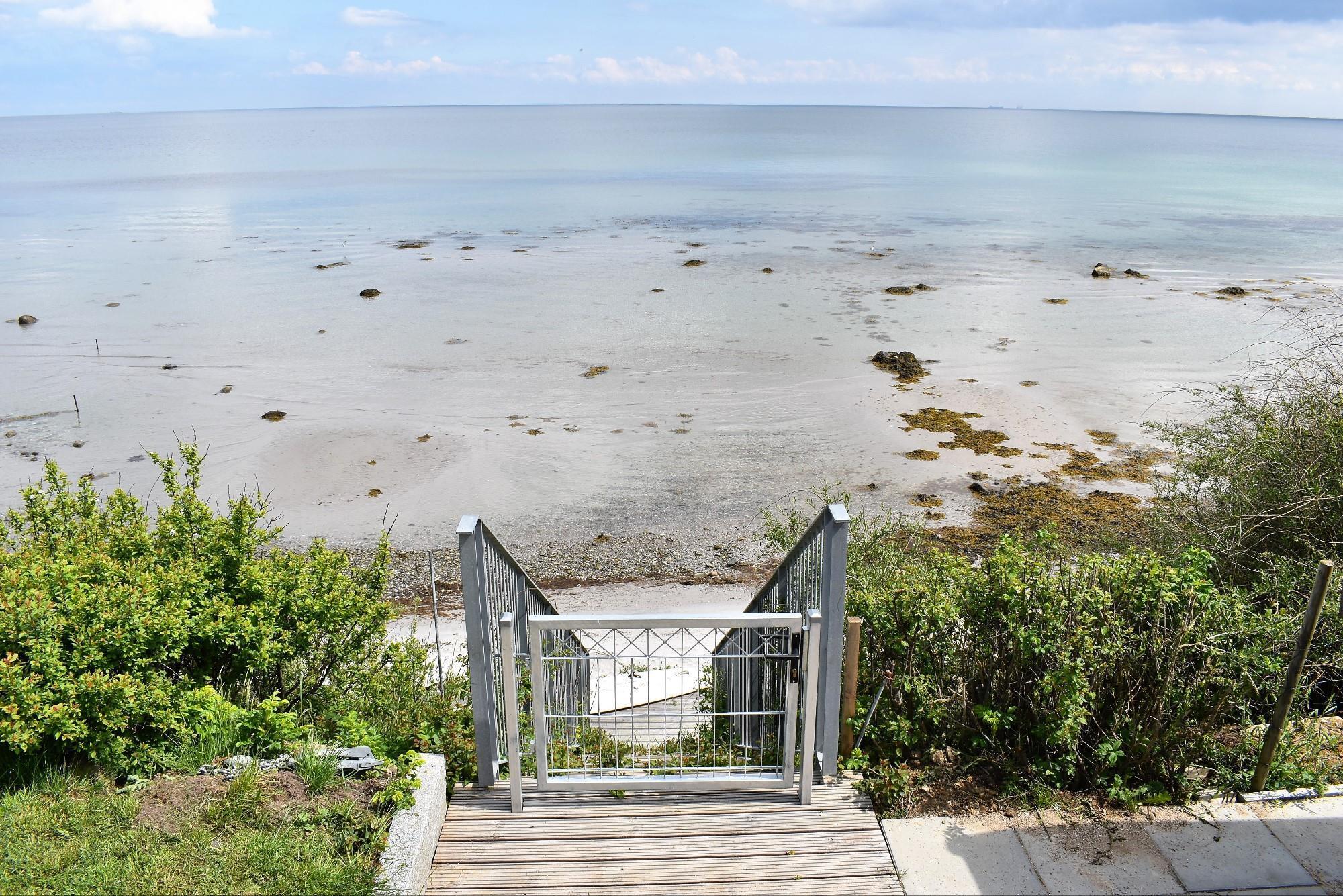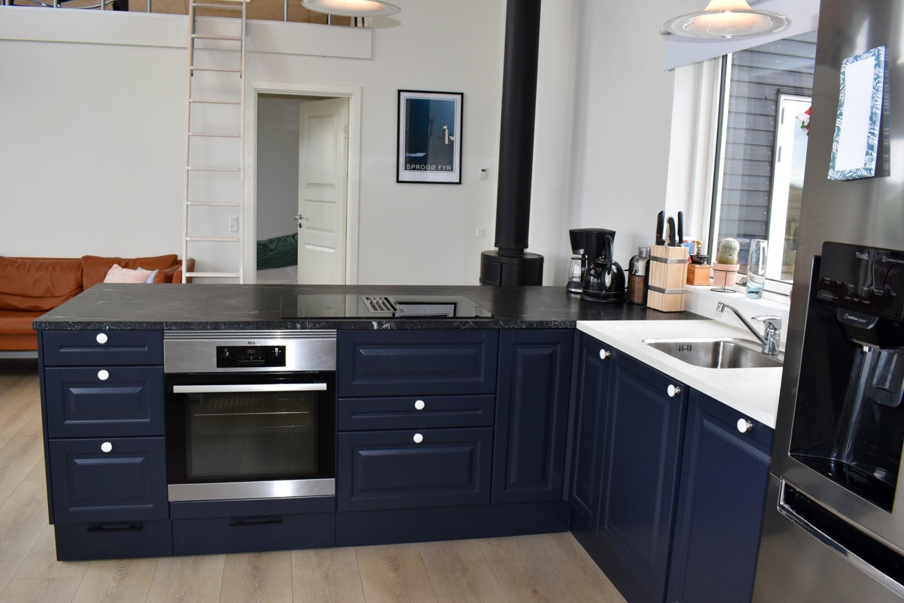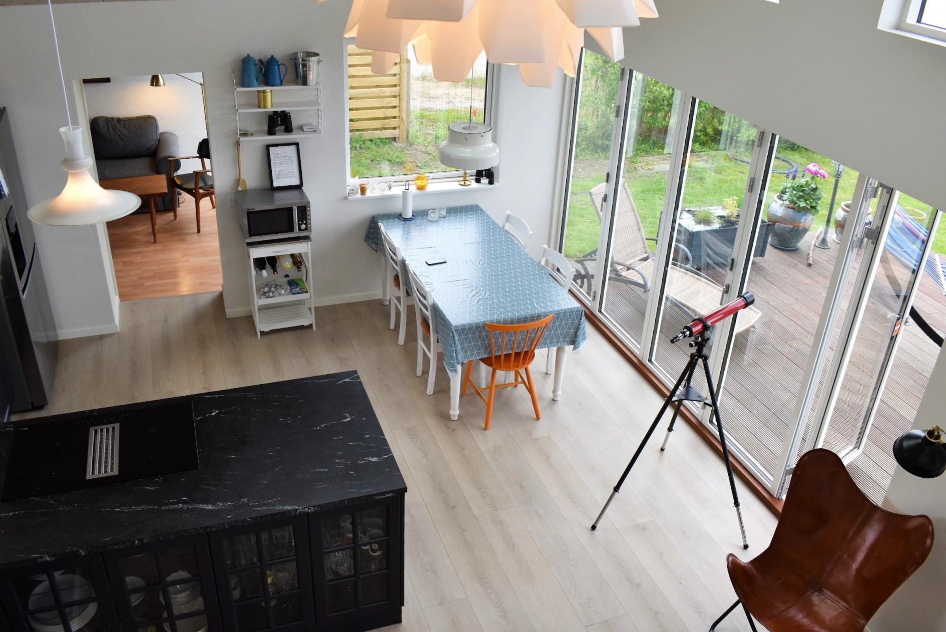 Fra køkken-alrummet er der adgang til en hyggelig hems med lænestol – det perfekte sted at fordybe sig i en bog eller blot nyde den betagende udsigt over vandet. Udenfor finder du flere indbydende terrasser, herunder en strandterrasse og en pergola, hvor du kan søge skygge på varme sommerdage.