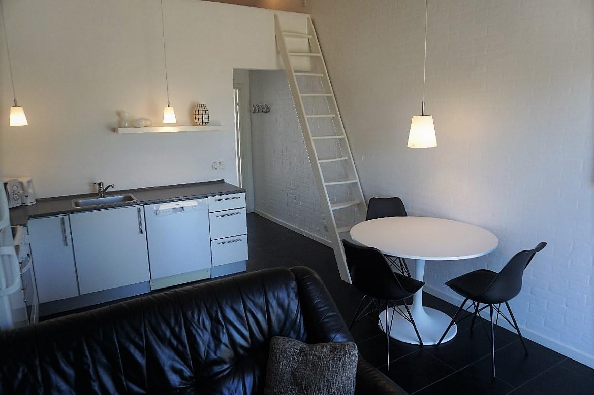 Lejligheden er i et plan og indrettet med stue i åben forbindelse med køkken, badeværelse, 1 soverum med 1 dobbeltseng og hems med 2 madrasser. Fra stuen er der udgang til en privat terrasse med havemøbler og kig til legepladsen. Fra grunden omkring Kerteminde Byferie er der flot udsigt til naturområdet Sybergland og golfbanen Great Northern.