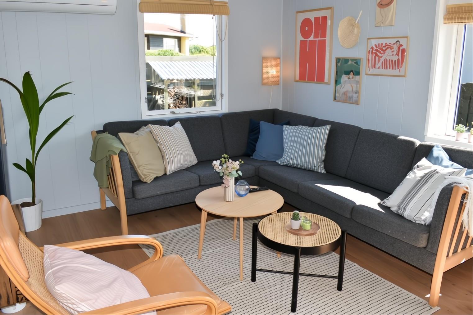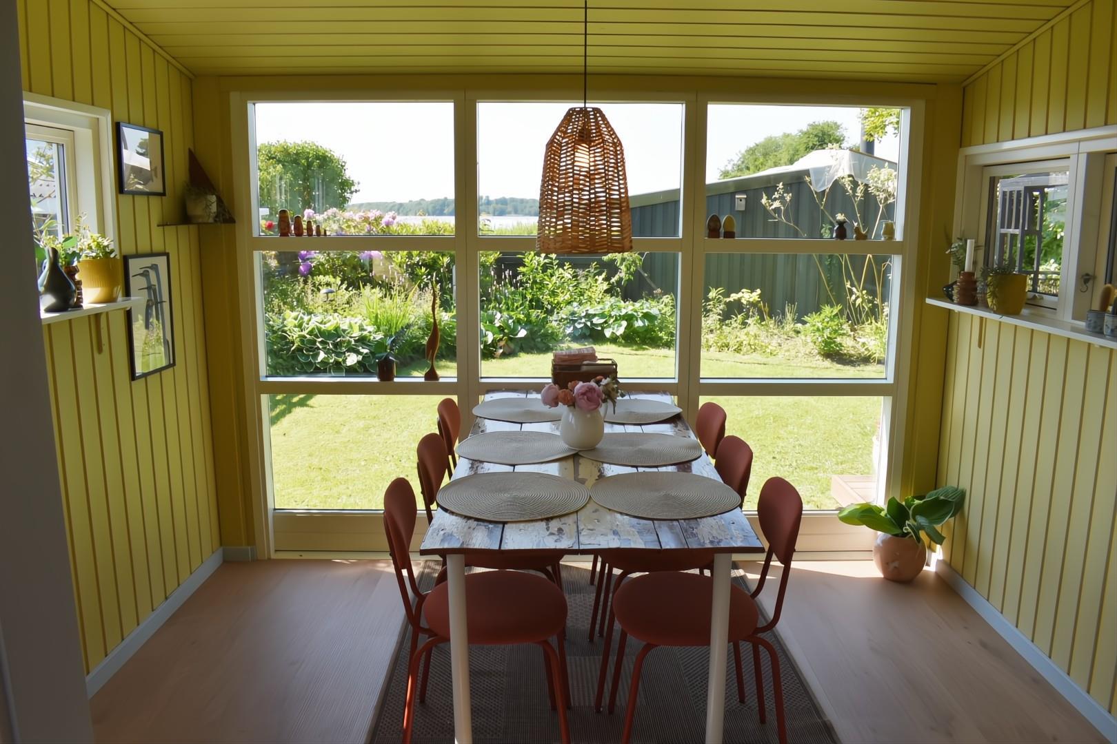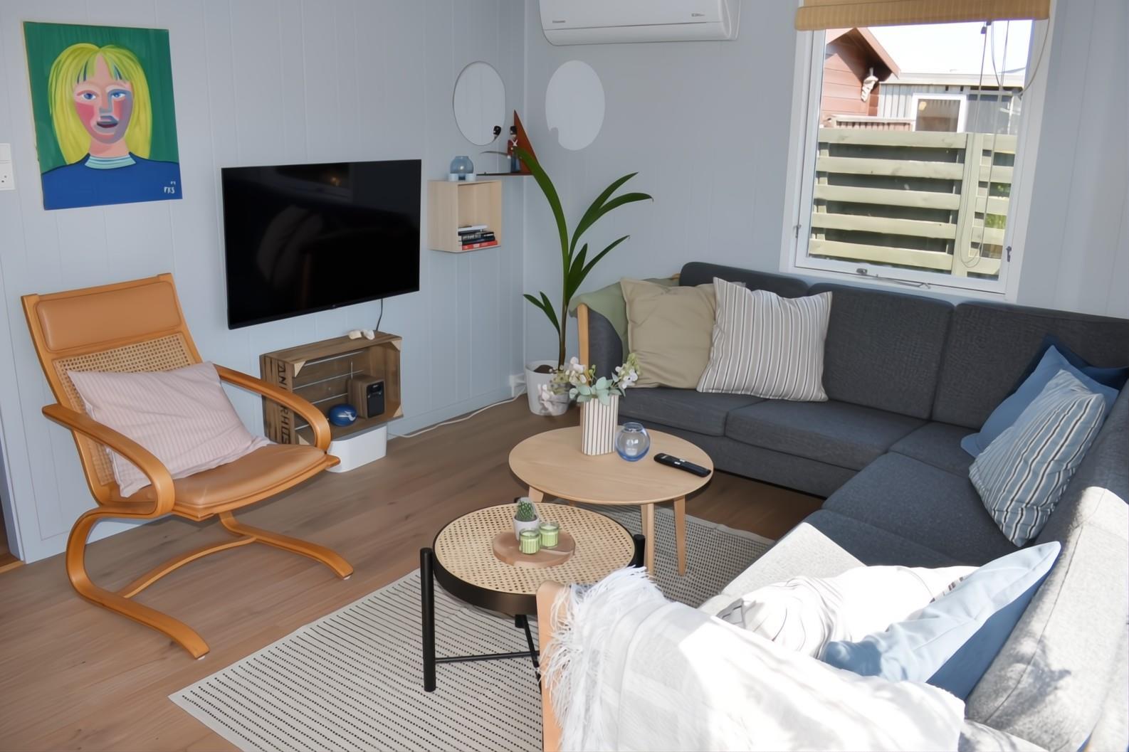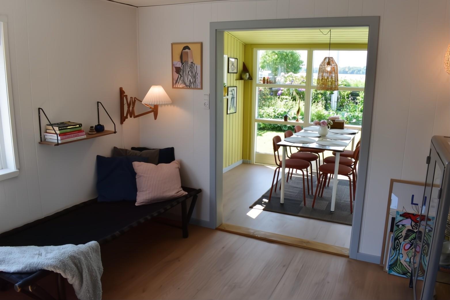 Sommerhuset er renoveret i 2025 og indrettet i den dejligste sommerhusstil med separat, nyt køkken med opvaskemaskine, skøn stue med brændeovn, energibesparende varmepumpe samt spiseplads, hvorfra du kan nyde udsigten til fjorden. Der er inden TV-pakke (kun DR kanal), men smart-TV med mulighed for streaming.
