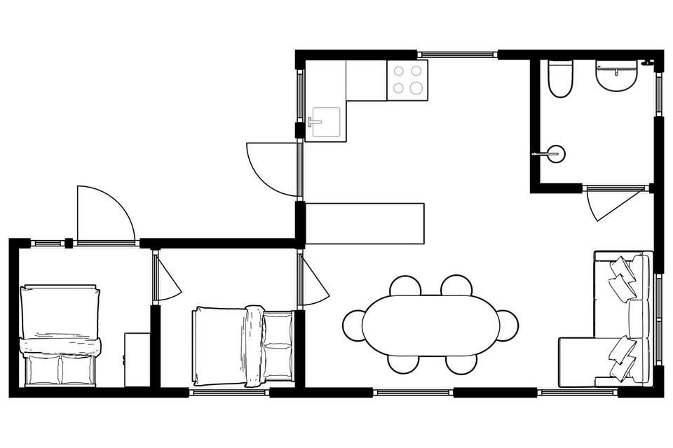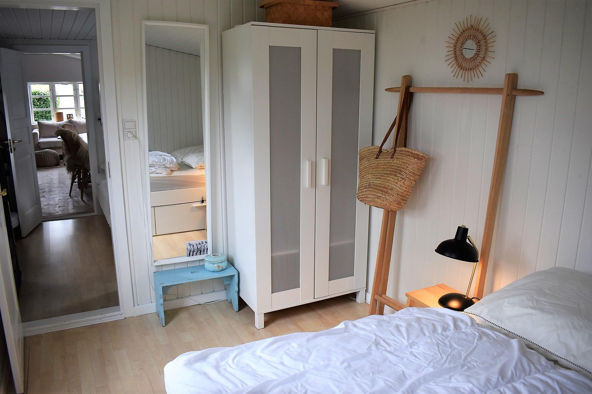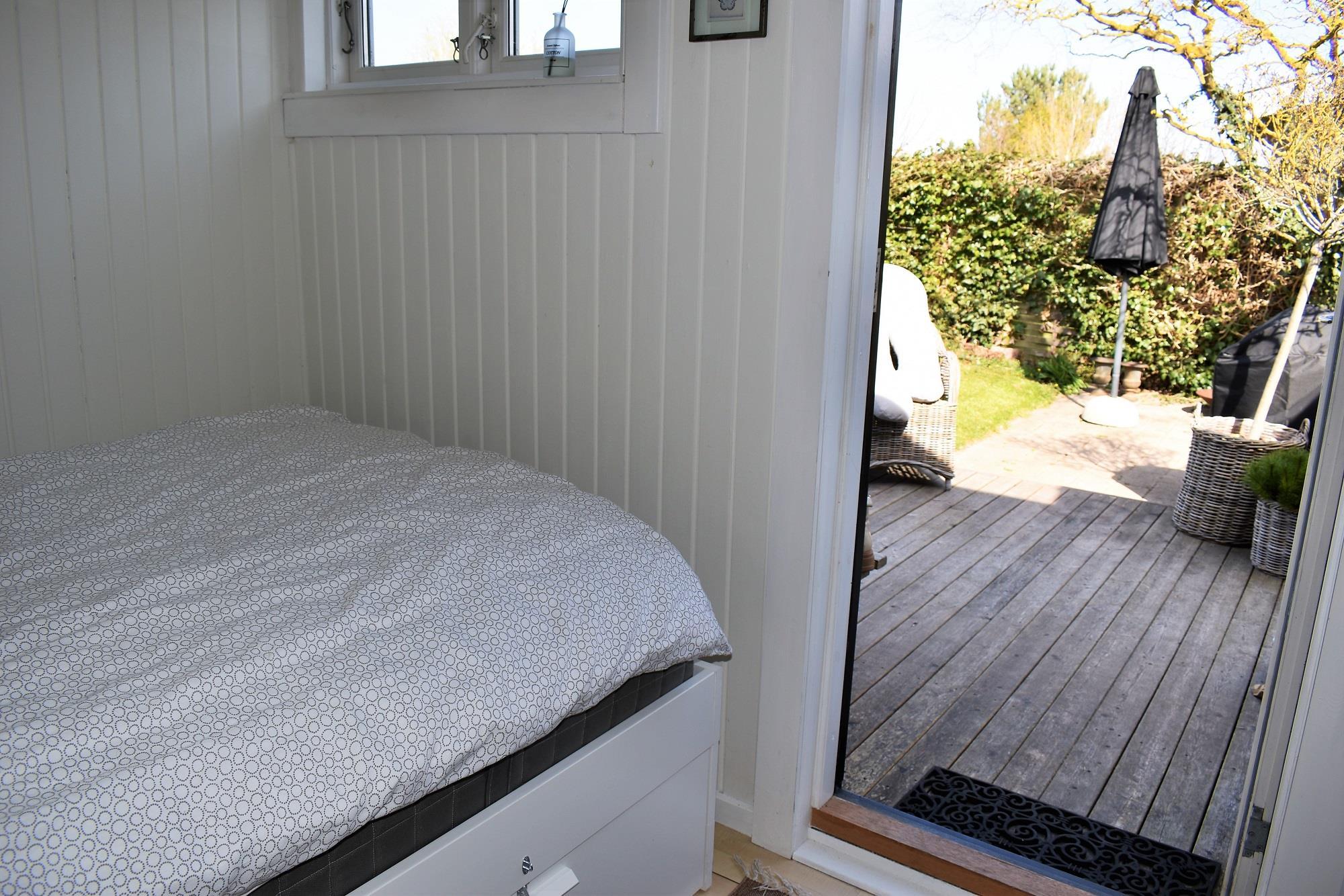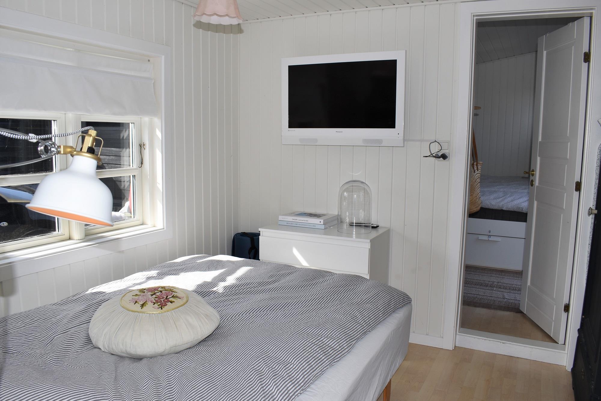 Sommerhuset er indrettet med køkken i åben forbindelse med stuen med brændeovn og energibesparende varmepumpe. Fra stuen er der adgang til et soverum med dobbeltseng (140cm). Husets andet soverum ligger i forlængelse af det første, og er ligeledes indrettet med en dobbeltseng (140cm). Fra det bagerest soverum er der udgang til terrassen. Der er ikke TV i stuen, men TV med chromecast i begge soverum (ingen TV-pakke). Du kan streame fra din mobil eller Ipad via chromecast. Sommerhuset har desuden et nyt, lækkert badeværelse.