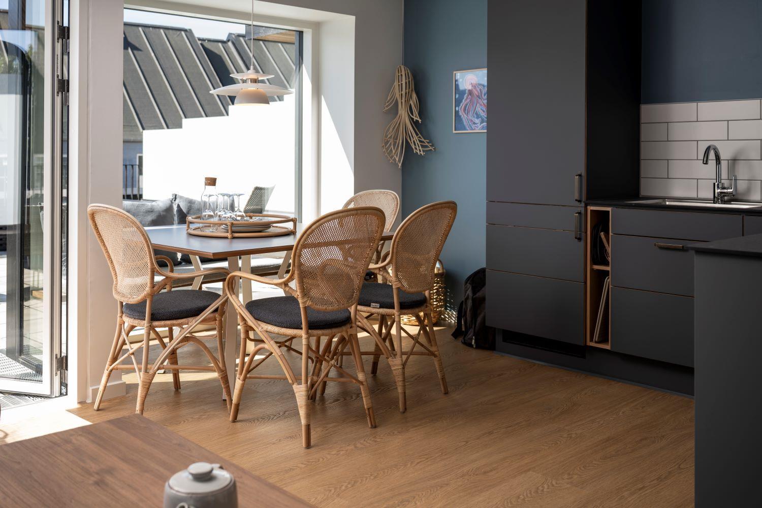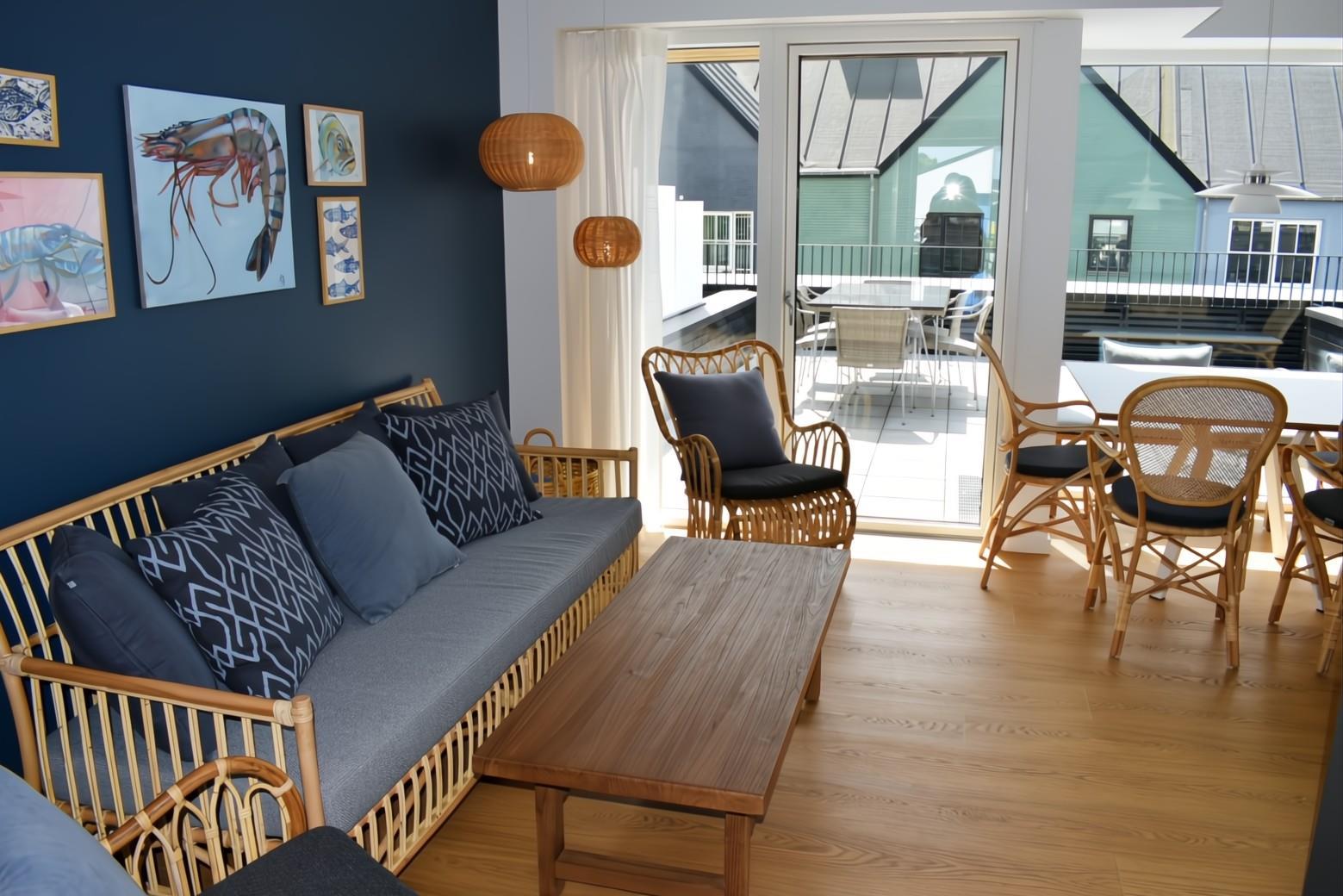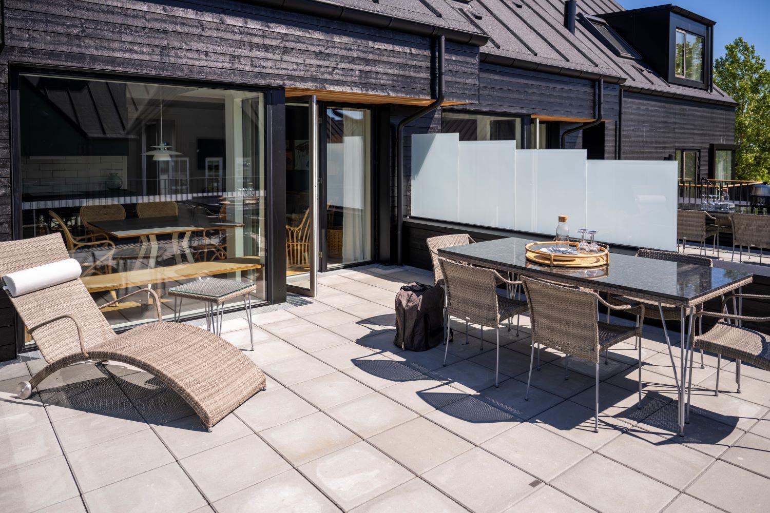 Fra stuen er der udgang til en stor, privat terrasse, hvor komfortable havemøbler indbyder til afslapning og hyggelige stunder. Fra terrassen er der et lille kig til havnen.