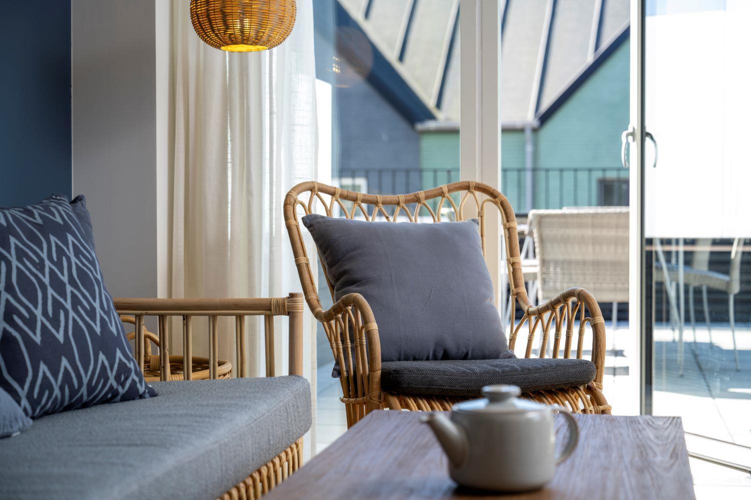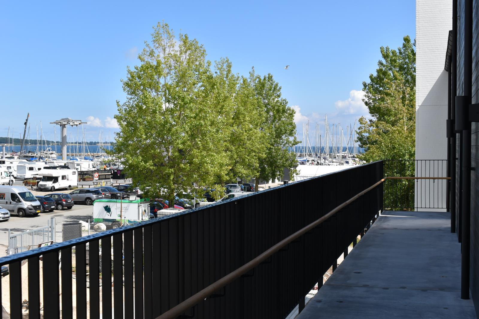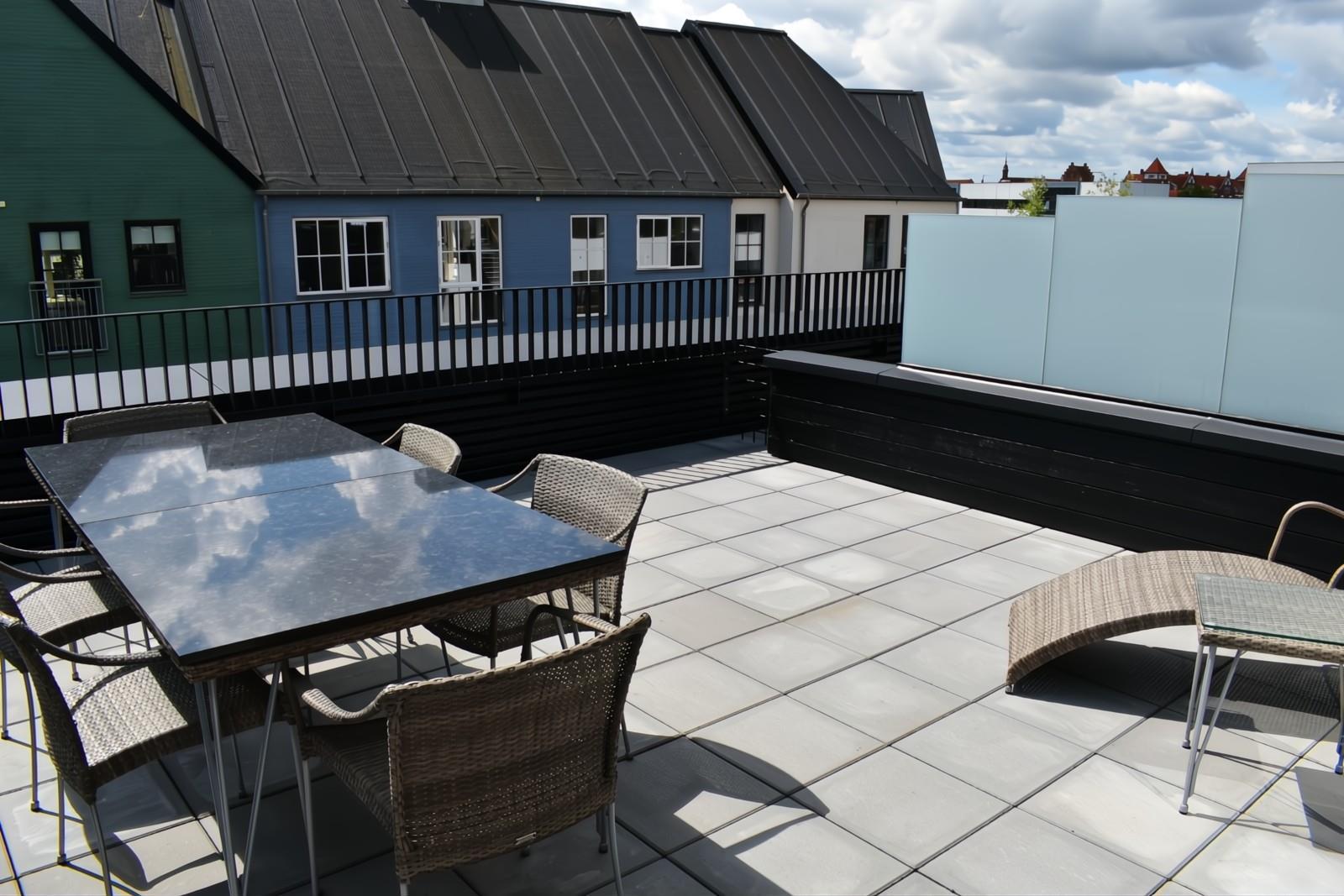 Fra stuen er der udgang til en stor, privat terrasse, hvor komfortable havemøbler indbyder til afslapning og hyggelige stunder. Fra terrassen er der et lille kig til havnen.