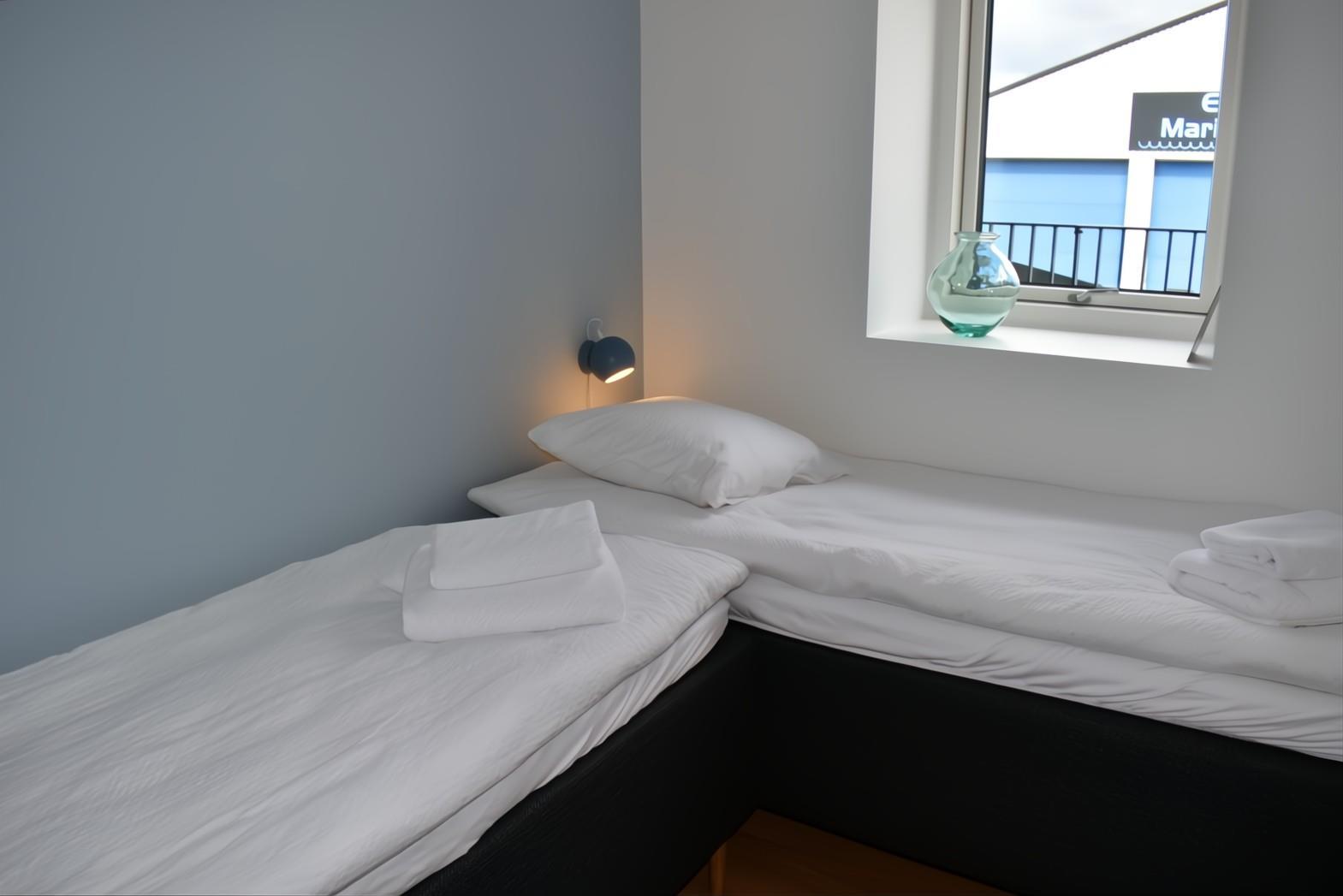 Nyopført og moderne ferielejlighed beliggende ved Kerteminde Havneferie. Lejligheden strækker sig over både 1. og 2. sal og er indrettet med fokus på komfort og kvalitet. På 1. sal finder du en lys stue med smart-TV (kun streaming), et veludstyret køkken, et badeværelse med gulvvarme samt et soveværelse med 2 enkeltsenge. På 2. sal er der endnu et badeværelse med gulvvarme samt to soveværelser med en dobbeltseng i hver.