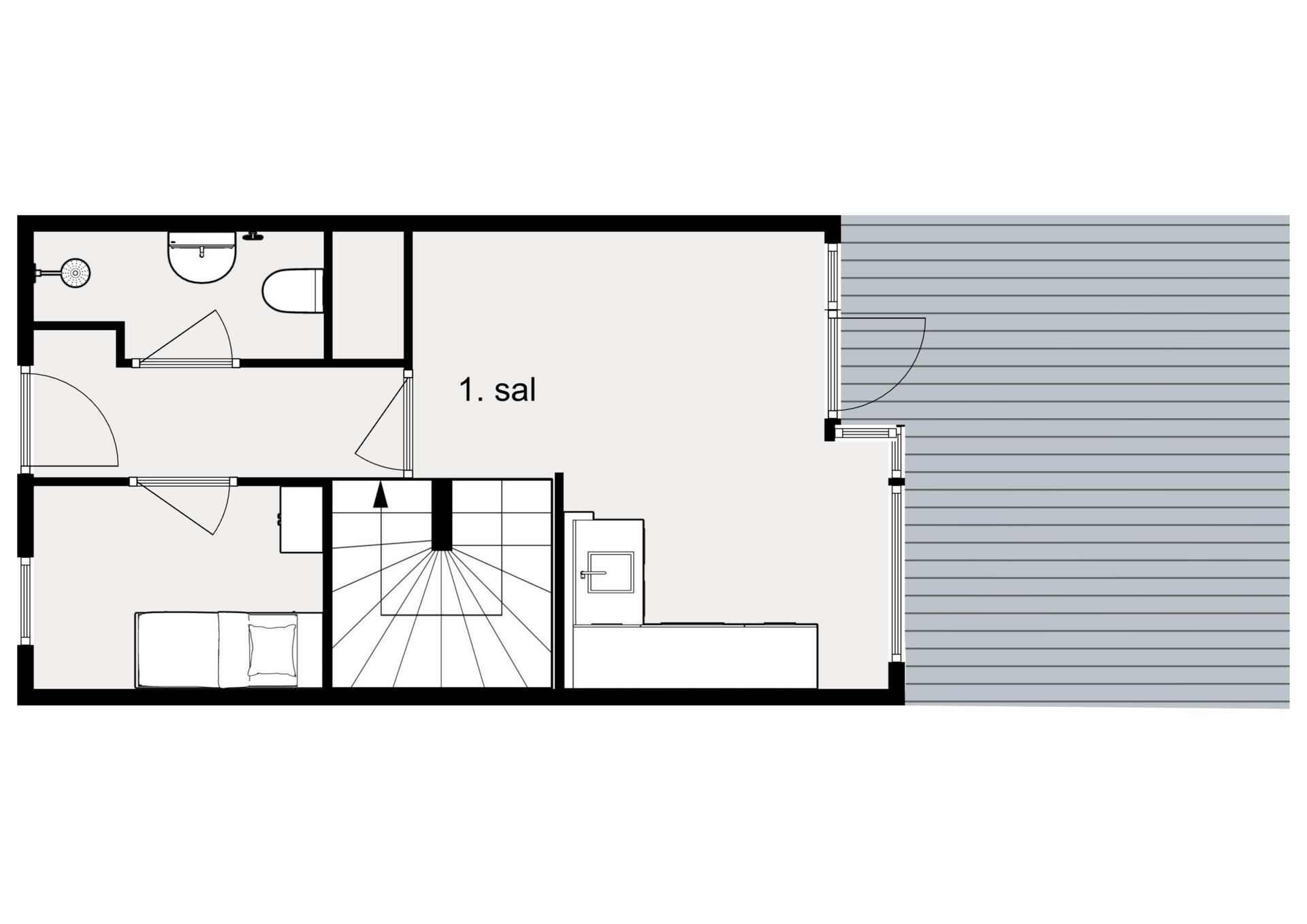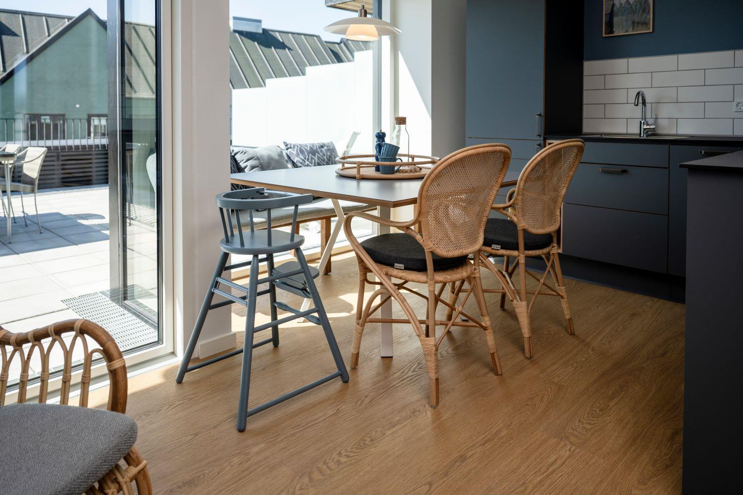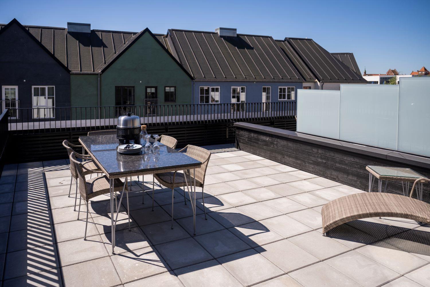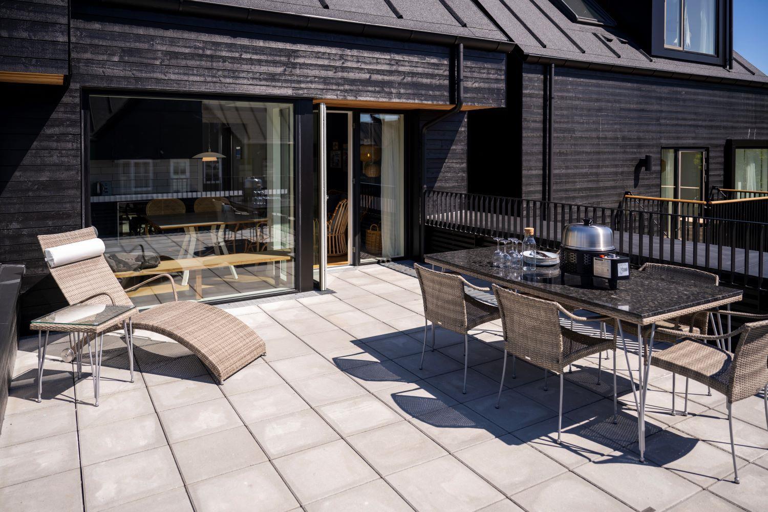 Fra stuen er der udgang til en stor, privat terrasse, hvor komfortable havemøbler indbyder til afslapning og hyggelige stunder. Fra terrassen er der et lille kig til havnen.