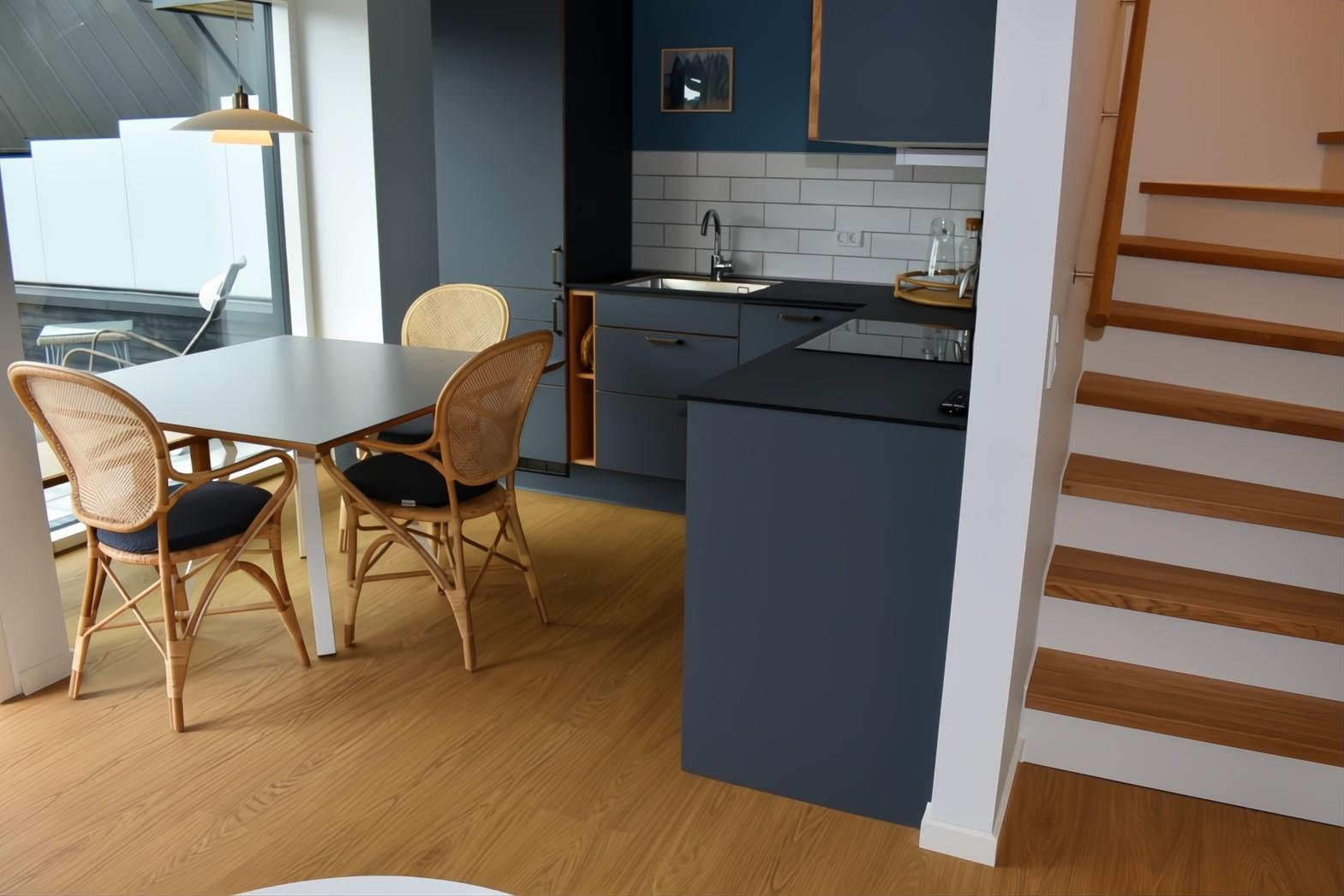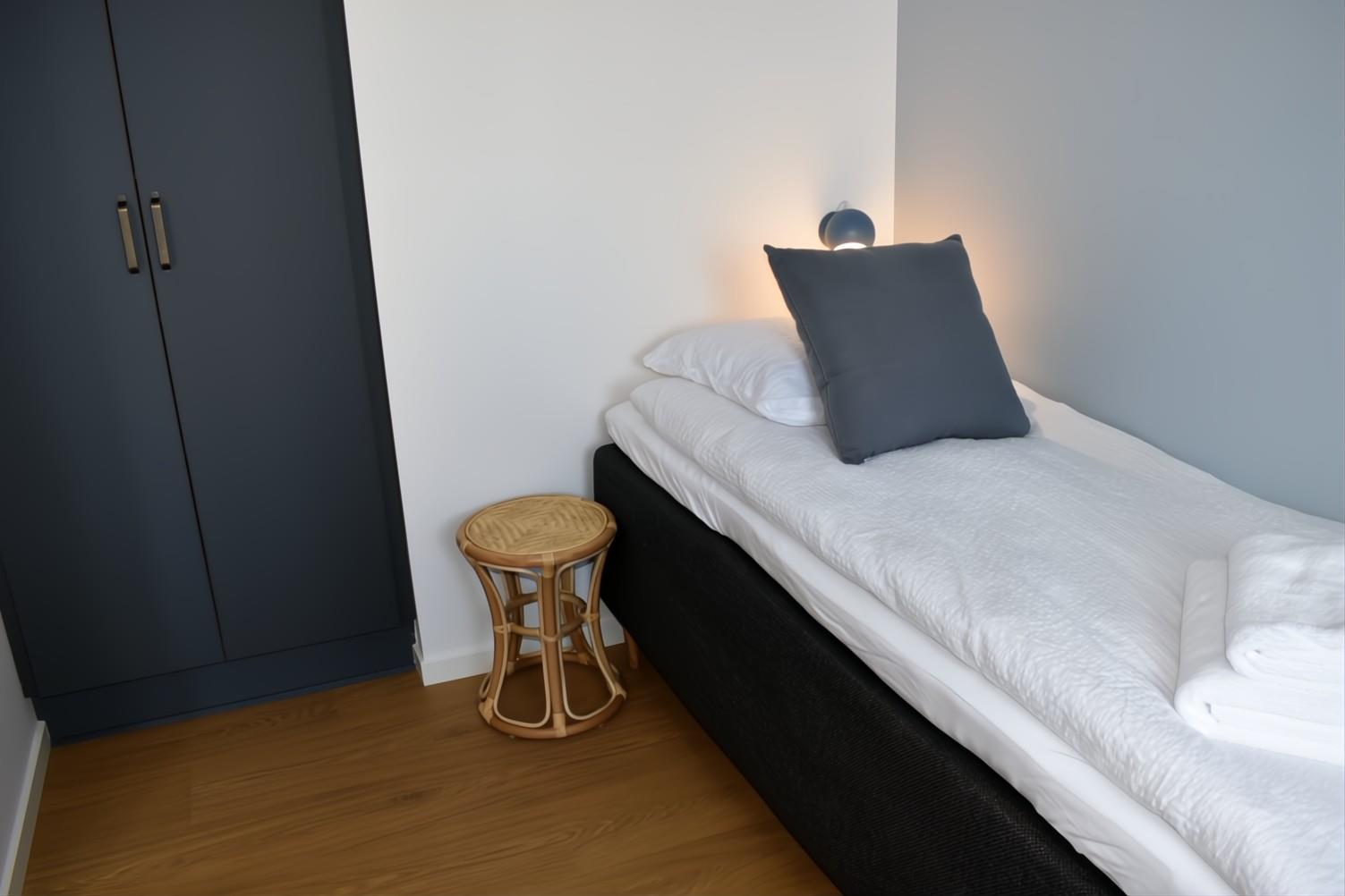 Nyopført og moderne ferielejlighed beliggende ved Kerteminde Havneferie. Lejligheden strækker sig over både 1. og 2. sal og er indrettet med fokus på komfort og kvalitet. På 1. sal finder du en lys stue med smart-TV (kun streaming), et veludstyret køkken, et badeværelse med gulvvarme samt et soveværelse med 1 enkeltseng. På 2. sal er der endnu et badeværelse med gulvvarme samt to soveværelser med en dobbeltseng i hver.