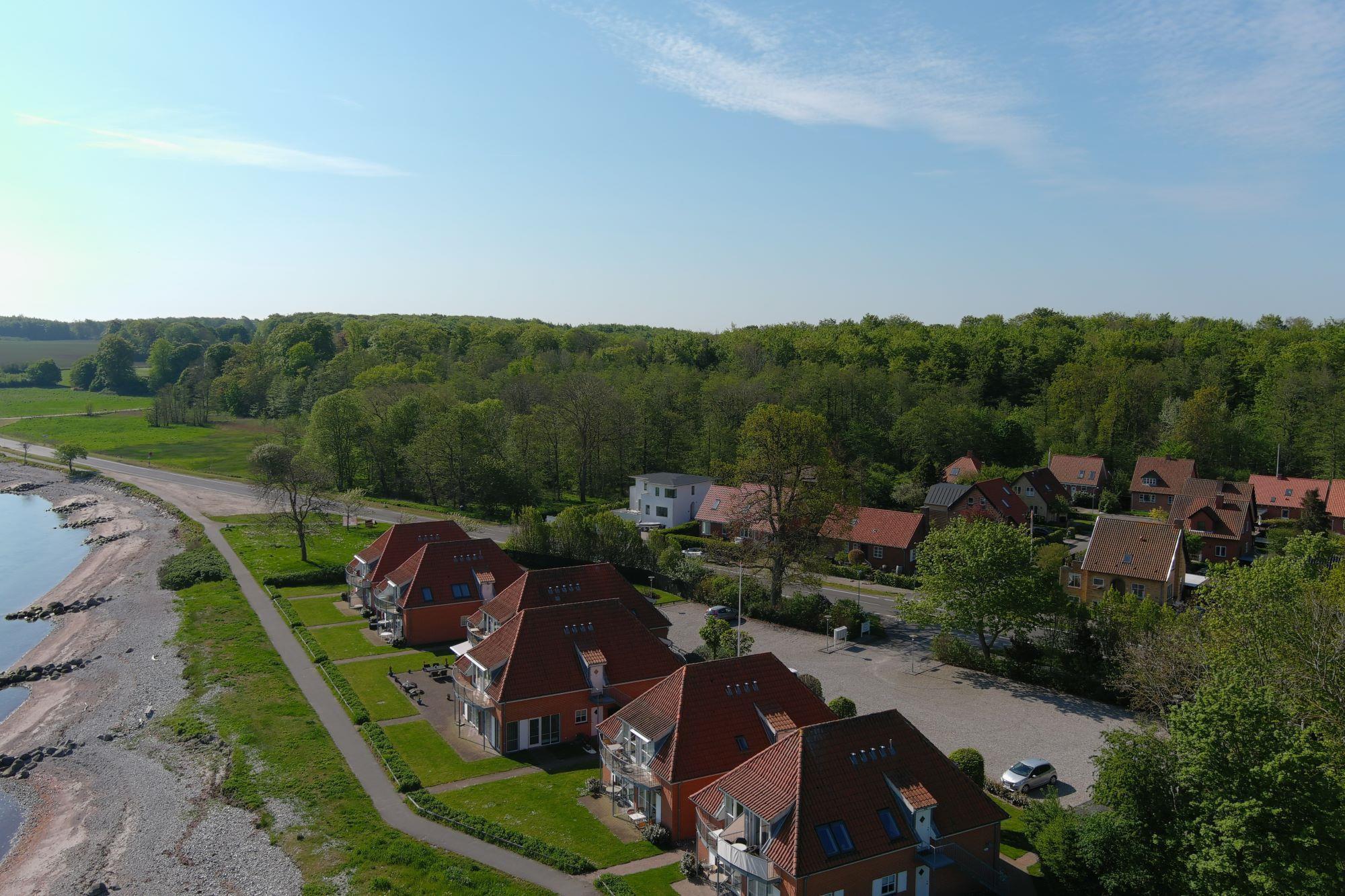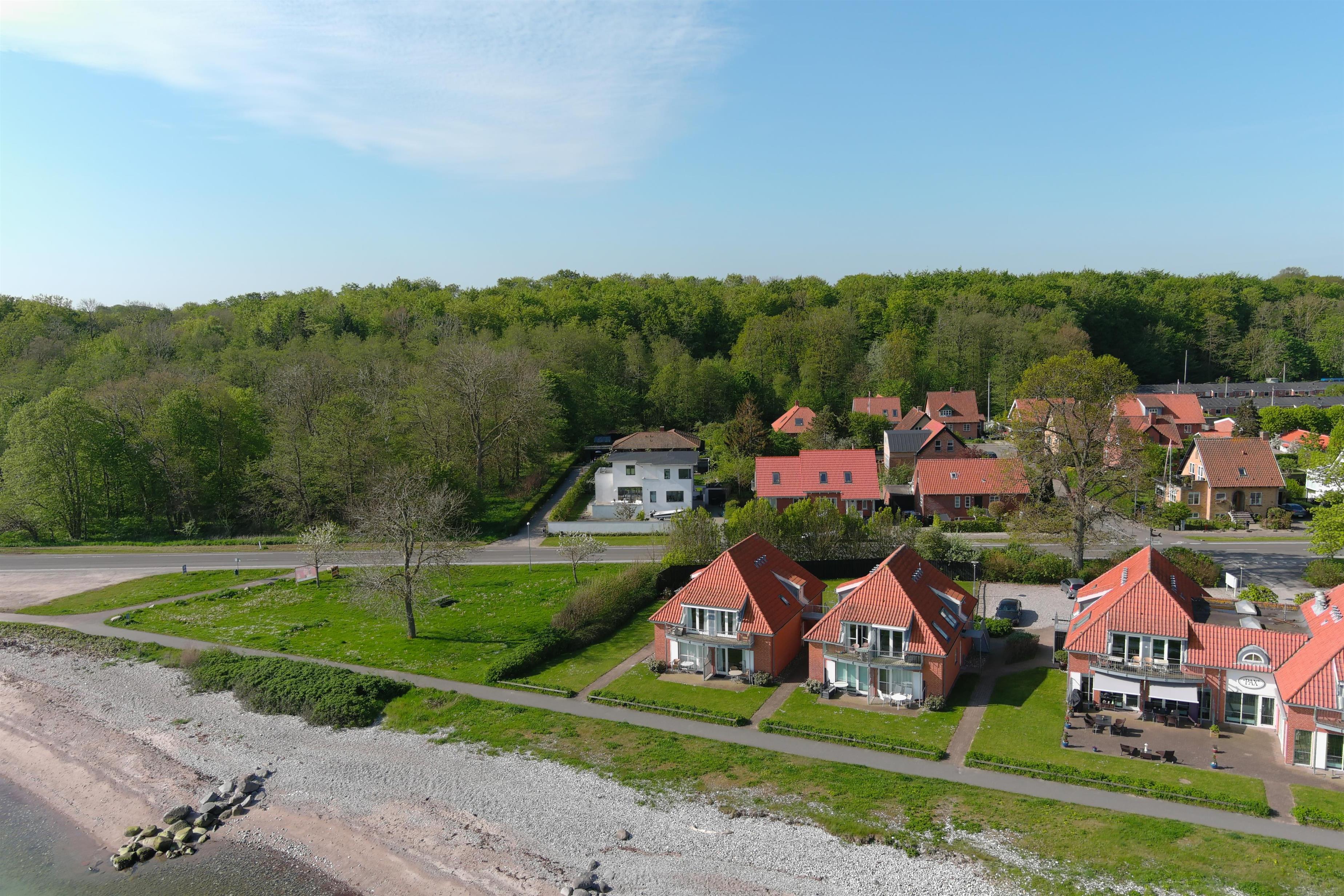 Beliggenheden er ideel for en afslappende ferie, hvor du nemt kan gå en tur langs strandpromenaden til fiskerihavnen og videre ind i byens livlige centrum. Lejligheden ligger desuden tæt på Lundsgaardskoven og Klinten, som er et populært område for dykkere og lystfiskere.