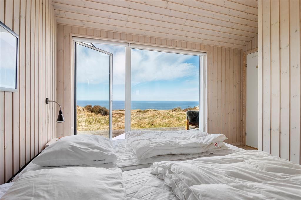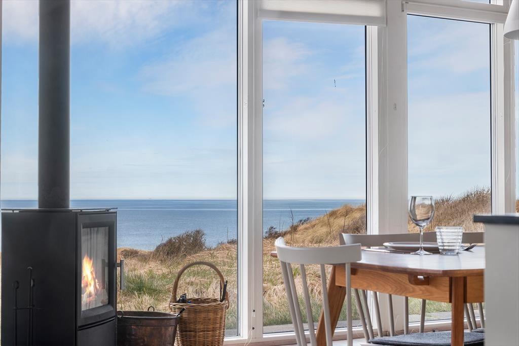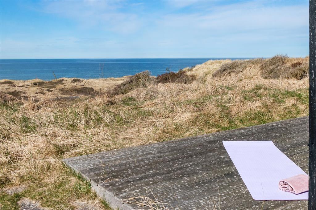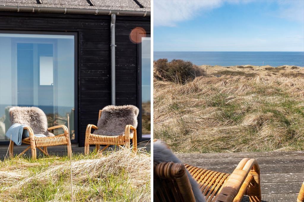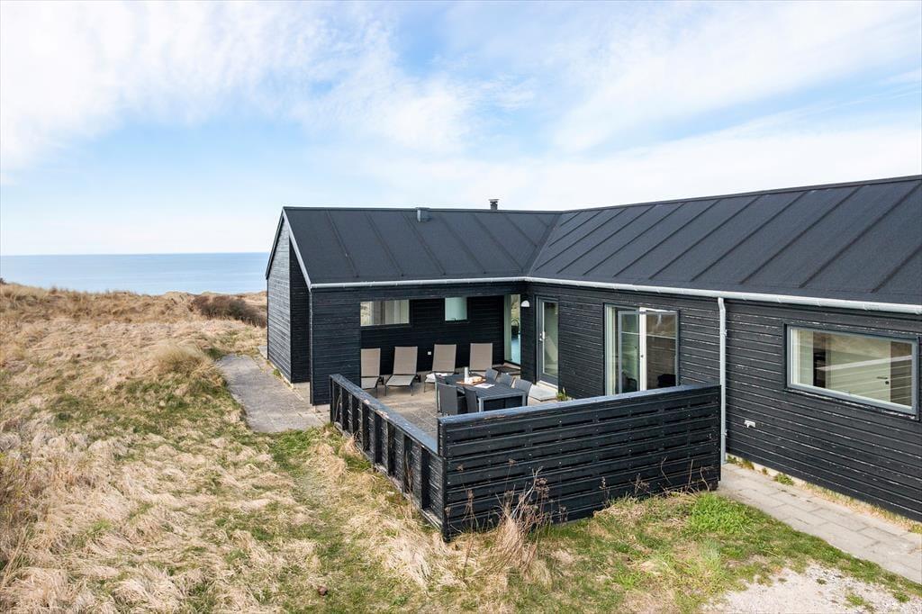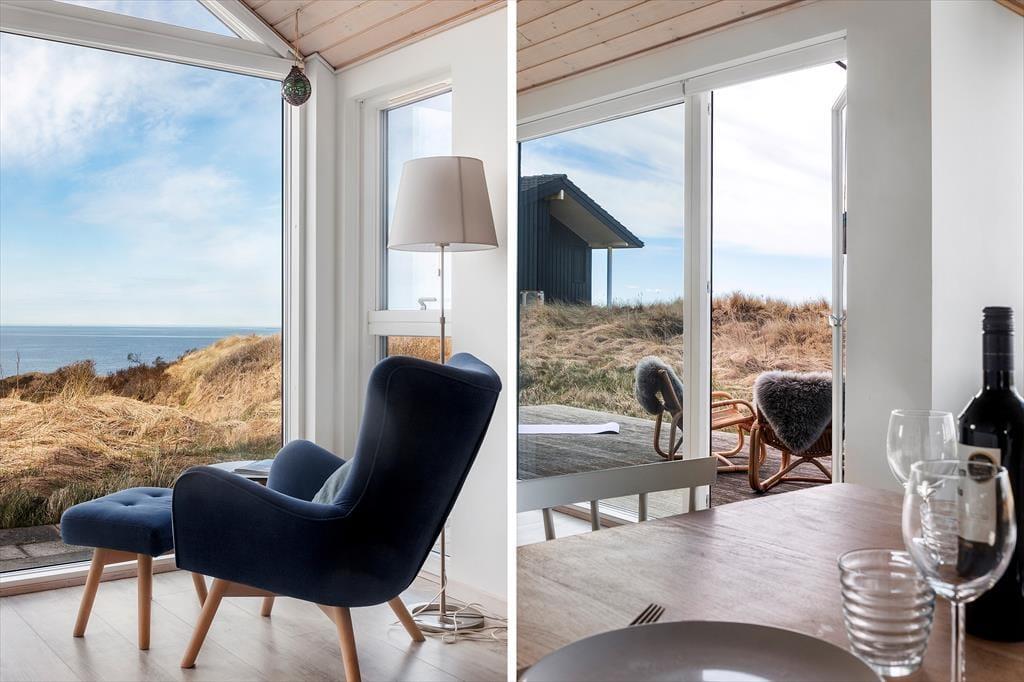 Højtliggende og luksuriøst sommerhus med 180 graders panoramaudsigt over Vesterhavet og klitterne. Huset er eksklusivt indrettet med flot møblement og dertil afstemt udsmykning. Fra husets rummelige og lyse opholdsstue er der på grund af de store glaspartier fuld udsigt over havet og det fantastiske klitlandskab, og dette kan derfor nydes både når der laves mad, hygges ved spisebordet eller slappes af i sofaen eller ved brændeovnens varme. Sommerhuset er godt indrettet med fire soveværelser i hver ende af huset og specielt i det ene mod vest kan man vågne til en herlig udsigt og direkte udgang til terrassen. Her er desuden to badeværelser samt et fint aktivitetsrum. Det er værd at bemærke, at fladskærmen i stuen ikke er tilsluttet antenne, men udelukkende benyttes via Chromecast.
