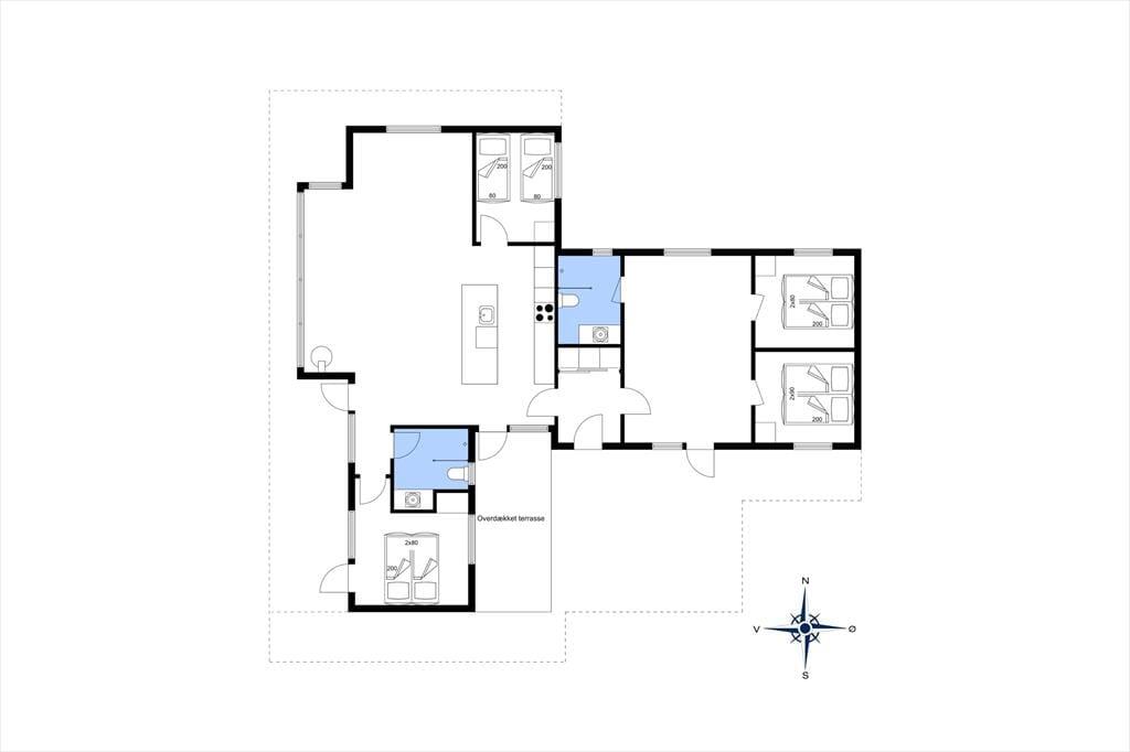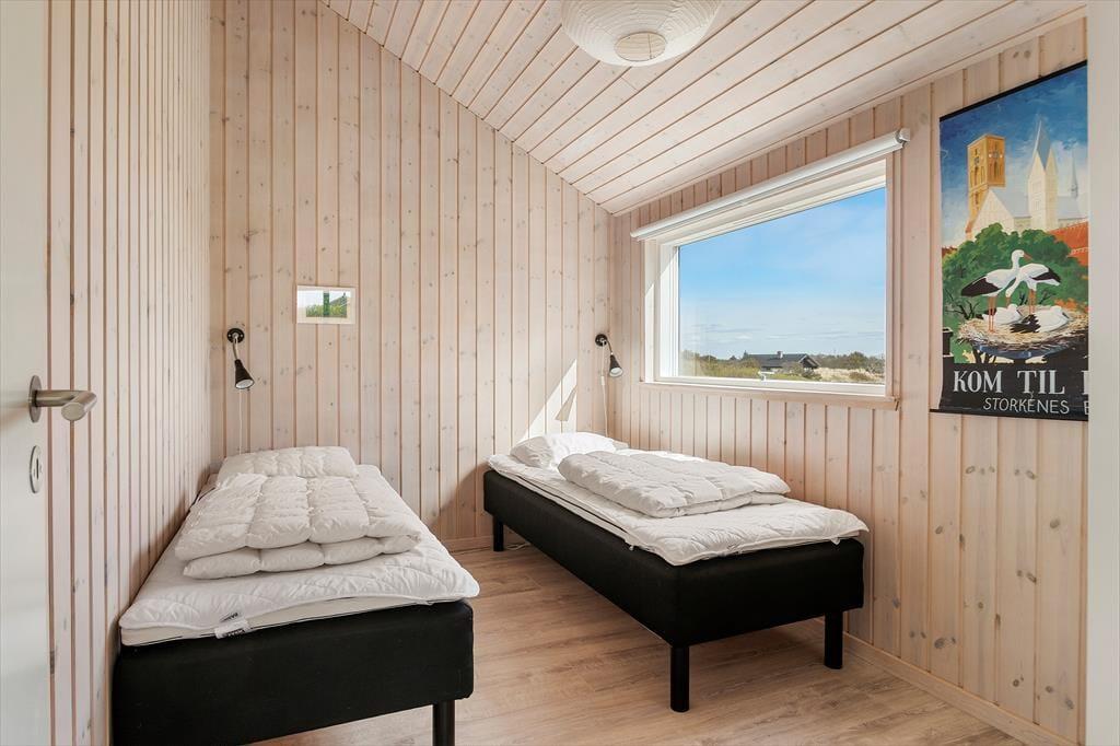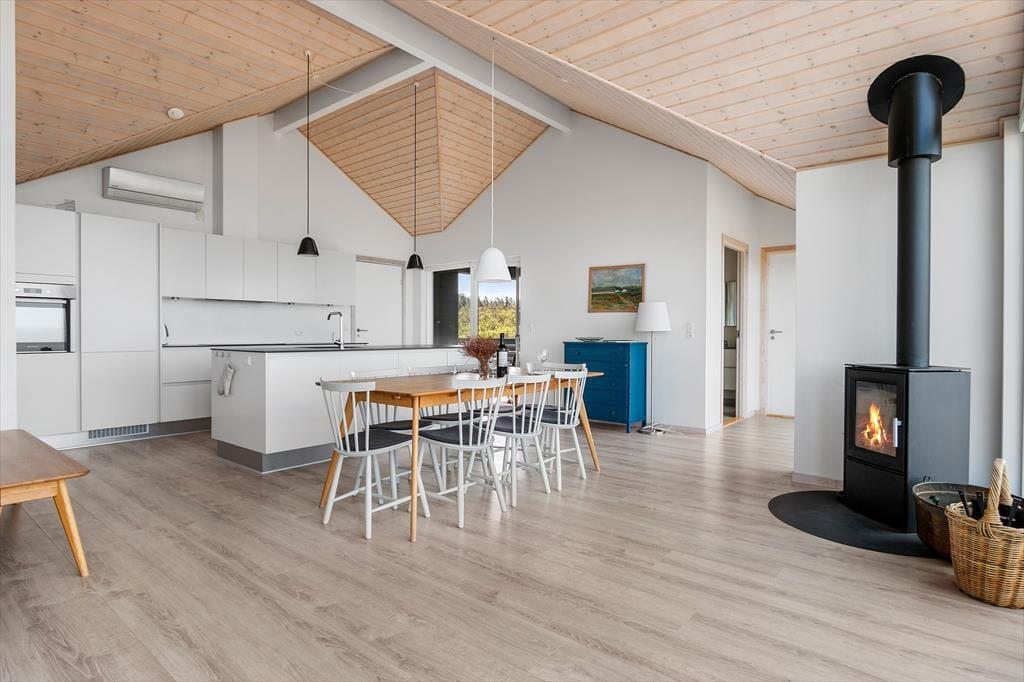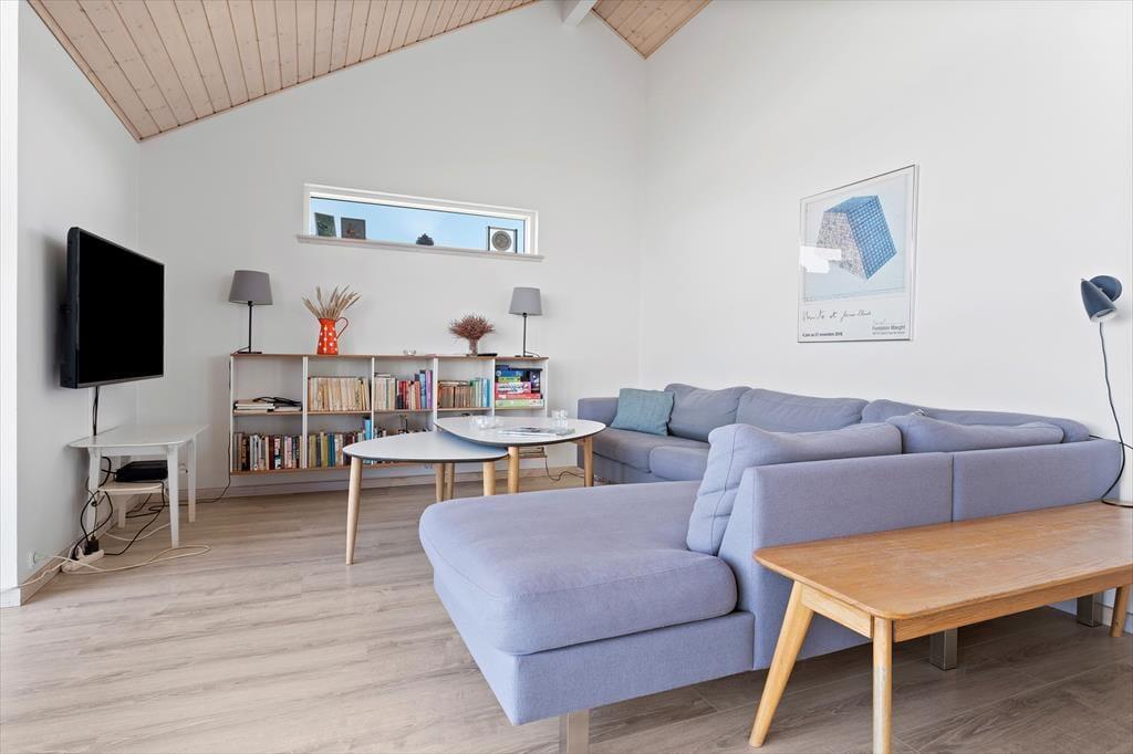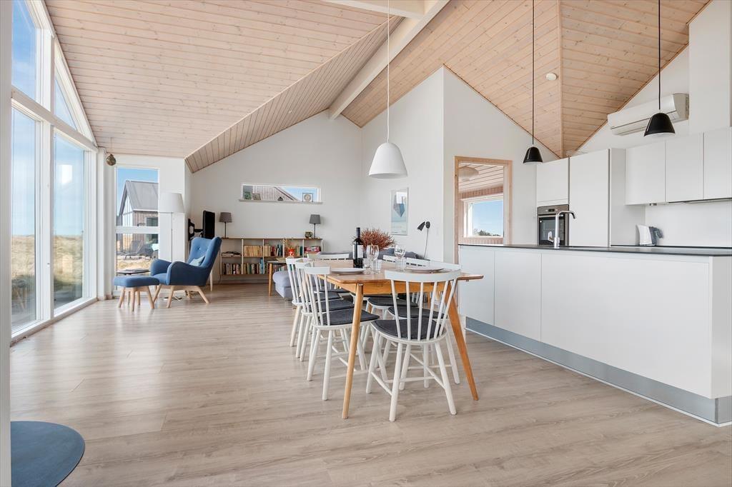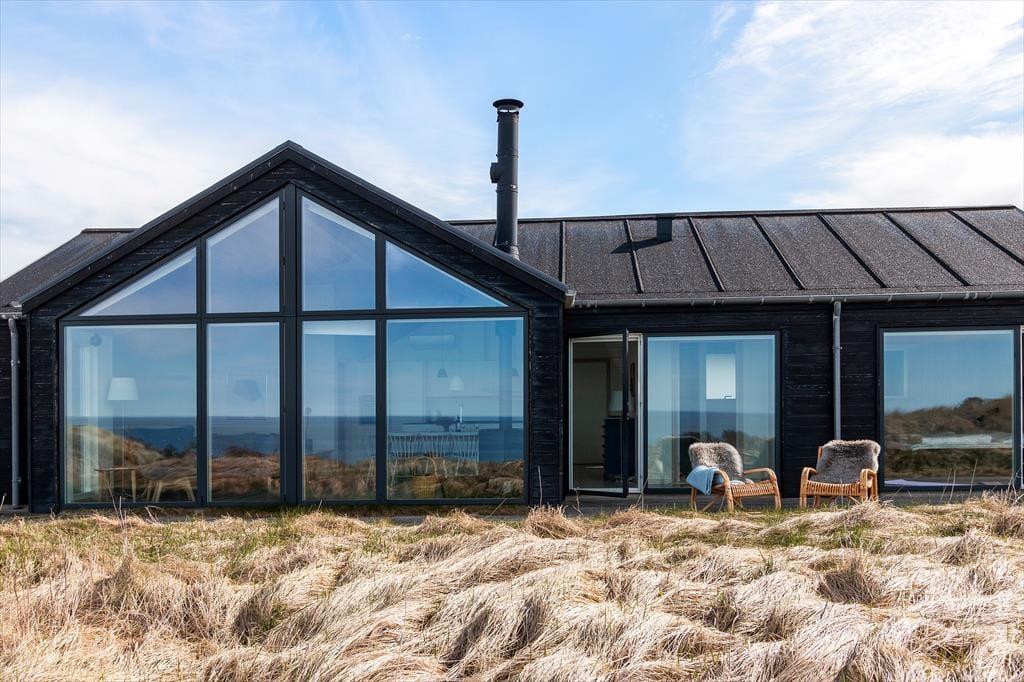Højtliggende og luksuriøst sommerhus med 180 graders panoramaudsigt over Vesterhavet og klitterne. Huset er eksklusivt indrettet med flot møblement og dertil afstemt udsmykning. Fra husets rummelige og lyse opholdsstue er der på grund af de store glaspartier fuld udsigt over havet og det fantastiske klitlandskab, og dette kan derfor nydes både når der laves mad, hygges ved spisebordet eller slappes af i sofaen eller ved brændeovnens varme. Sommerhuset er godt indrettet med fire soveværelser i hver ende af huset og specielt i det ene mod vest kan man vågne til en herlig udsigt og direkte udgang til terrassen. Her er desuden to badeværelser samt et fint aktivitetsrum. Det er værd at bemærke, at fladskærmen i stuen ikke er tilsluttet antenne, men udelukkende benyttes via Chromecast.