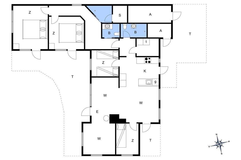 Dette ældre sommerhus entreres i husets delvis renoverede køkkenet. Herfra er der adgang til spisepladsen og stuen som byder på en enestående udsigt over de grøntklædte klitter og Vesterhavet. Her er brændeovn som hurtigt kan skabe varme og hygge når solnedgangen skal nydes gennem de store ruder som lukker lyset ind og giver en god stemning. Huset er velholdt og råder over fire værelser. Fra det ene værelse mod vest skal udsigten igen nævnes og her vågner man op med havudsigt over sine tåspidser. Her er et nyrenoverede badeværelse samt gæstetoilet og ekstra bruser som kan benyttes efter en dejlig tur i saunaen. Generelt et ældre men skønt og hyggeligt feriehus beliggende i fantastisk natur. OBS; Der må ikke medbringes katte i huset!
