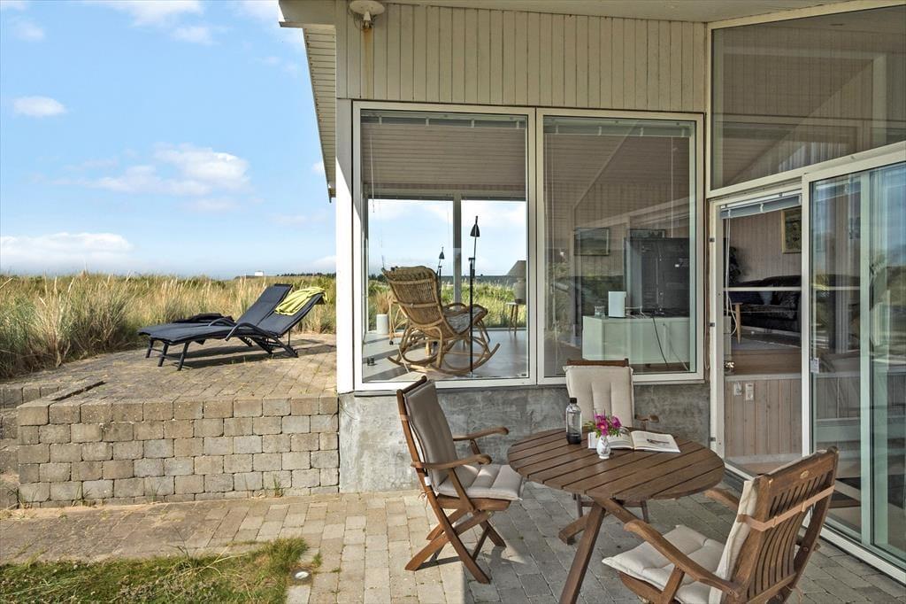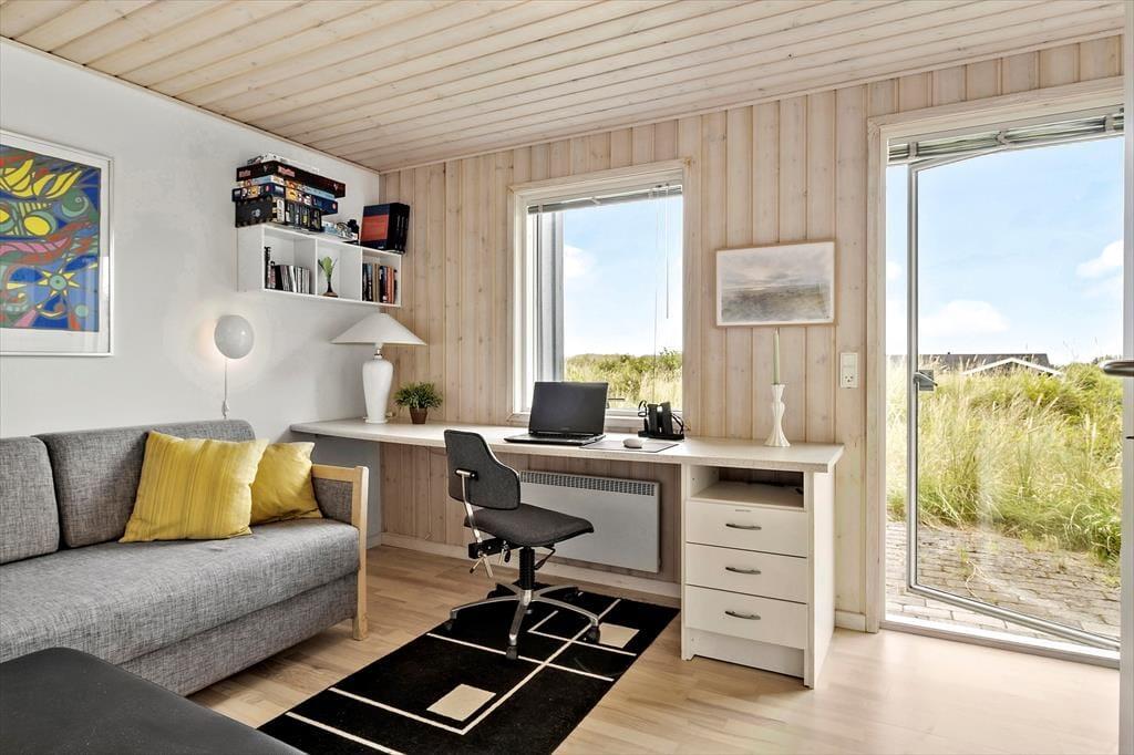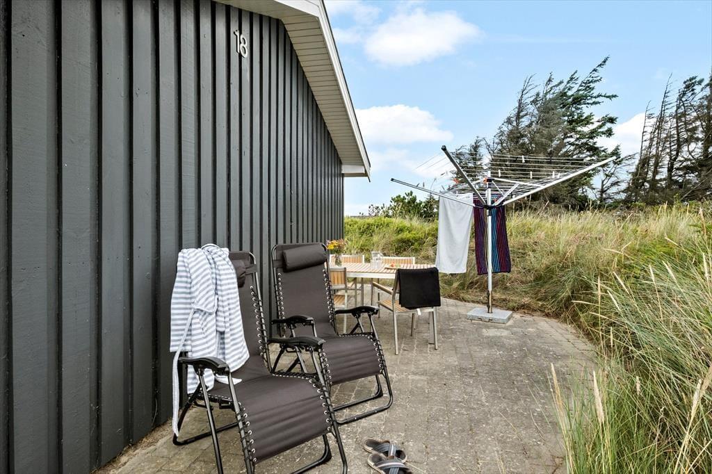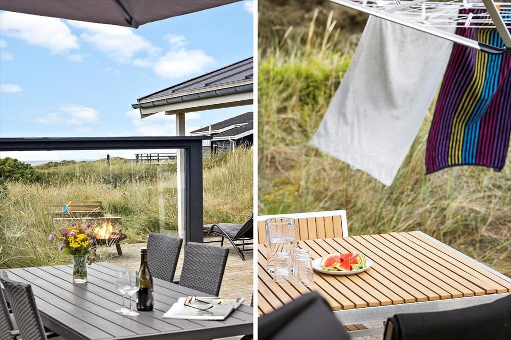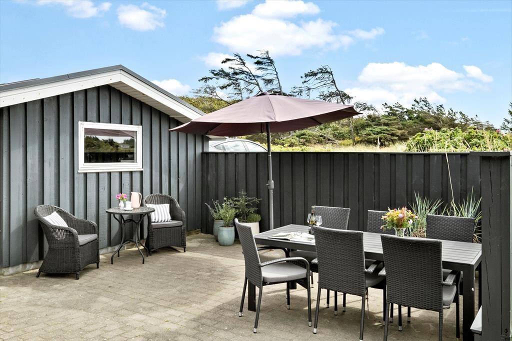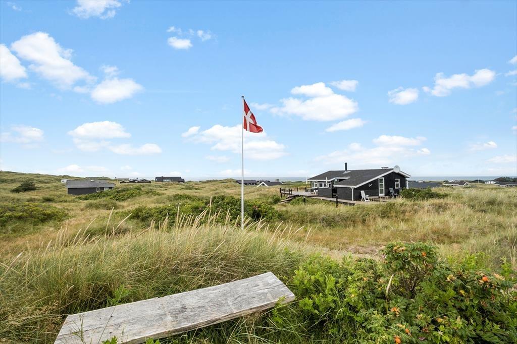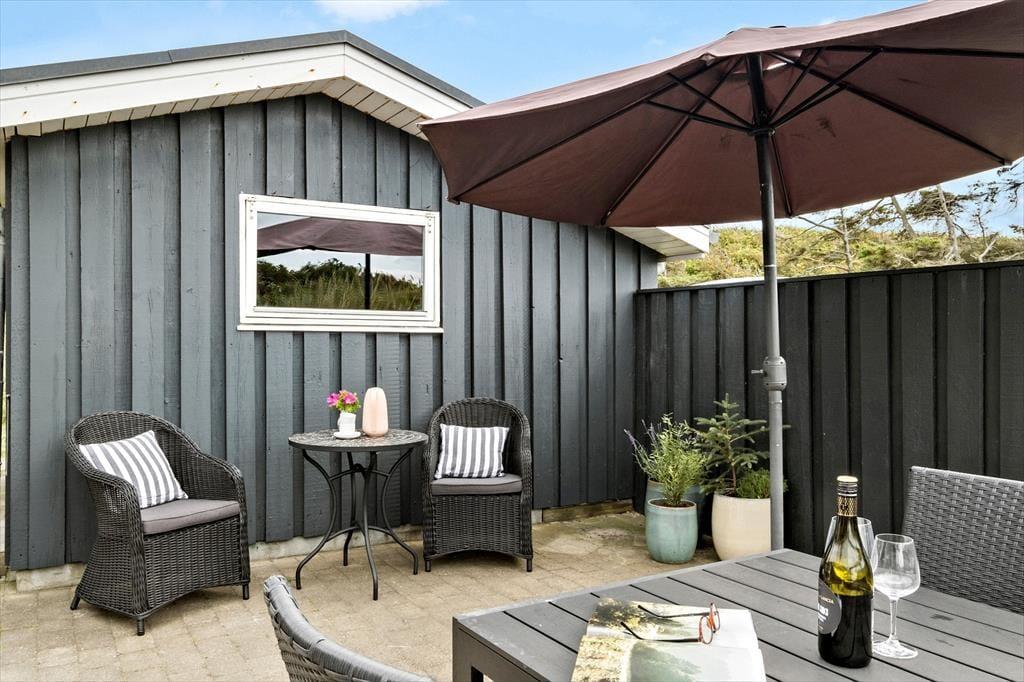 Rundt om sommerhuset er der flere terrasser at vælge imellem. Den ene ligger på samme niveau som stuen, så det er herfra, at udsigten til Vesterhavet er allerbedst – men det er nu også skønt at sidde under overdækningen eller på den sydvendte terrasse, der fremstår som en hyggelig gårdhave og ligger skønt i læ. På den 2620 m2 store naturgrund står der desuden en bænk, som er perfekt til en stille stund, mens I ser solen gå ned og suger naturindtrykkene til jer.