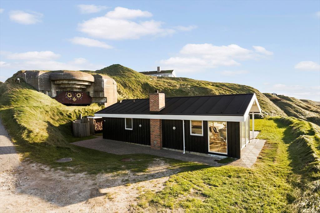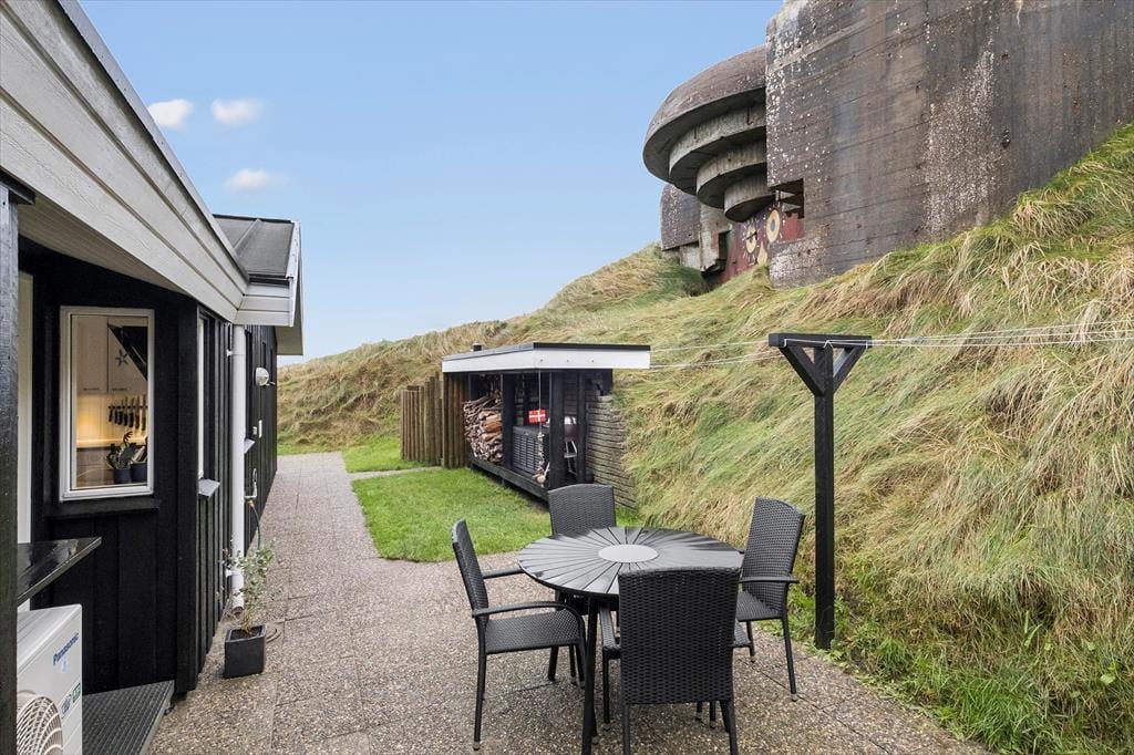 Ude i det fri får I selvfølgelig også rig mulighed for at nyde havudsigten fra den store, højtliggende klitgrund. Rundt om huset byder grunden på en plan græsplæne og flere gode terrassearealer, hvor I kan sole jer, grille eller tage en middagslur i liggestolene. Sydøst for huset kan I finde læ på dage med brise fra vest – og her kan I endda kigge op på noget så spektakulært som en stor bunker, der troner lige over klitgrunden. Husets udendørsfaciliteter tæller også en bruser, så I nemt kan skylle sand og saltvand af, når I vender hjem fra strandturen.