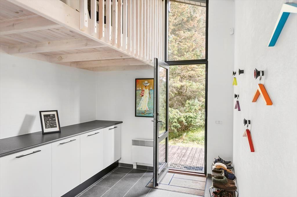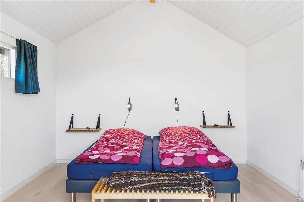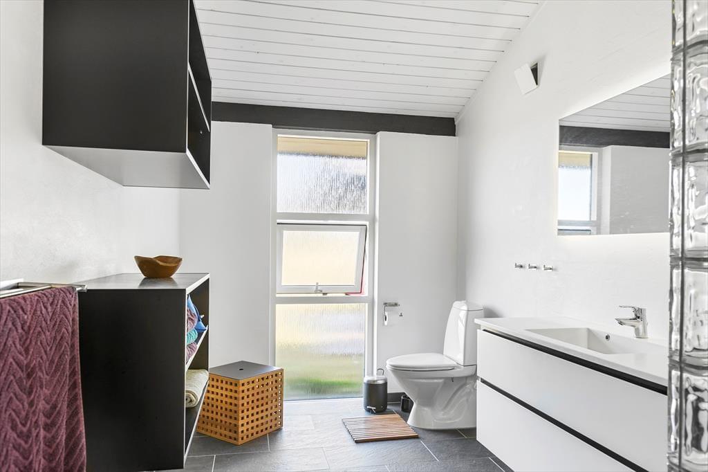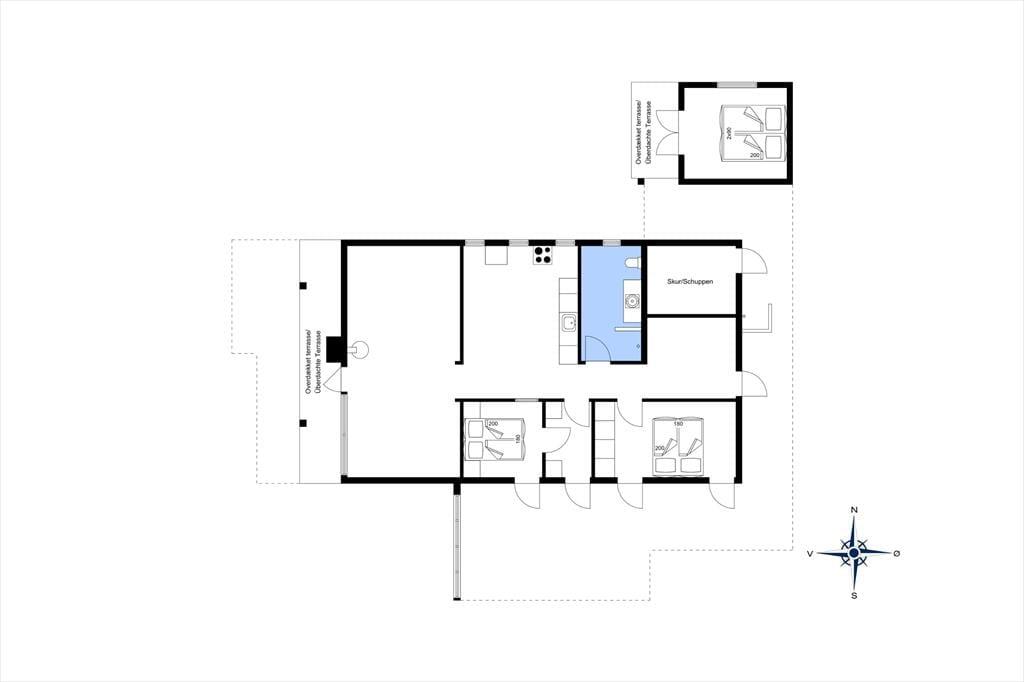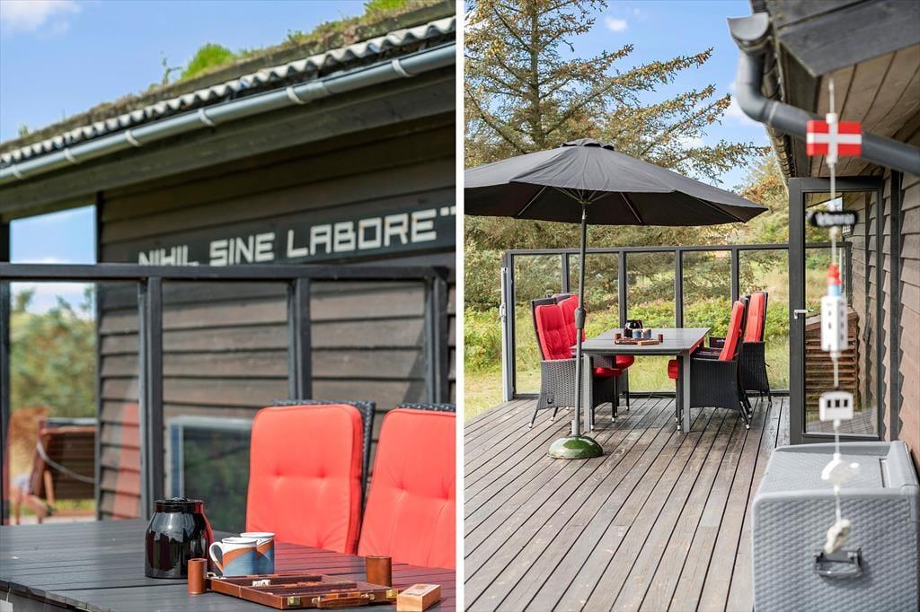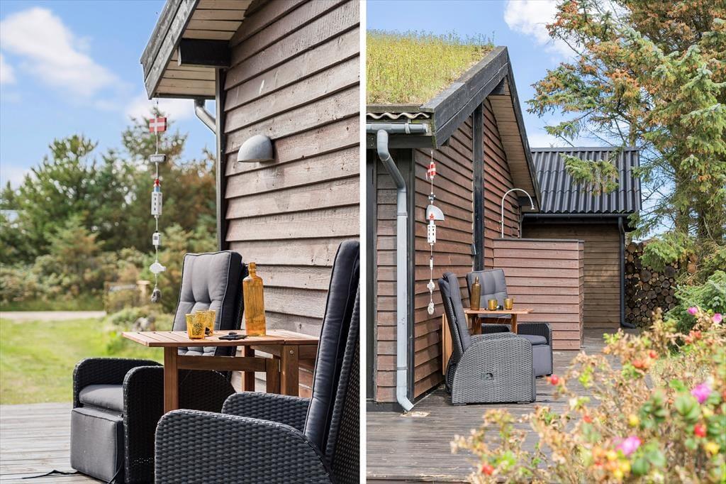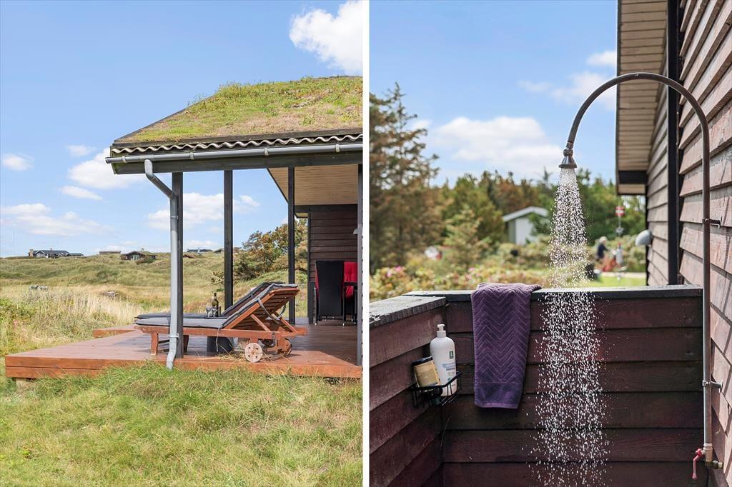 Selvom det er skønt at hygge sig inden døre, er det nu fristende at smutte ud i det fri, så snart solen skinner. Rundt om sommerhuset venter der i hvert fald et skønt terrassemiljø, der byder på mange gode lækroge og opholdspladser. Der er overdækkede arealer i forlængelse af både stuen og annekset, og fra husets to soveværelser har I direkte adgang til en åben og solrig terrasse, der er afskærmet mod vest. Udebruseren kan frit benyttes til et opkvikkende morgenbad såvel som et hurtigt skyl efter strandturen, og husets grill kan oplagt tages i brug, når det er ved at være tid til aftensmad.