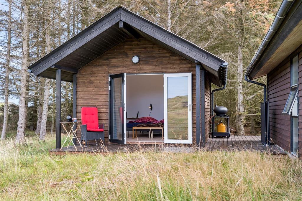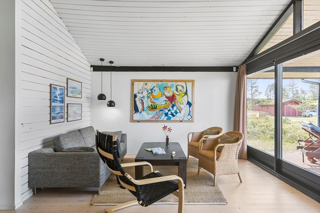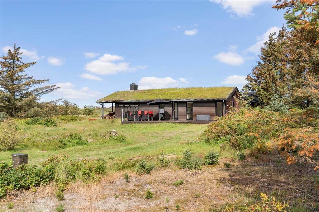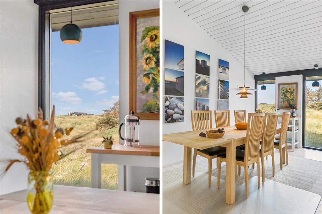 Med sin brune træfacade og sit grønne tag passer sommerhuset godt ind i de naturskønne omgivelser. Inden døre fremstår alle rum lyse og indbydende, for hvid er den gennemgående farve på væggene, loftet er ført op til kip, og møblementet er både pænt og komfortabelt. Og gennem vinduerne kan I se ud på det bølgende klitlandskab, hvilket er en skøn påmindelse om, at I er på ferie langt væk fra hverdagens rutiner. I den ene ende af huset ligger spisekøkkenet og stuen i åben forbindelse, så I er tæt på hinanden – også selvom nogle af jer kræser om madlavningen og andre spiller kort eller ser tv nær brændeovnen. Brusebadeværelset er dejligt rummeligt, og de to soveværelser er begge udstyret med gode senge og garderobeskabe. Annekset er også et rart sted at sove, og alt i alt er der sengepladser til seks personer.