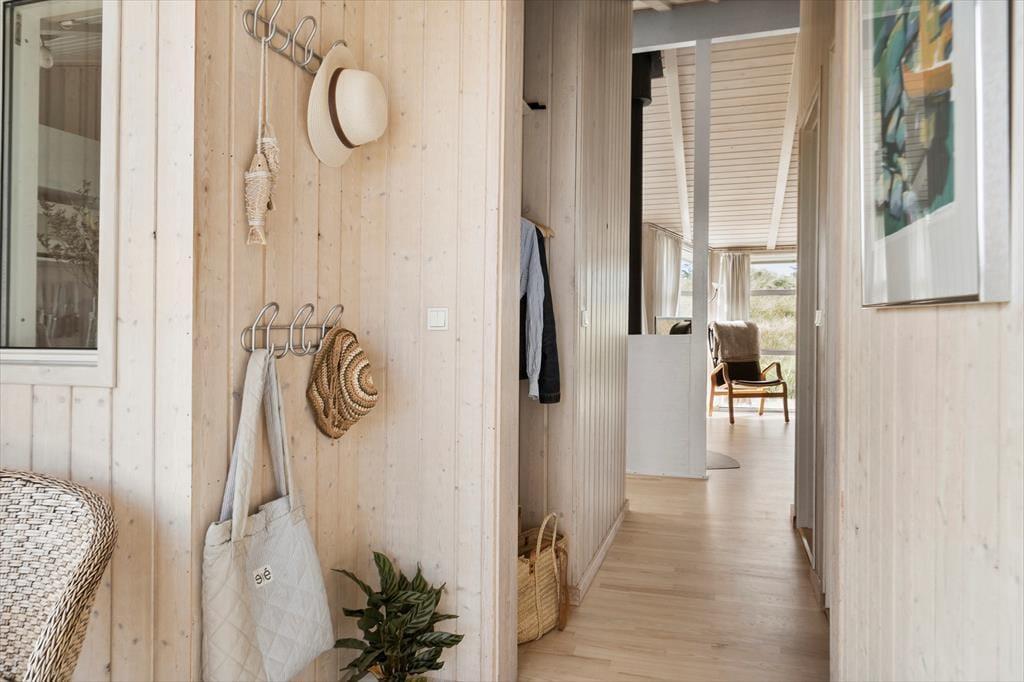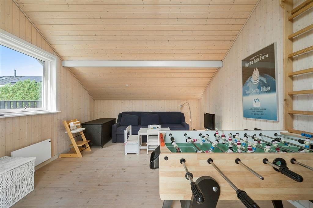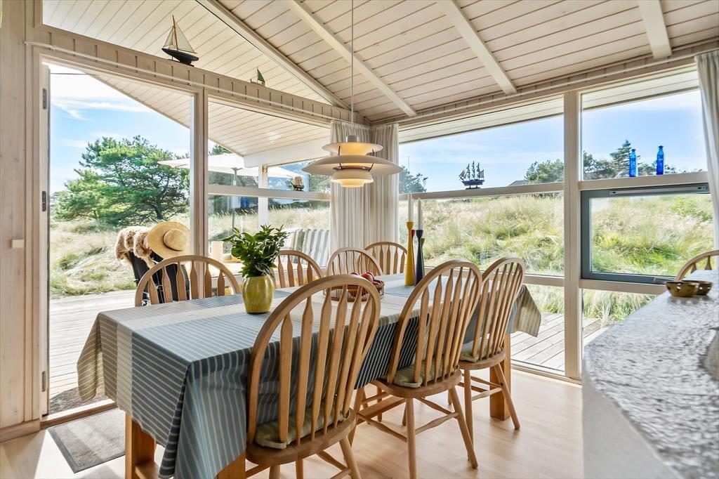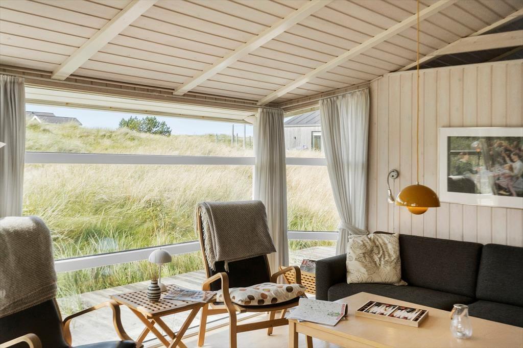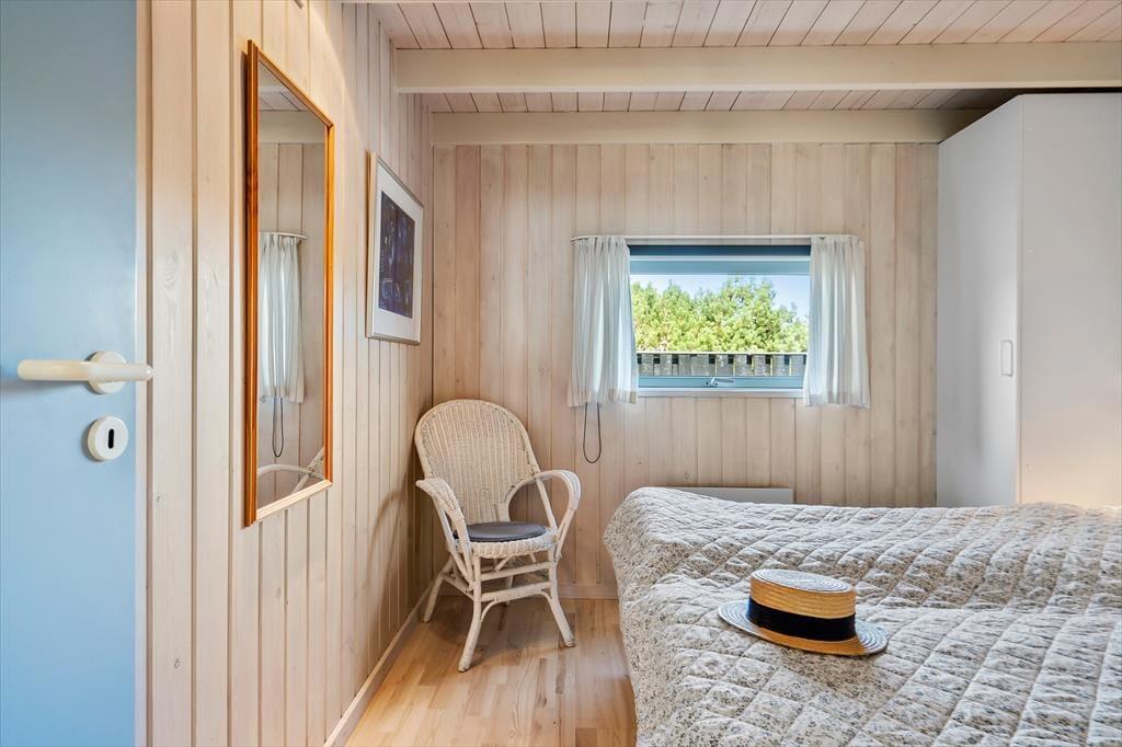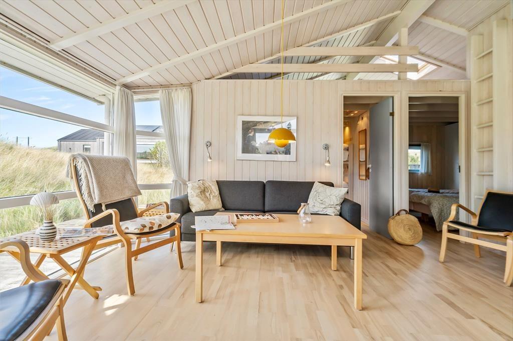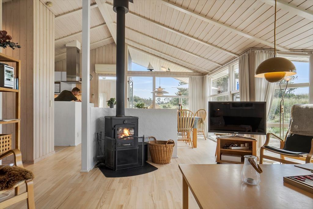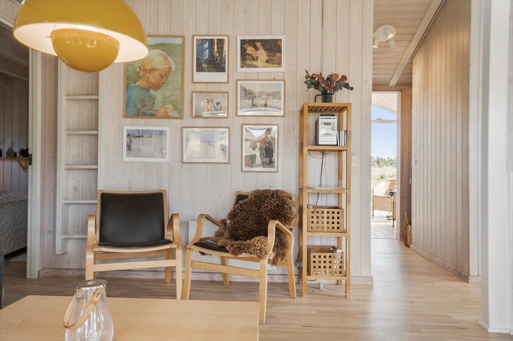 Inden døre kan du se lige ud på bølgende marehalm og spredte fyrretræer under den høje himmel, så selv når du er inden døre, kan du mærke nærheden til naturen. På typisk sommerhusmanér er der lys træbeklædning og loft til kip, og en brændeovn hører selvfølgelig også til i stuen – foruden en stige, der fører op til en hems, hvor børnene kan lege eller måske endda overnatte. Det lyse og rummelige hus byder for øvrigt på tre gode soveværelser, et gæstetoilet og et badeværelse, og sidstnævnte skal du især lægge mærke til, hvis du er vild med wellness, for her er der spabad og sauna. Det tilhørende anneks kan bruges til flere ting: Bordfodboldbordet og tv’et kan underholde familien, og sovesofaen kan bruges som ekstra soveplads for to personer. Derudover er der et skrivebord med to kontorstole, hvis nogen har lyst til at spille computer eller har behov for at fordybe sig i arbejde.