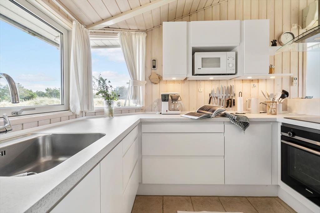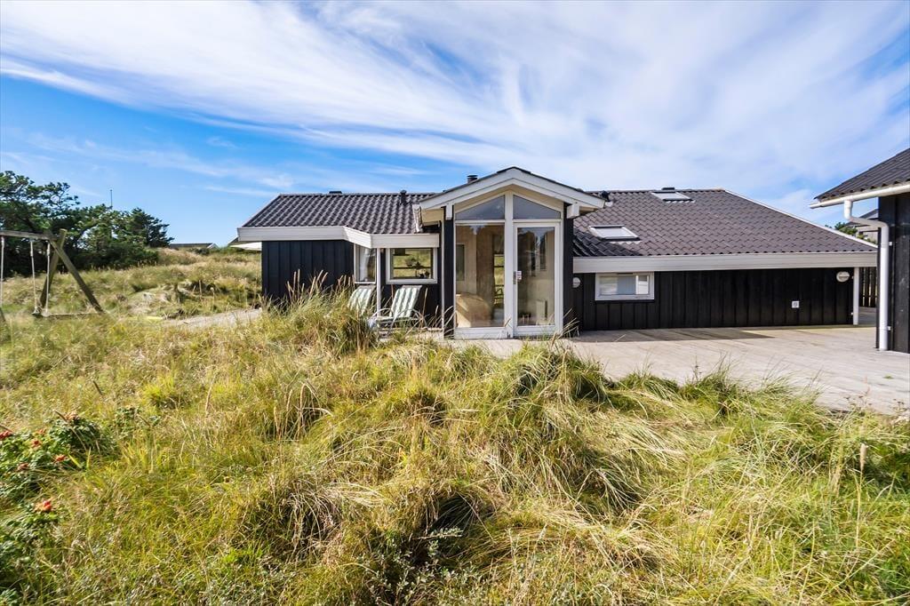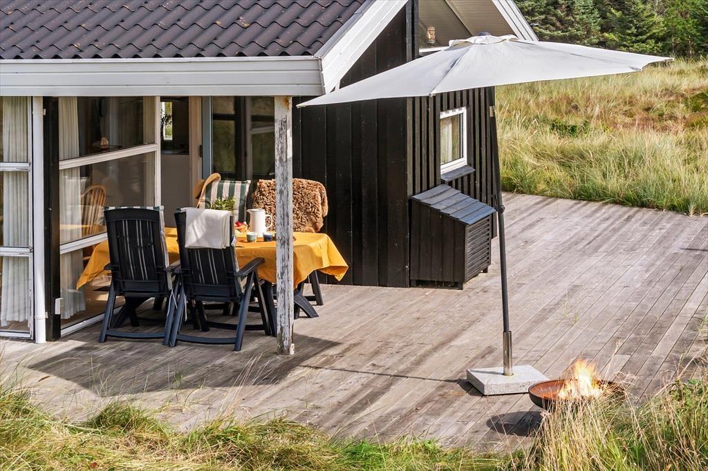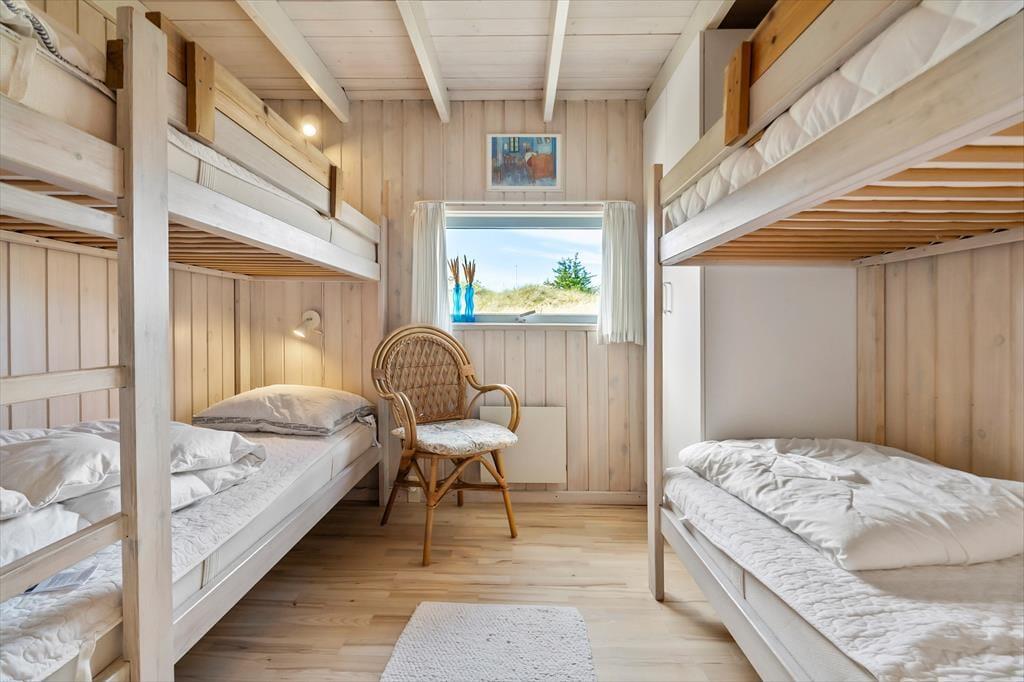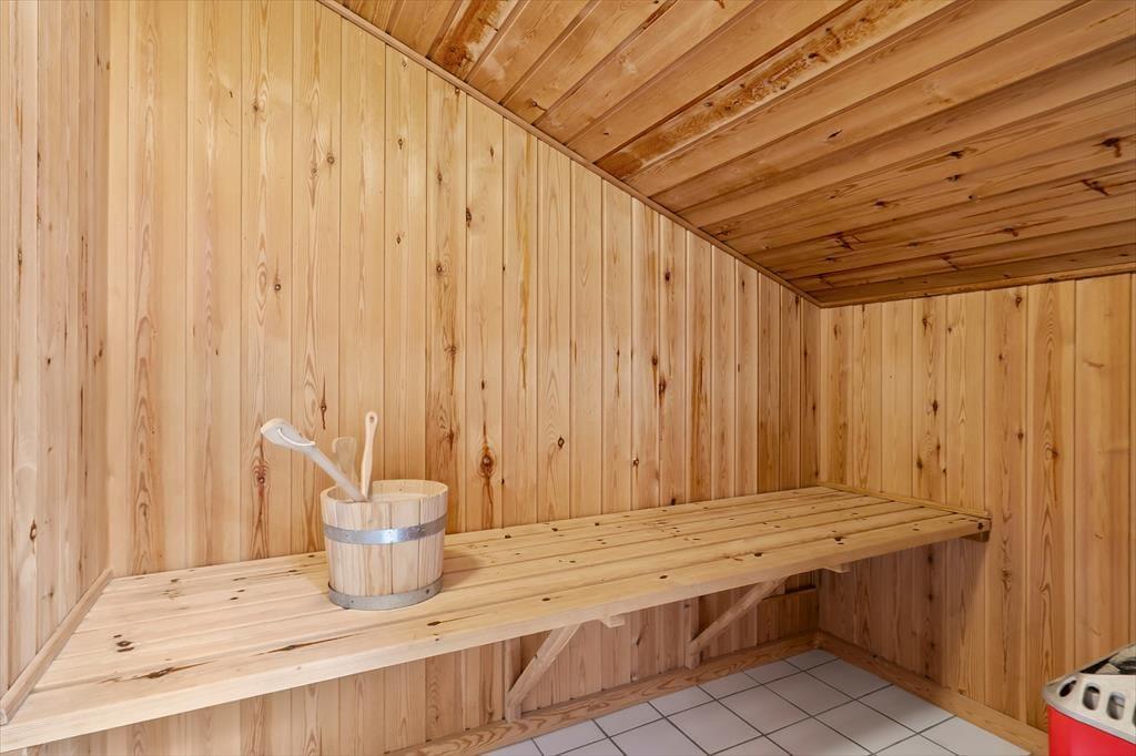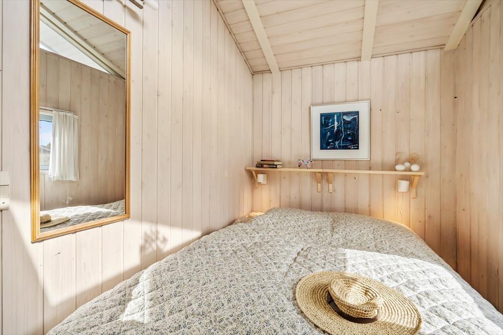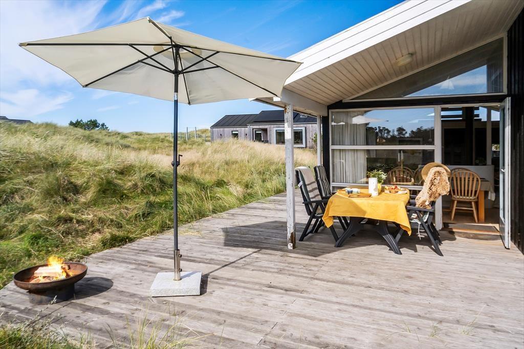 Inden døre kan du se lige ud på bølgende marehalm og spredte fyrretræer under den høje himmel, så selv når du er inden døre, kan du mærke nærheden til naturen. På typisk sommerhusmanér er der lys træbeklædning og loft til kip, og en brændeovn hører selvfølgelig også til i stuen – foruden en stige, der fører op til en hems, hvor børnene kan lege eller måske endda overnatte. Det lyse og rummelige hus byder for øvrigt på tre gode soveværelser, et gæstetoilet og et badeværelse, og sidstnævnte skal du især lægge mærke til, hvis du er vild med wellness, for her er der spabad og sauna. Det tilhørende anneks kan bruges til flere ting: Bordfodboldbordet og tv’et kan underholde familien, og sovesofaen kan bruges som ekstra soveplads for to personer. Derudover er der et skrivebord med to kontorstole, hvis nogen har lyst til at spille computer eller har behov for at fordybe sig i arbejde.
