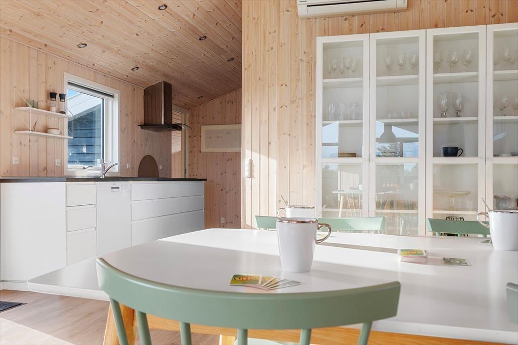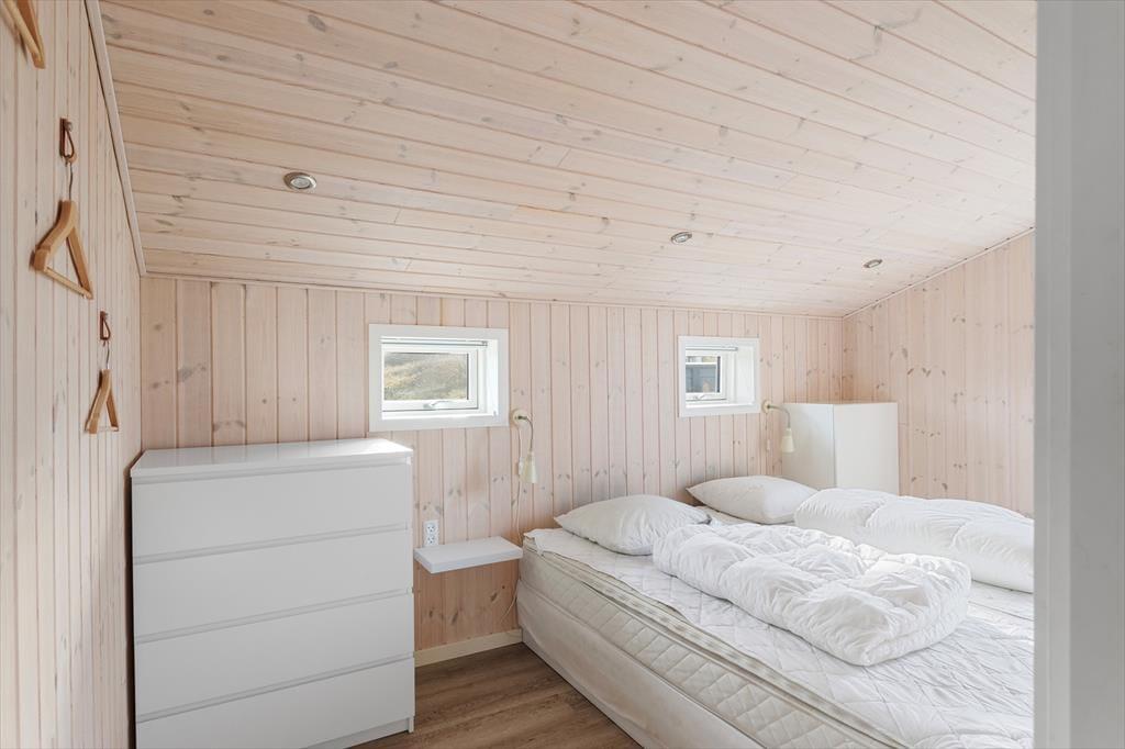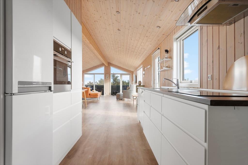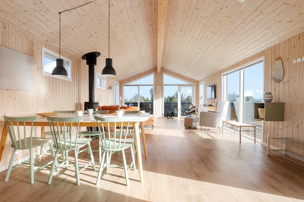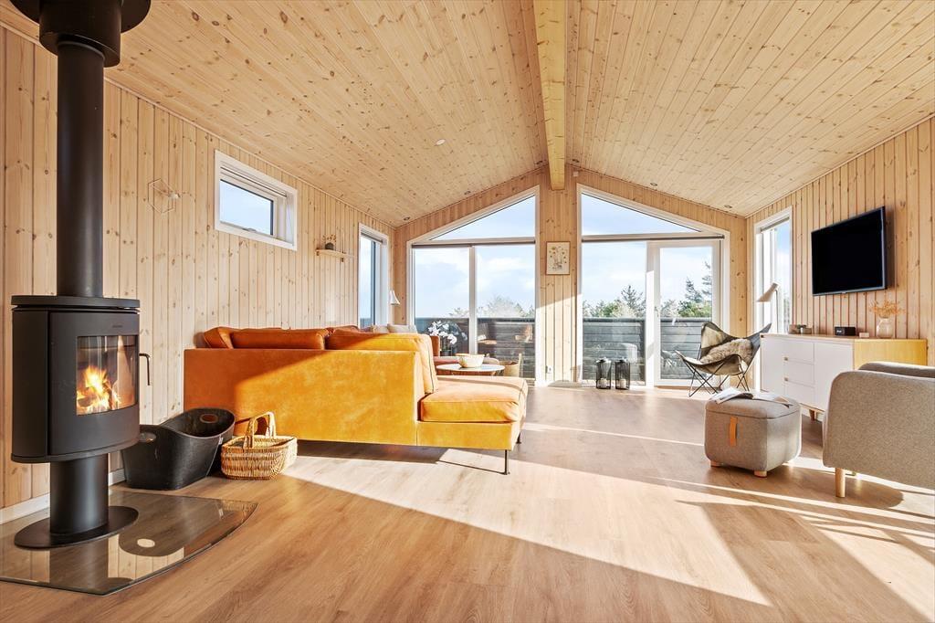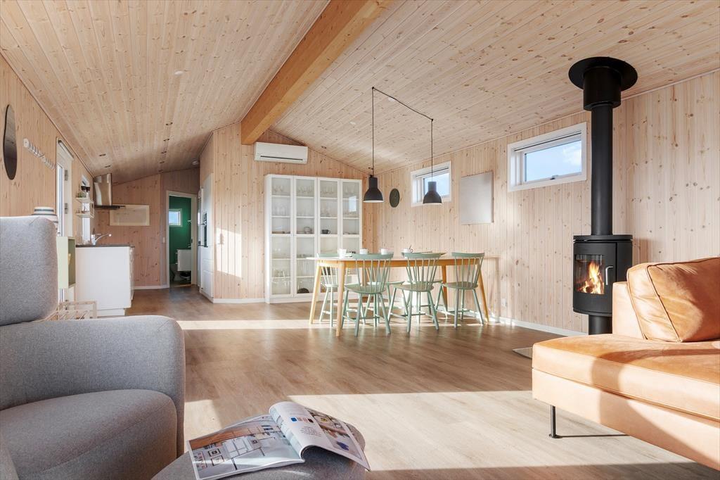 Det nybyggede sommerhus byder dig velkommen med en fantastisk lysindstrømning fra de store vinduer, der skaber en åben og imødekommende atmosfære. Huset har loft til kip, hvilket giver en luftig fornemmelse, og den åbne forbindelse mellem stue og køkken gør det nemt at nyde hinandens selskab, selv mens maden bliver tilberedt. Fra stuen kan du betragte det smukke landskab udenfor, og når mørket falder på, kan I hygge jer sammen med brændeovnen knitrende i baggrunden. Sommerhuset har tre gode soveværelser, og badeværelset er indrettet med gulvvarme, så du kan forkæle dig selv med ekstra komfort efter en dag fuld af oplevelser.