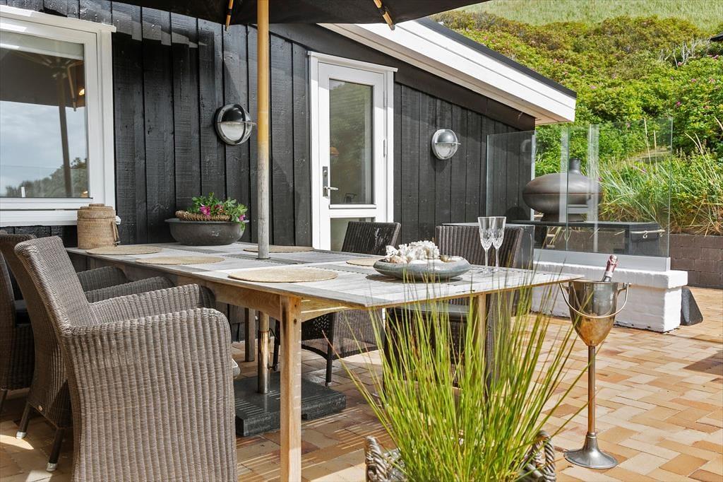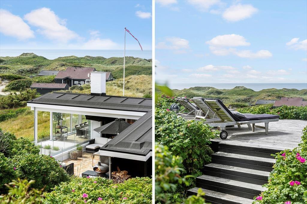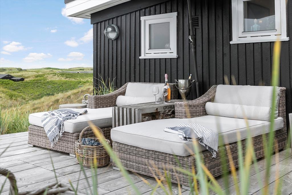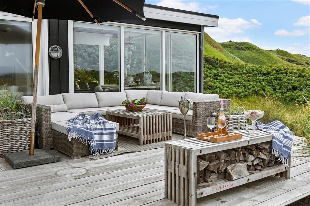 På sommerhusets store naturgrund kan du lade skuldrene sænke sig og nyde den friske havluft i fred og ro. Her venter både åbne og overdækkede terrasser, hvor du kan nyde morgenkaffen med havudsigten som bagtæppe eller finde læ for vinden med en god bog i hånden. Om aftenen kan I samles om grillen og nyde en god middag under den åbne himmel, mens solen dykker ned bag klitterne i horisonten. De kuperede omgivelser omkring Kettrup Bjerge giver oplevelsen af at være helt tæt på naturens egne former og farver – det er ikke usædvanligt at spotte harer eller fasaner på grunden, mens du nyder en stille stund på terrassen. Her er plads til både stille refleksion og fælles samvær – og lige præcis den type uforstyrrede ro, som feriedrømme er gjort af.