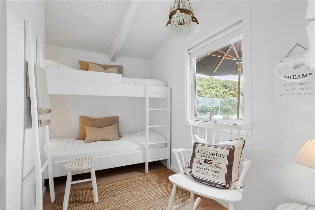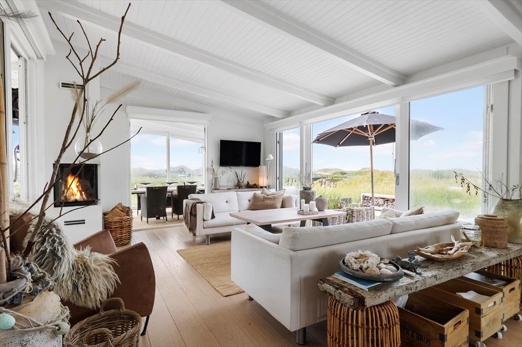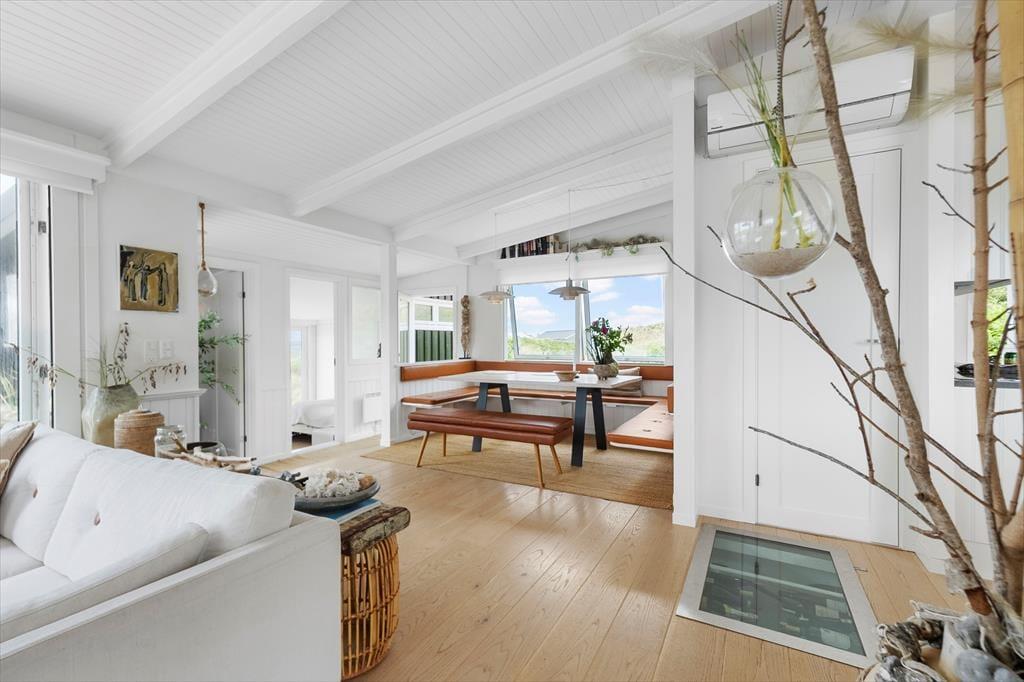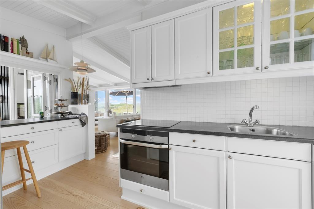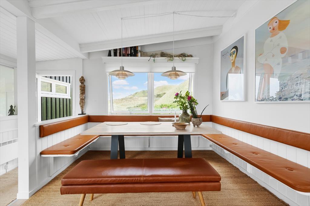 Sommerhuset byder på en indretning, der emmer af personlighed og varme. Her er det let at føle sig hjemme, uanset om det er første gang, du træder ind ad døren. Det åbne køkkenalrum skaber en naturlig ramme om det gode ferieliv, hvor madlavning og hyggesnak kan gå hånd i hånd. Store vinduespartier inviterer dagslyset indenfor og giver frit udsyn til de skiftende nuancer på himlen over havet. I stuen står pejsen klar til at sprede varme og stemning, når dagens udflugter er forbi og benene skal hviles i sofaen. Planløsningen rummer tre gode soveværelser og to badeværelser med bad og toilet, så her er god plads og komfort til både børnefamilier og flere par, der rejser sammen. Indretningen er lys og venlig med sans for detaljerne – og stemningen i huset er lige så rolig og afslappet som de naturskønne omgivelser udenfor.