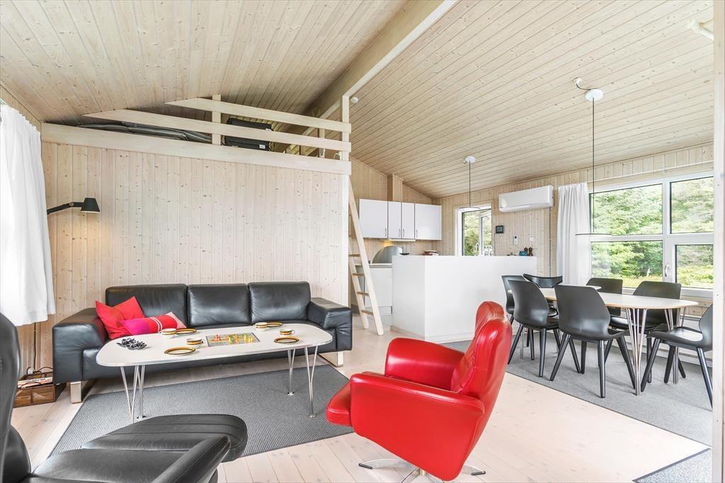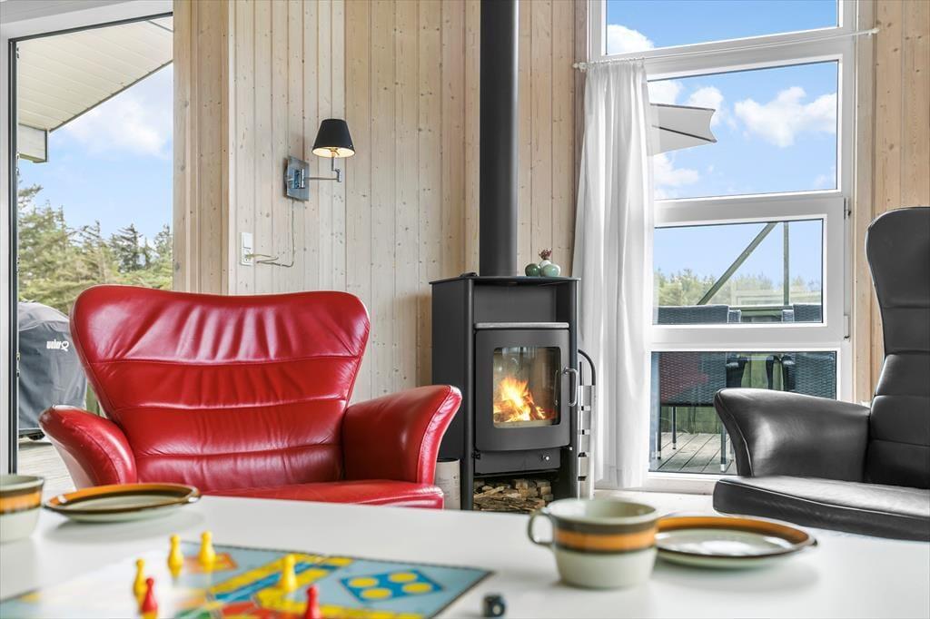 Sommerhuset er bygget i 2003 og er flot og velholdt. Store vinduer lukker lyset og den omkringliggende natur helt ind i rummet. Fra stuen er der direkte adgang til den skønne terrasse mod syd. Om aftenen kan I nyde den gode udsigt over naturen med syngende flammer i brændeovnen til at holde den gode stemning af sommerhusferie helt i top. Sommerhuset har to soveværelser, et med dobbeltseng og et med to køjesenge. Overfor soveværelserne ligger sommerhusets badeværelse med toilet og bruser. Sommerhuset er et perfekt valg for en hyggelig ferie for to personer såvel som for den lille familie.