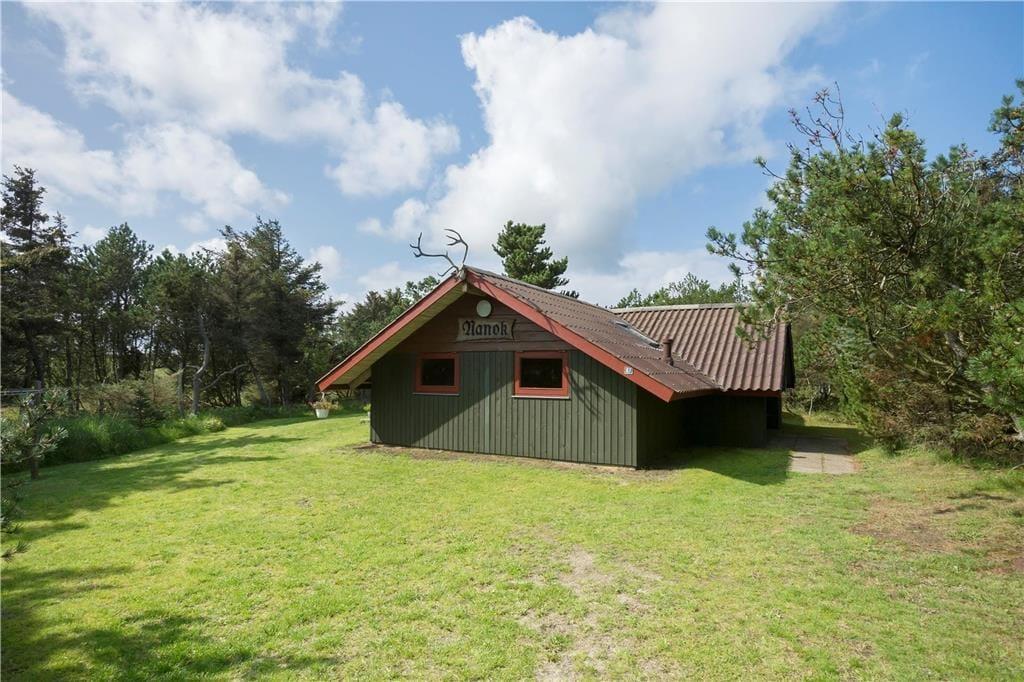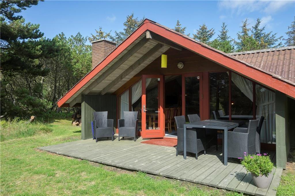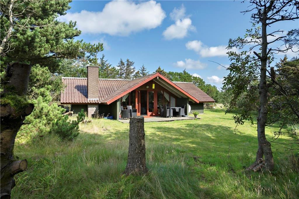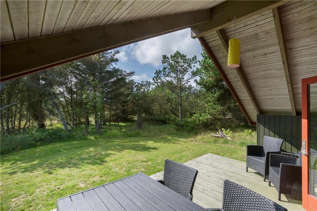 Huset ligger i et sommerhusområde tæt ved klitterne og omgivet af store grantræer, hvilket giver god læ for vind og vejr. Der er terrasser på begge sidder af huset, så der er mulighed for at tilbringe mange timer udendørs.